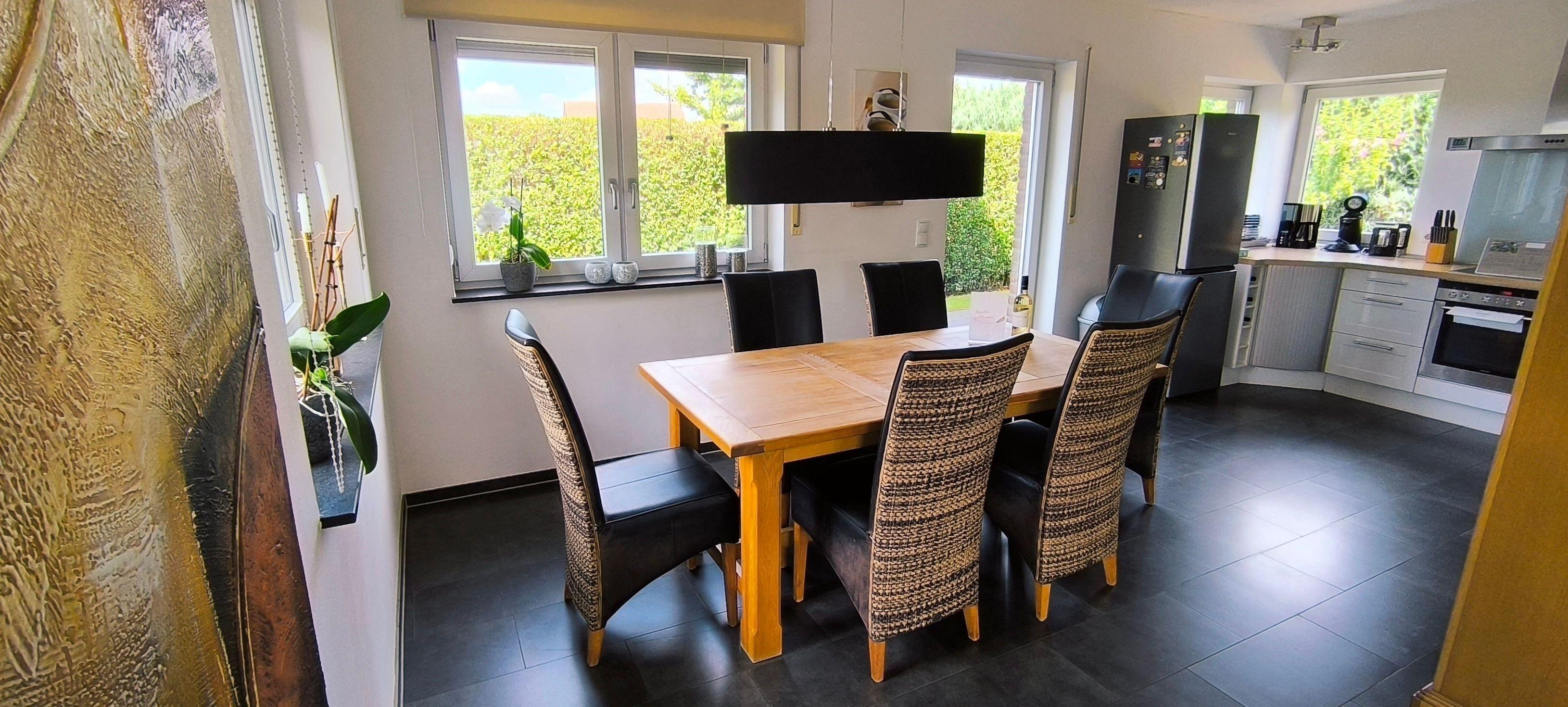 Küchentisch, über 2 Elemente verlängerbar, 6 Stühle (2 Zustellstühle im Waschraum)