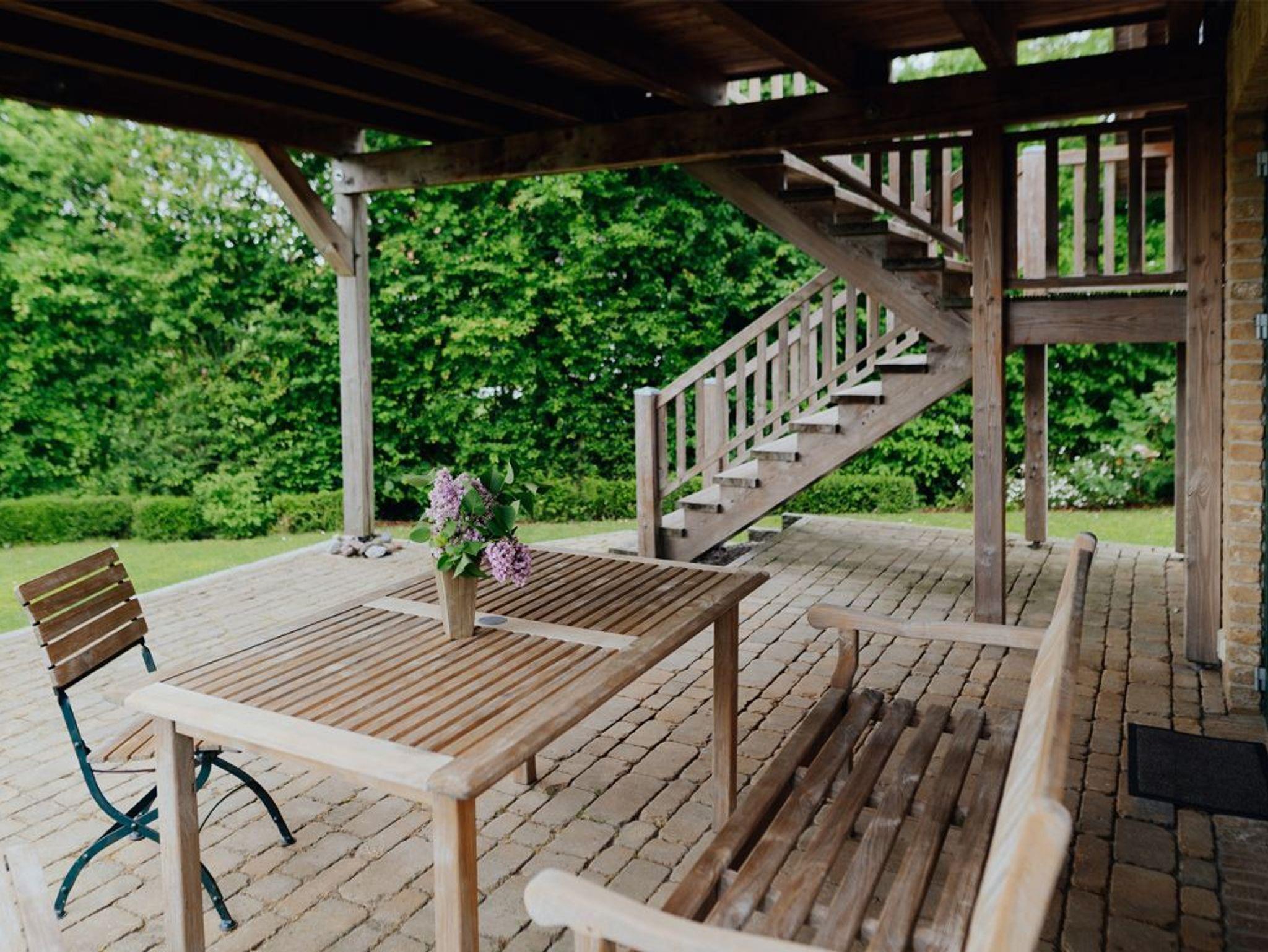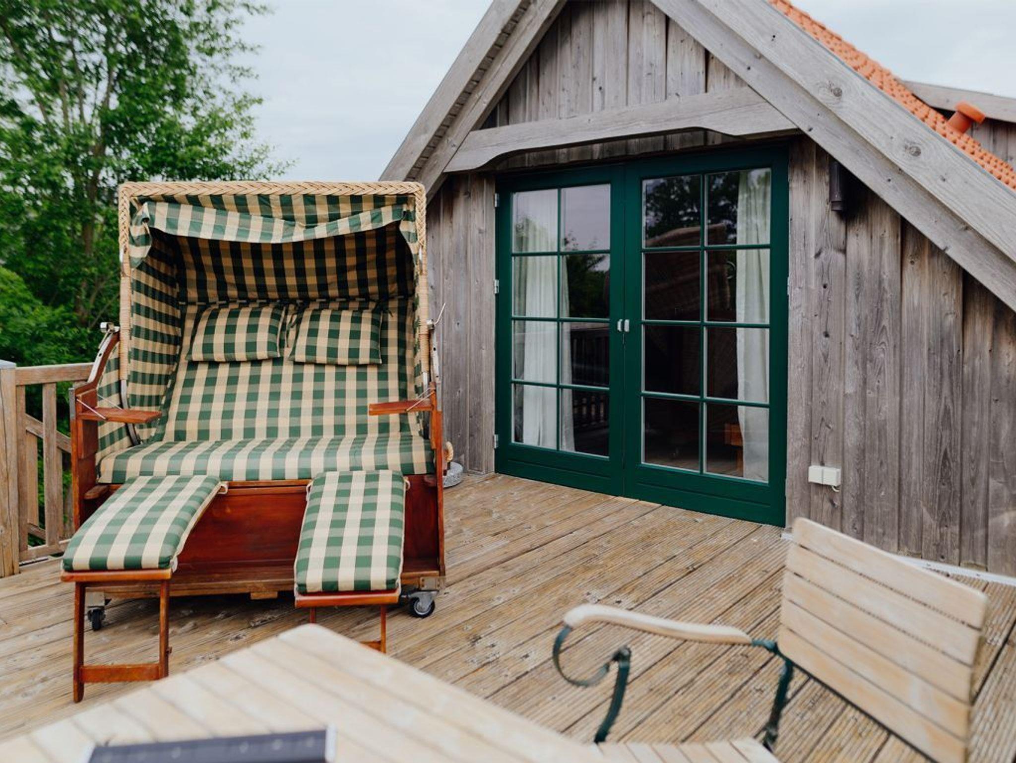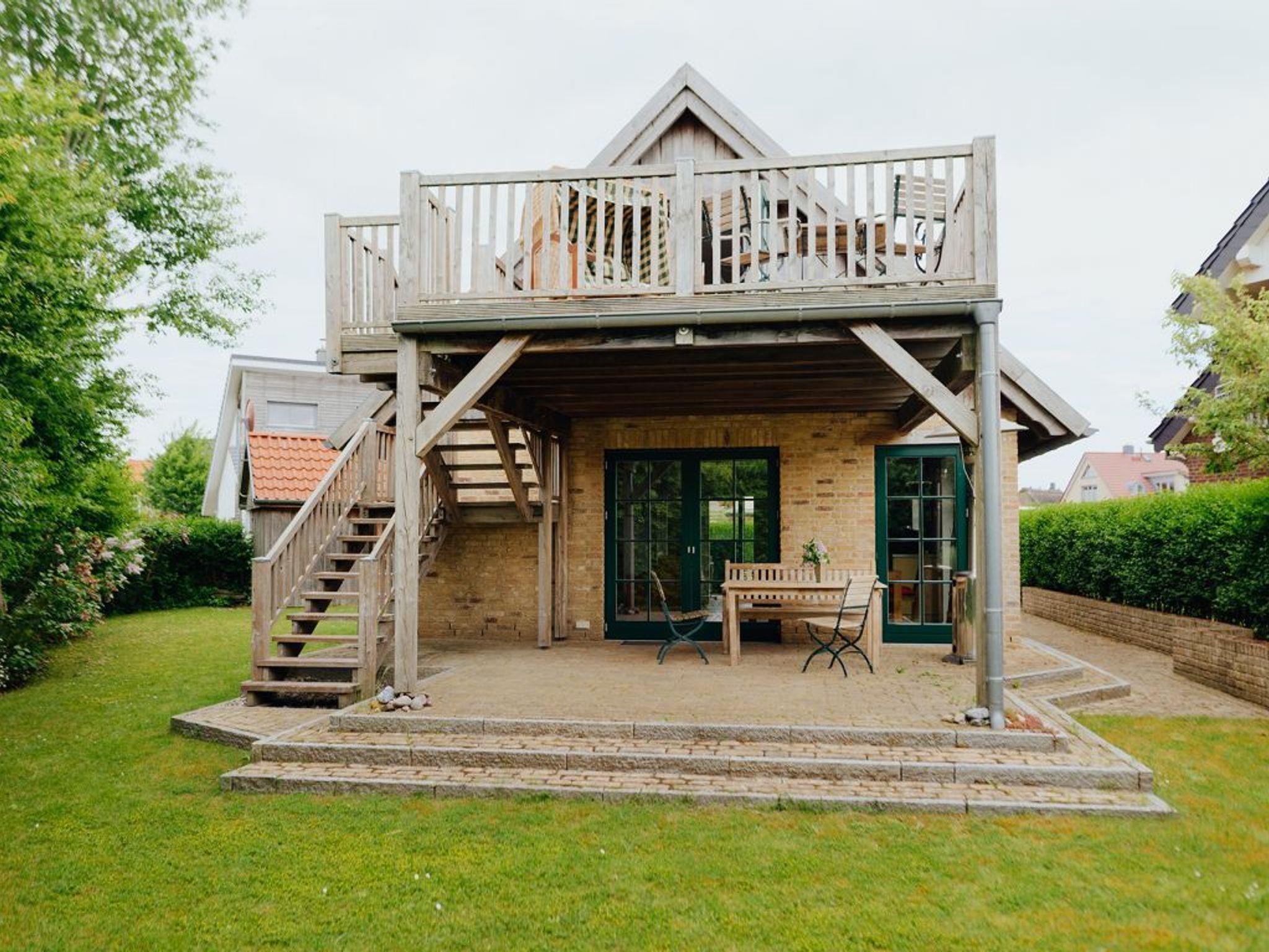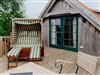 Eine Treppe führt in das Obergeschoss, wo sich drei Schlafzimmer 2x mit Doppelbett, 1x mit zwei Einzelbetten, 1x mit Fernseher befinden. Eines der Schlafzimmer ist mit Balkonzugang und Strandkorb und eine Treppe führt vom Balkon in den Garten. Ebenso ist im Obergeschoss ein hochwertiges Tageslicht Vollbad mit Badewanne und Dusche vorhanden. Im Garten können Sie mitgebrachte Fahrräder im Fahrradschuppen unterstellen.