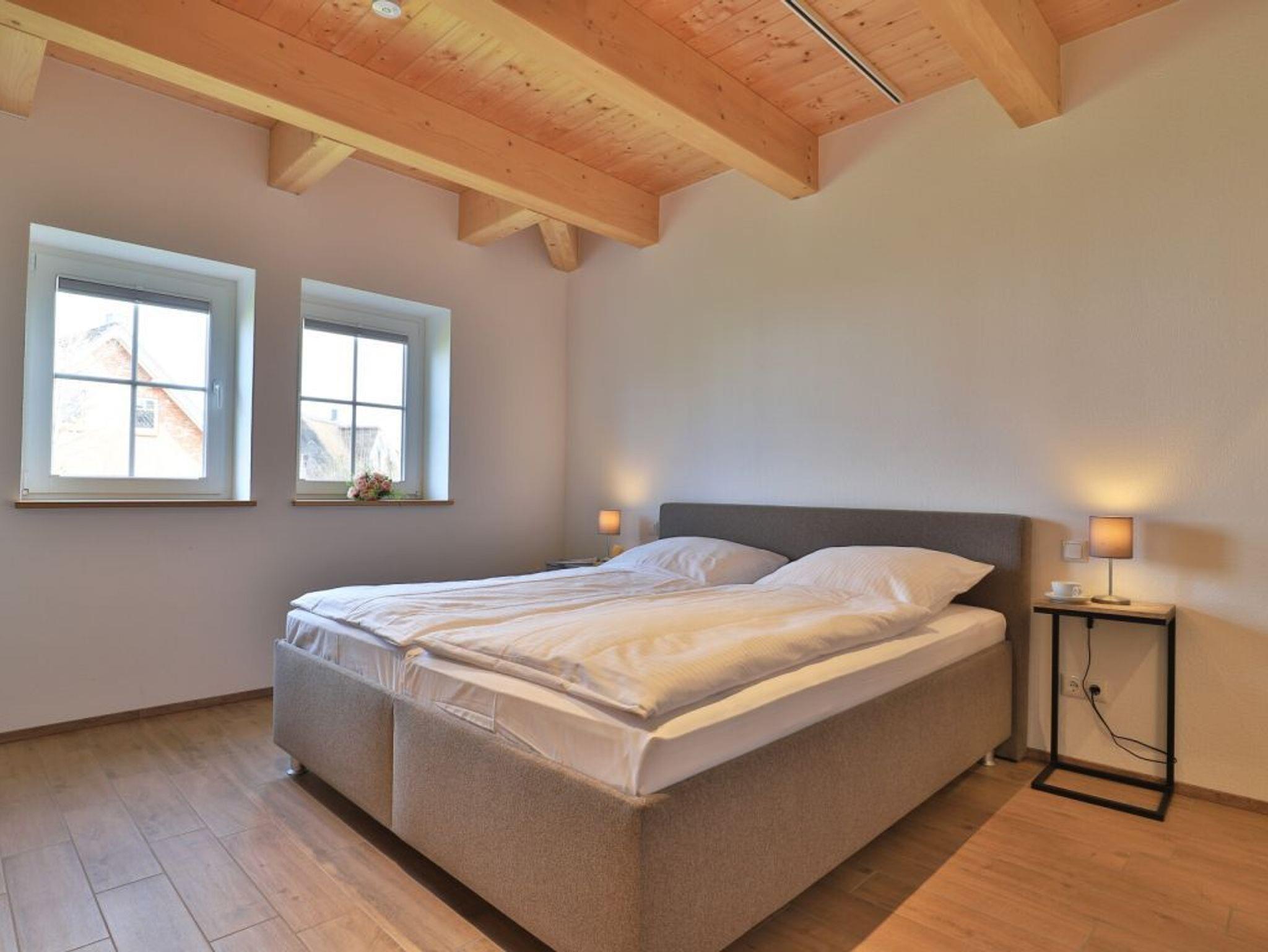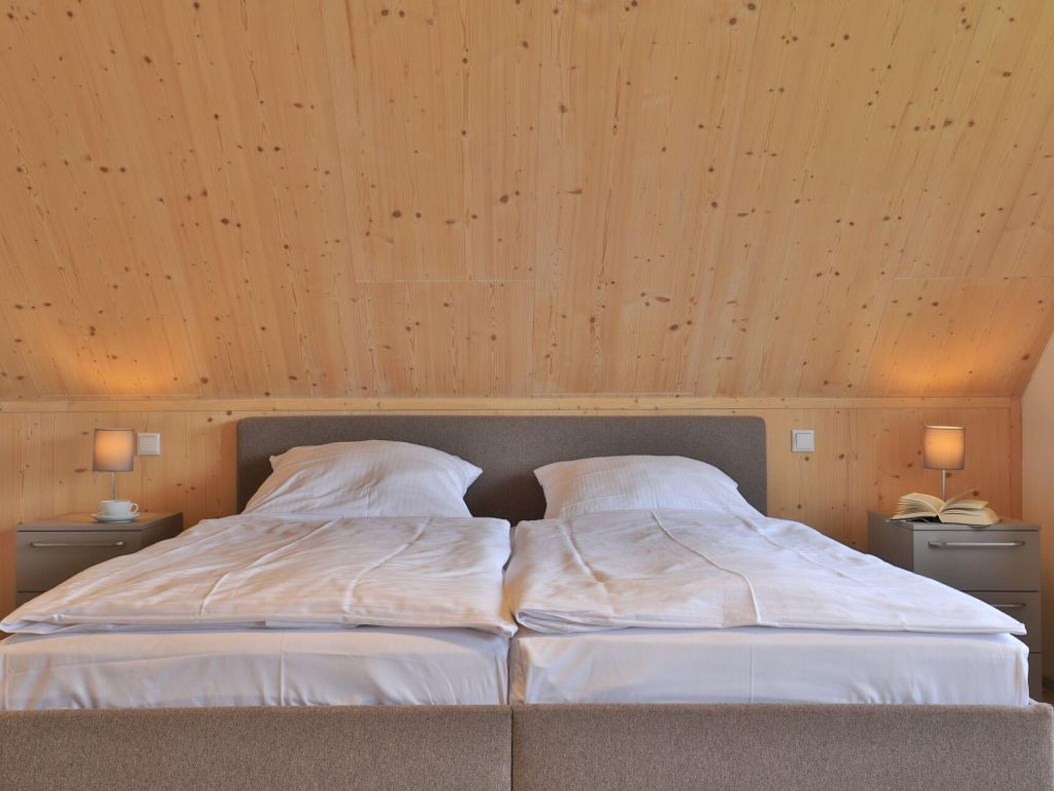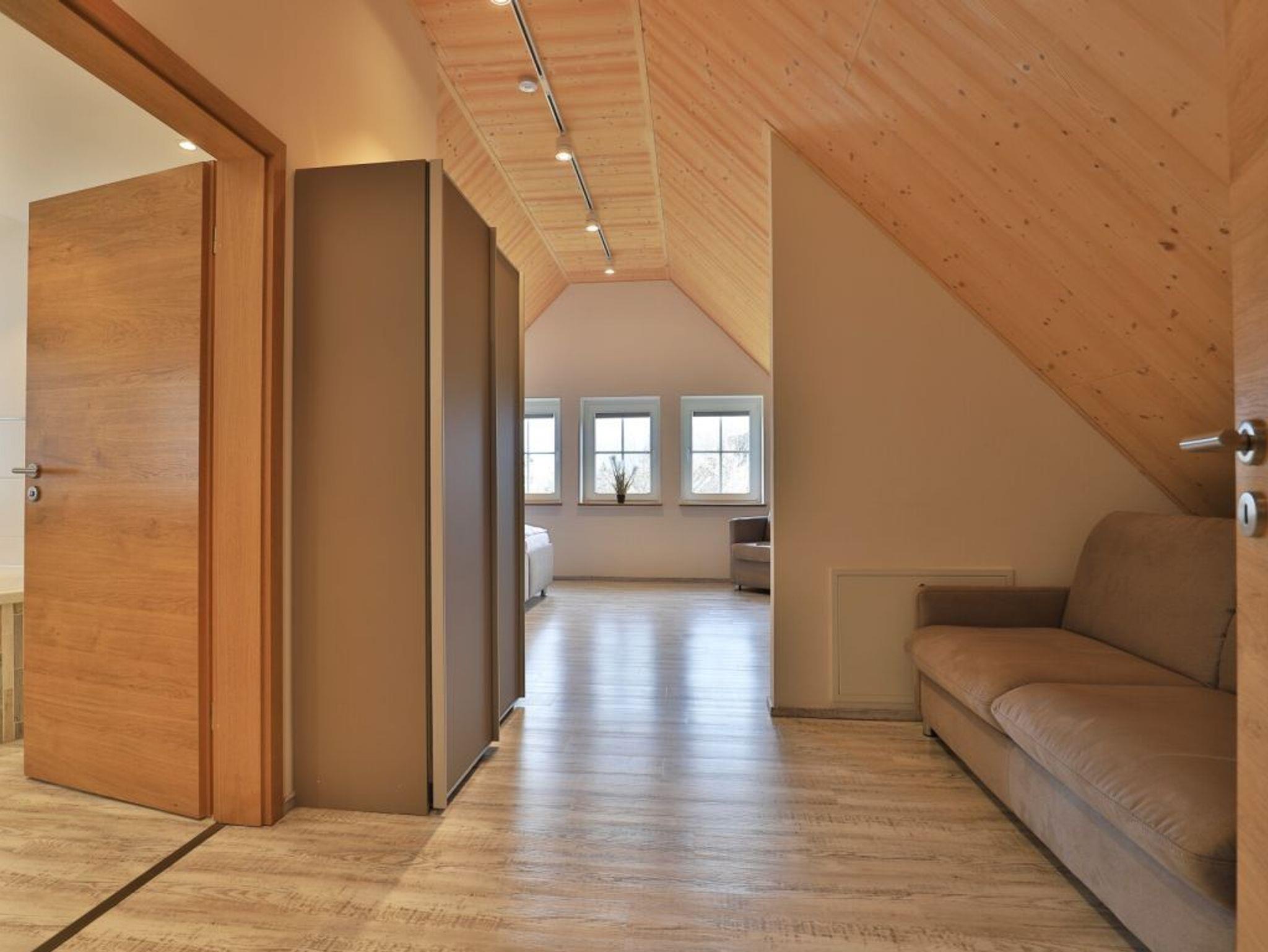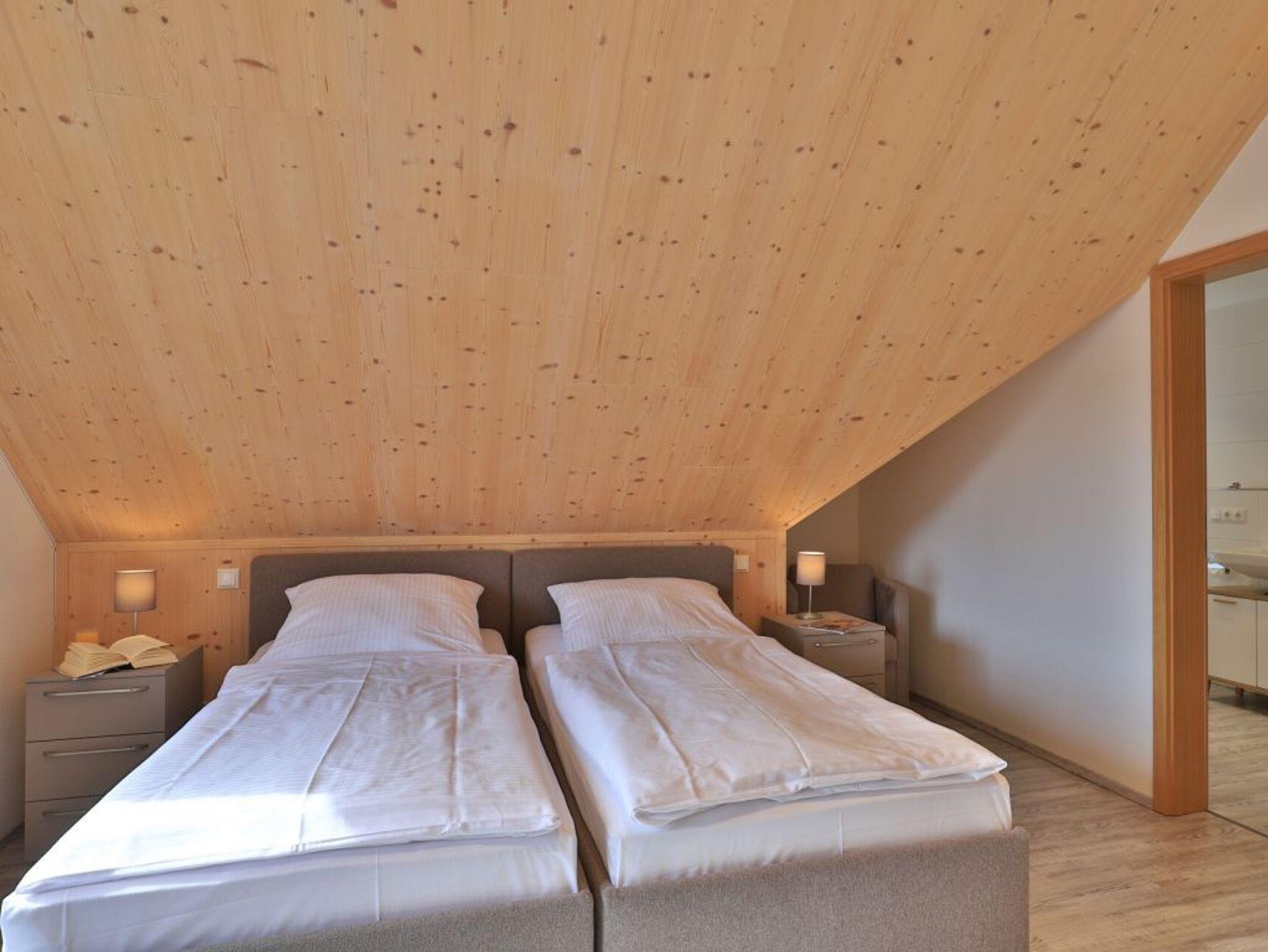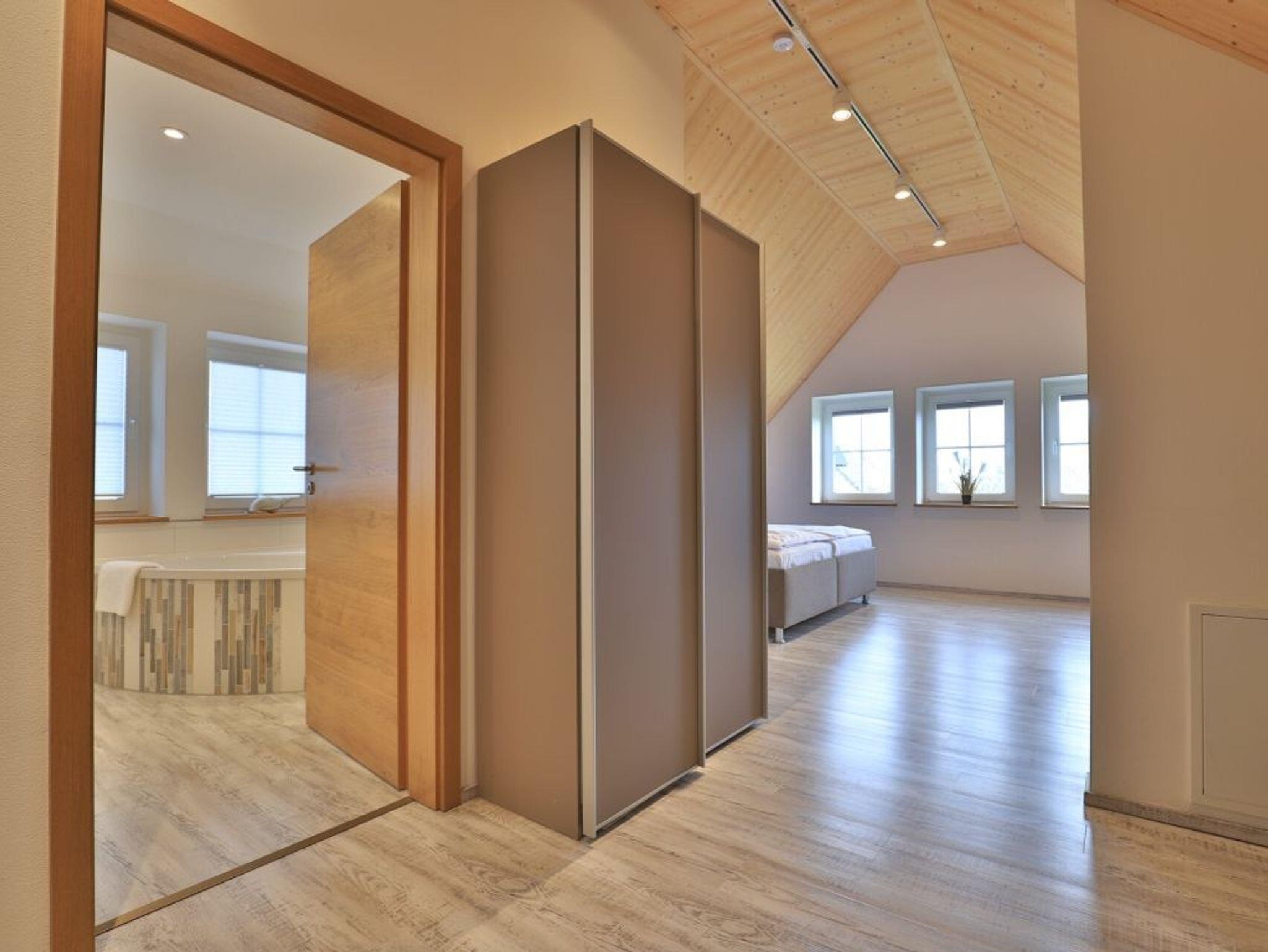 Eine Treppe führt in das Obergeschoss, wo sich zwei weitere Schlafzimmer mit zwei eigenen Bädern befinden. Eines der Schlafbereiche besitzt ein Doppelbett, Fernseher, Duschbad mit Waschtisch, WC. Das weitere, sehr geräumige Familienschlafzimmer bietet ein Doppelbett, ein Schlafsofa ideal für Kinder (160cm x 200cm) und ist zudem mit einem modernen Tageslicht Badezimmer mit Eckbadewanne, Dusche, Waschtisch und WC ausgestattet.