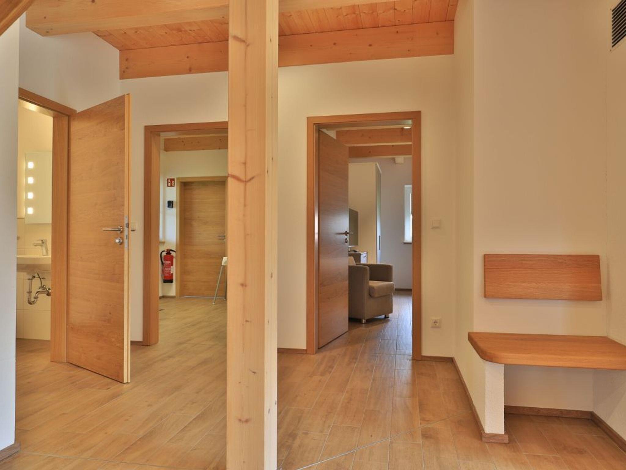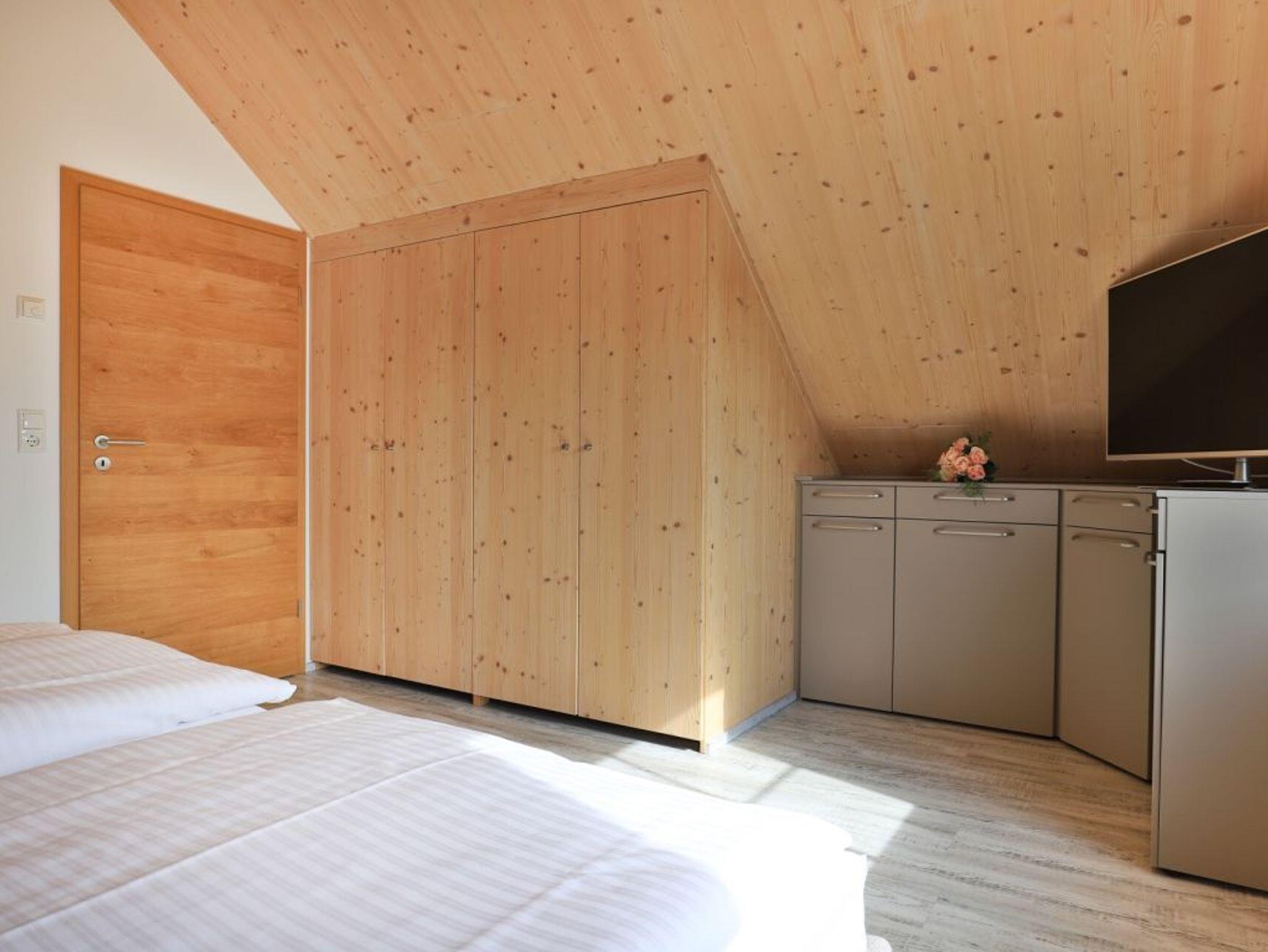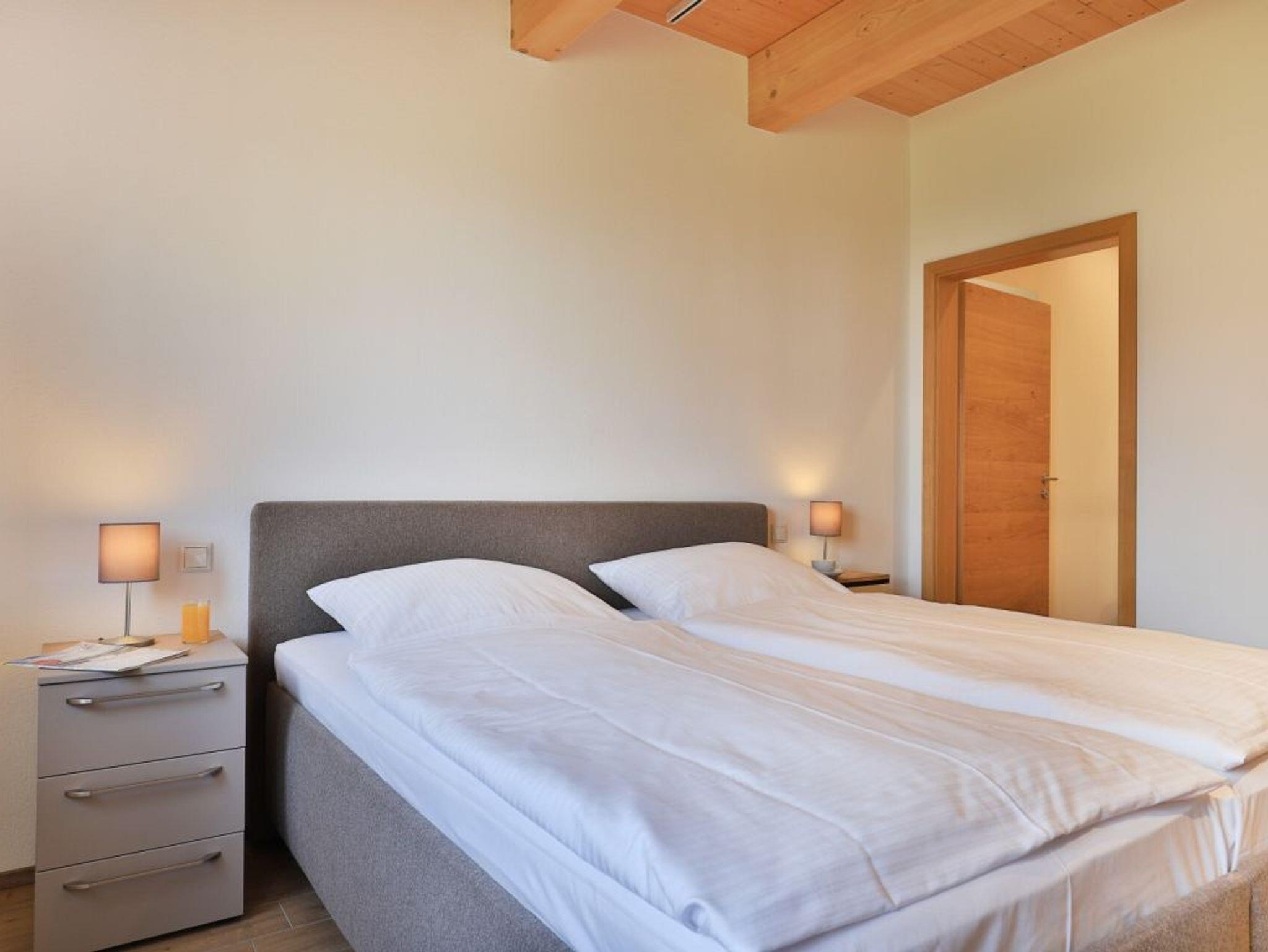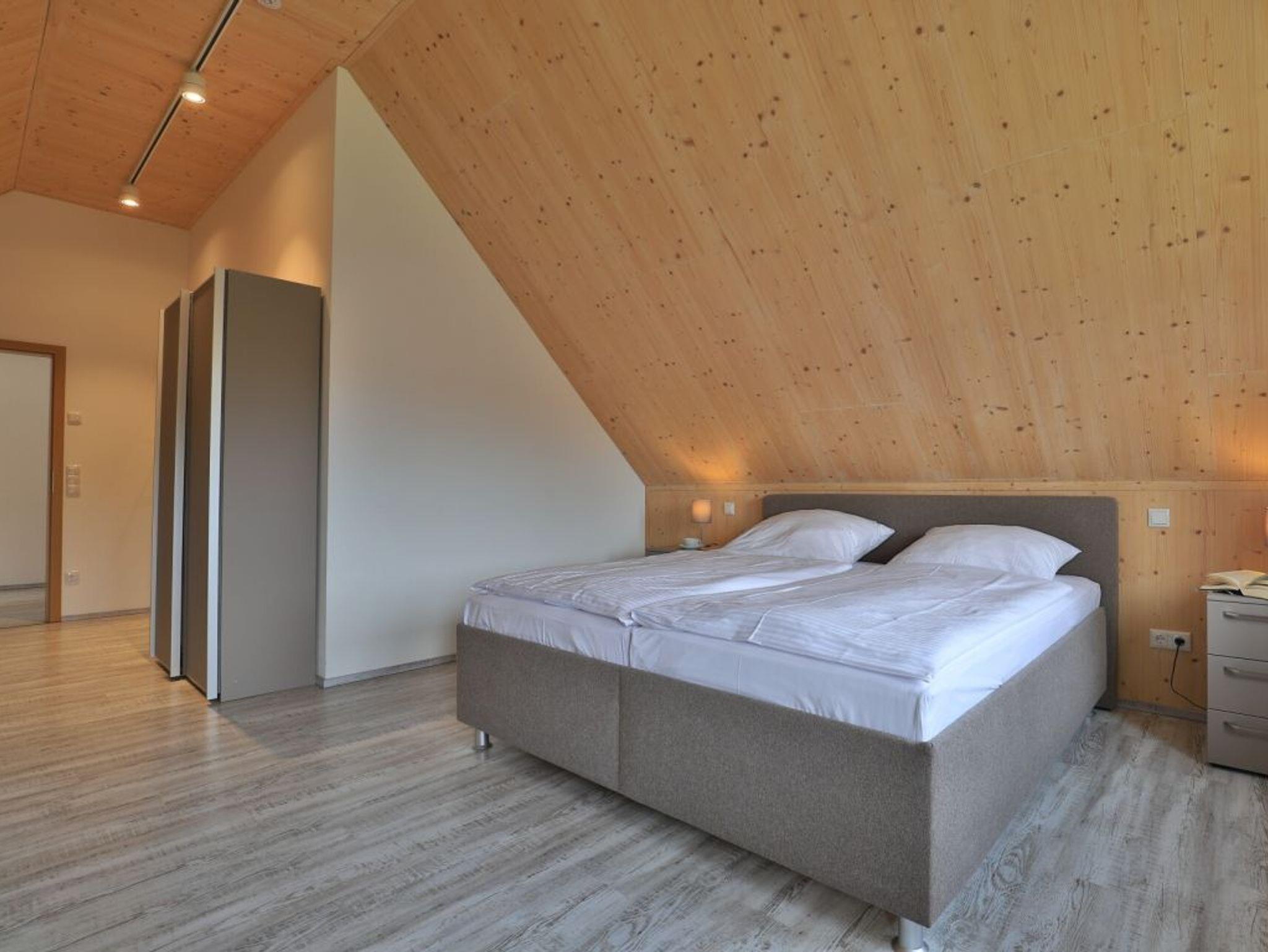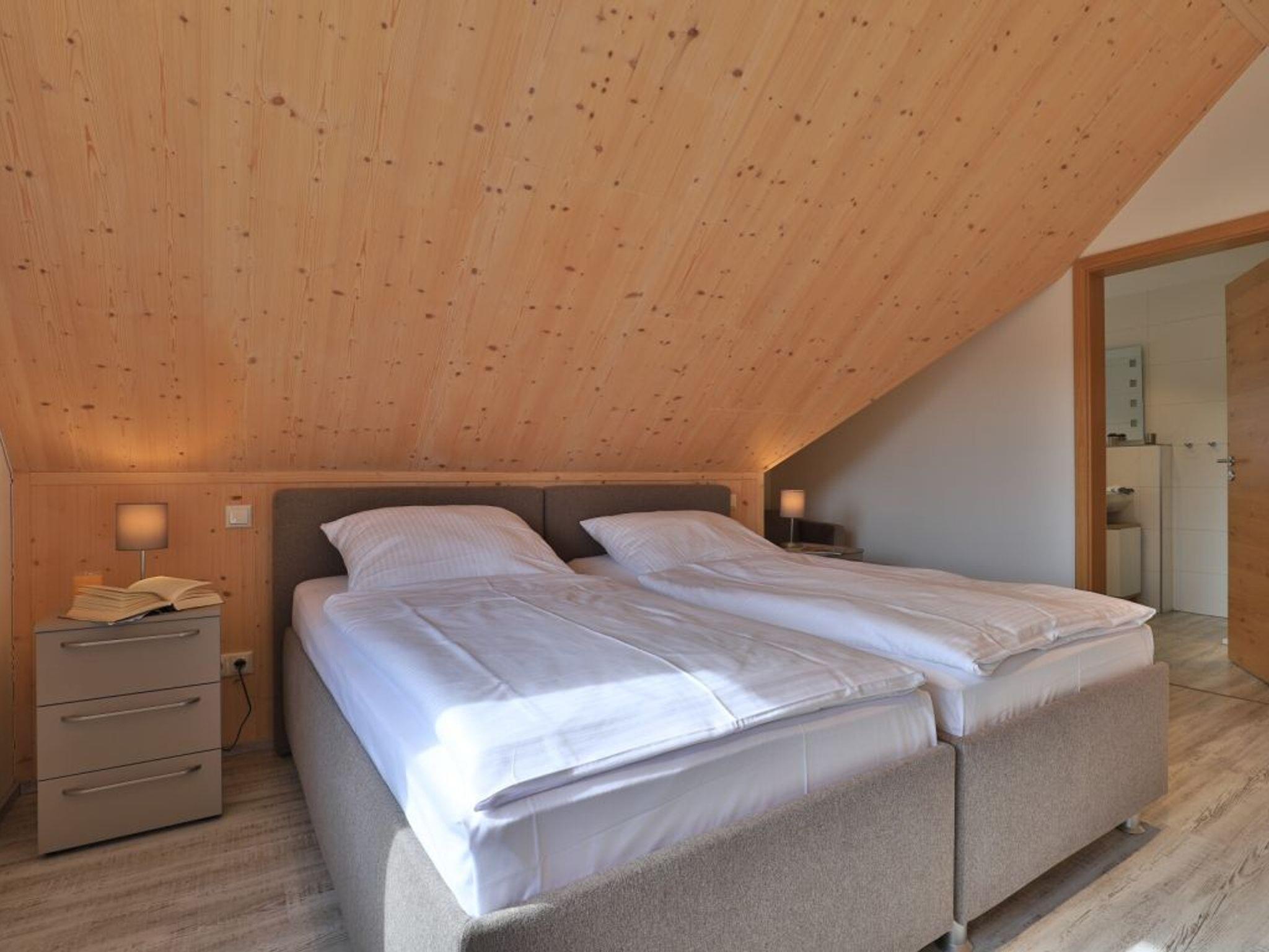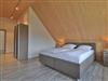 Eine Treppe führt in das Obergeschoss, wo sich zwei weitere Schlafzimmer mit zwei eigenen Bädern befinden. Eines der Schlafbereiche besitzt ein Doppelbett, Fernseher, Duschbad mit Waschtisch, WC. Das weitere, sehr geräumige Familienschlafzimmer bietet ein Doppelbett, ein Schlafsofa ideal für Kinder (160cm x 200cm) und ist zudem mit einem modernen Tageslicht Badezimmer mit Eckbadewanne, Dusche, Waschtisch und WC ausgestattet.
