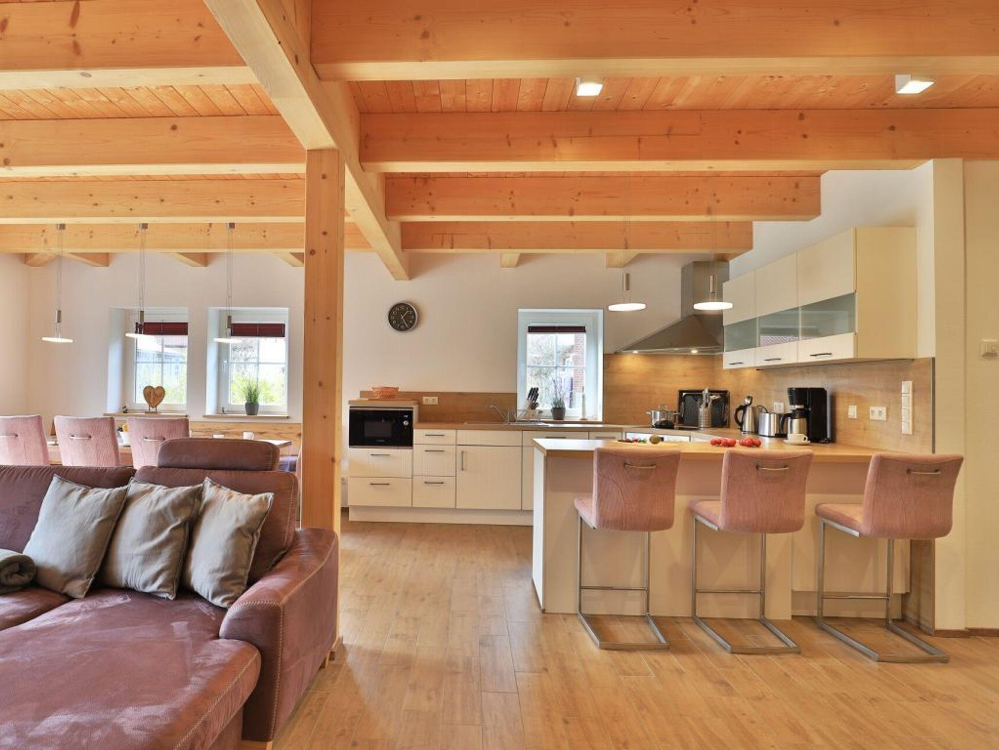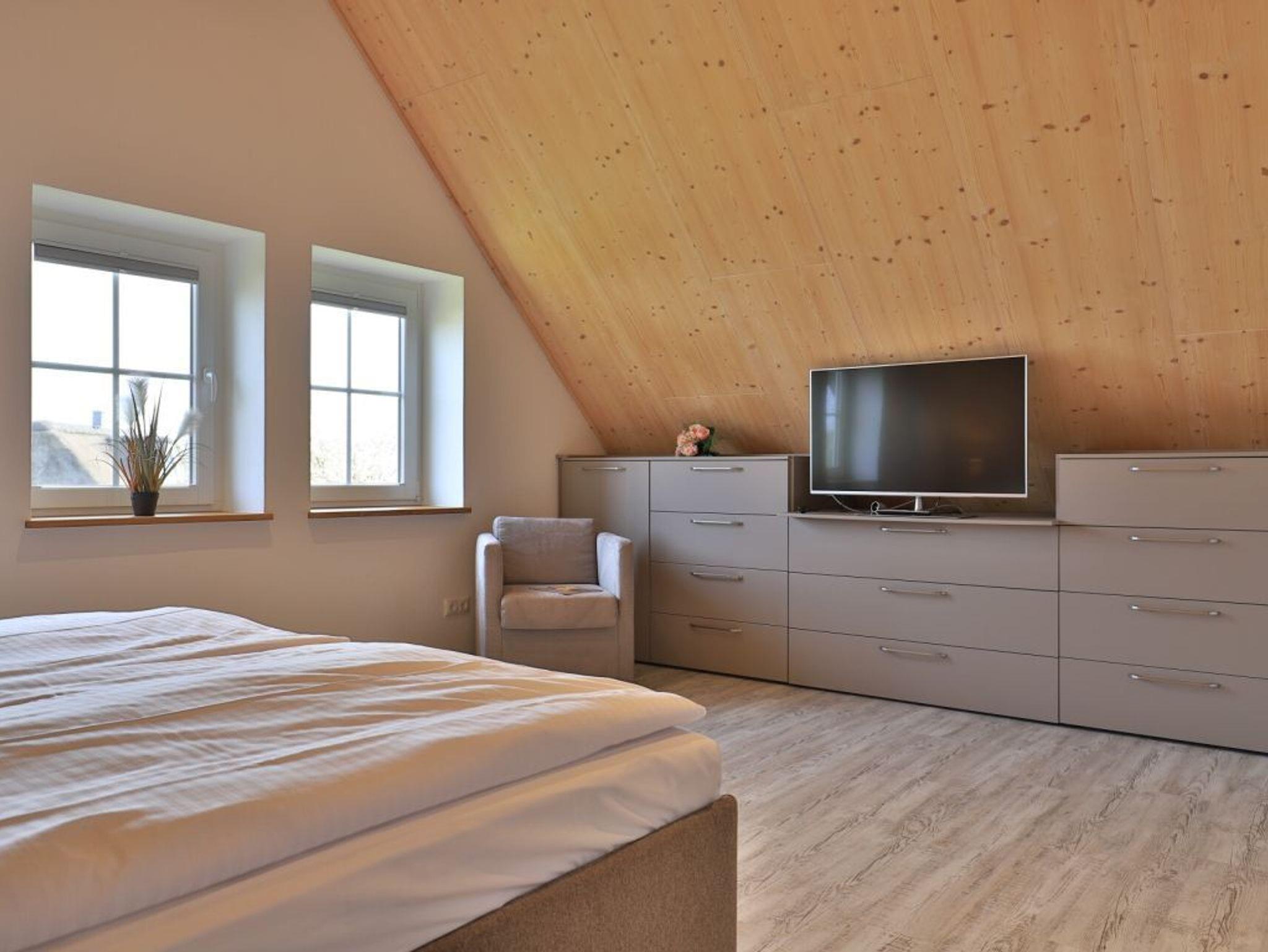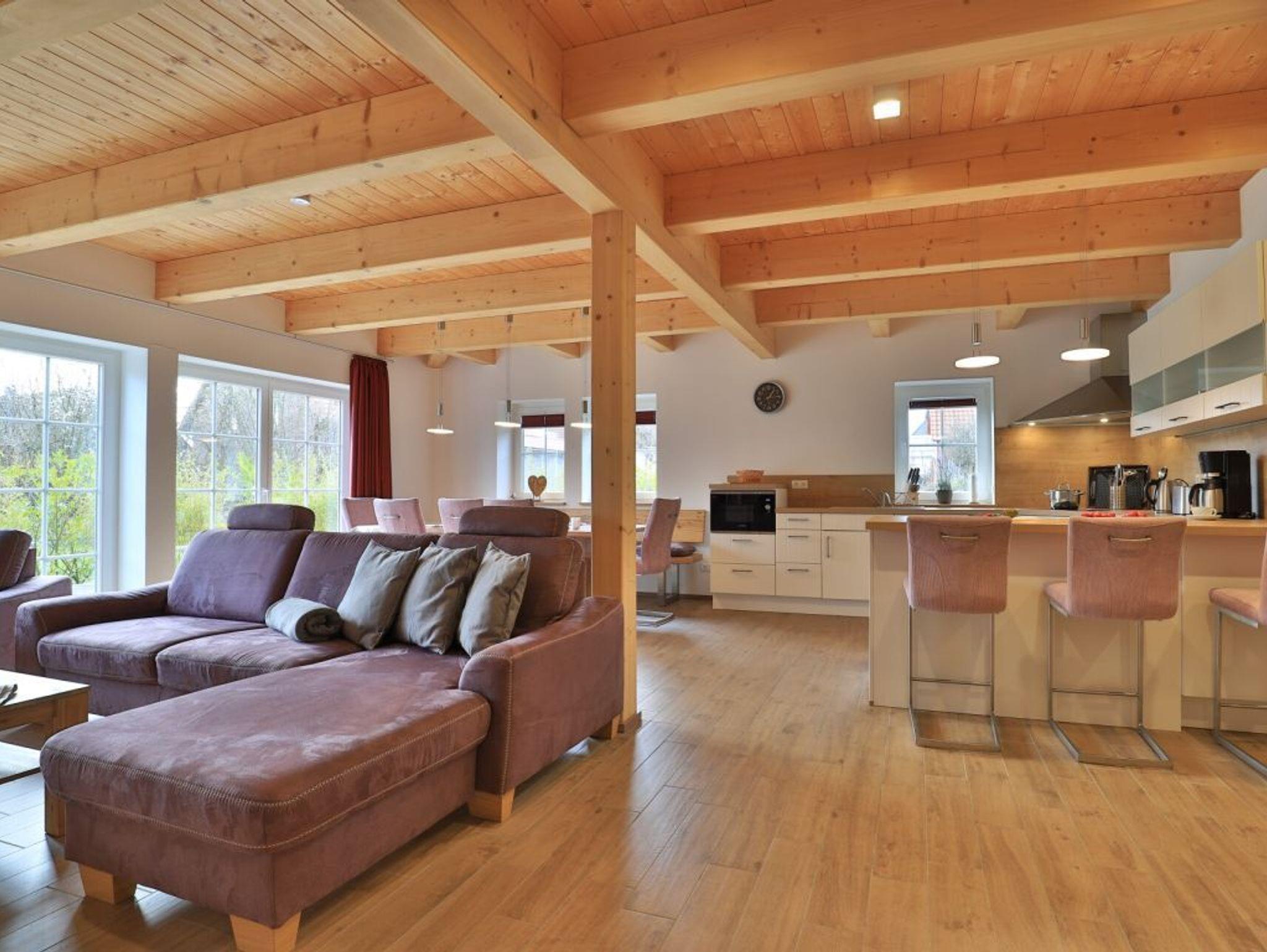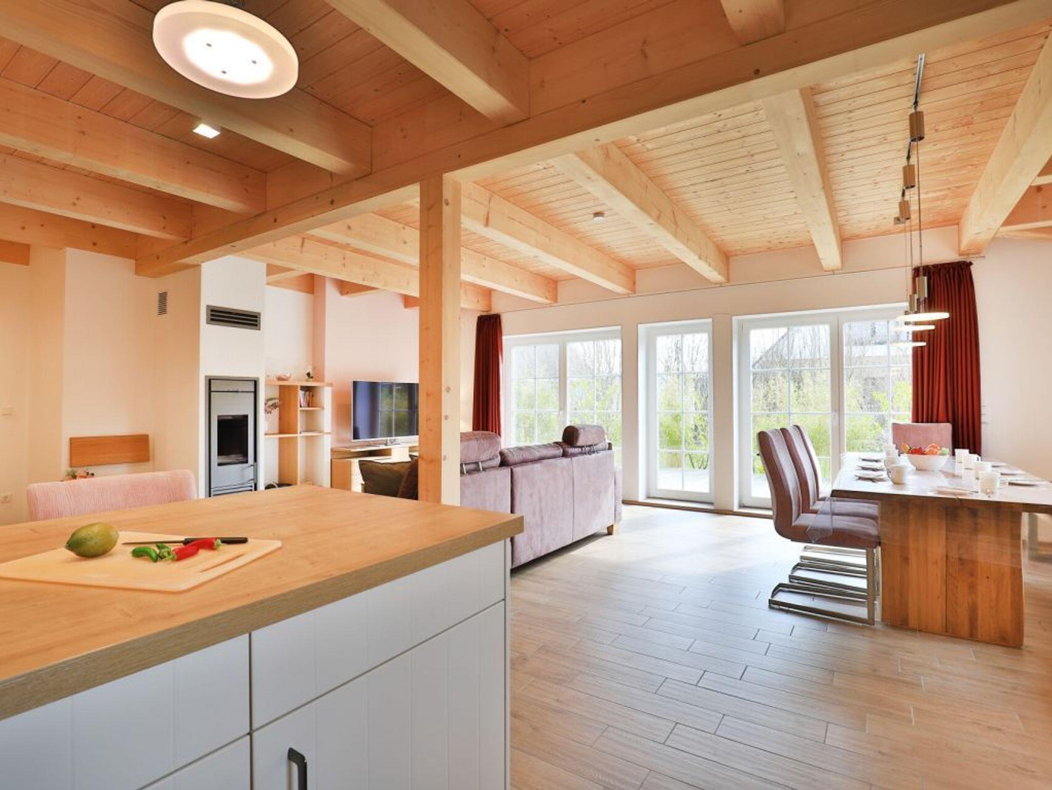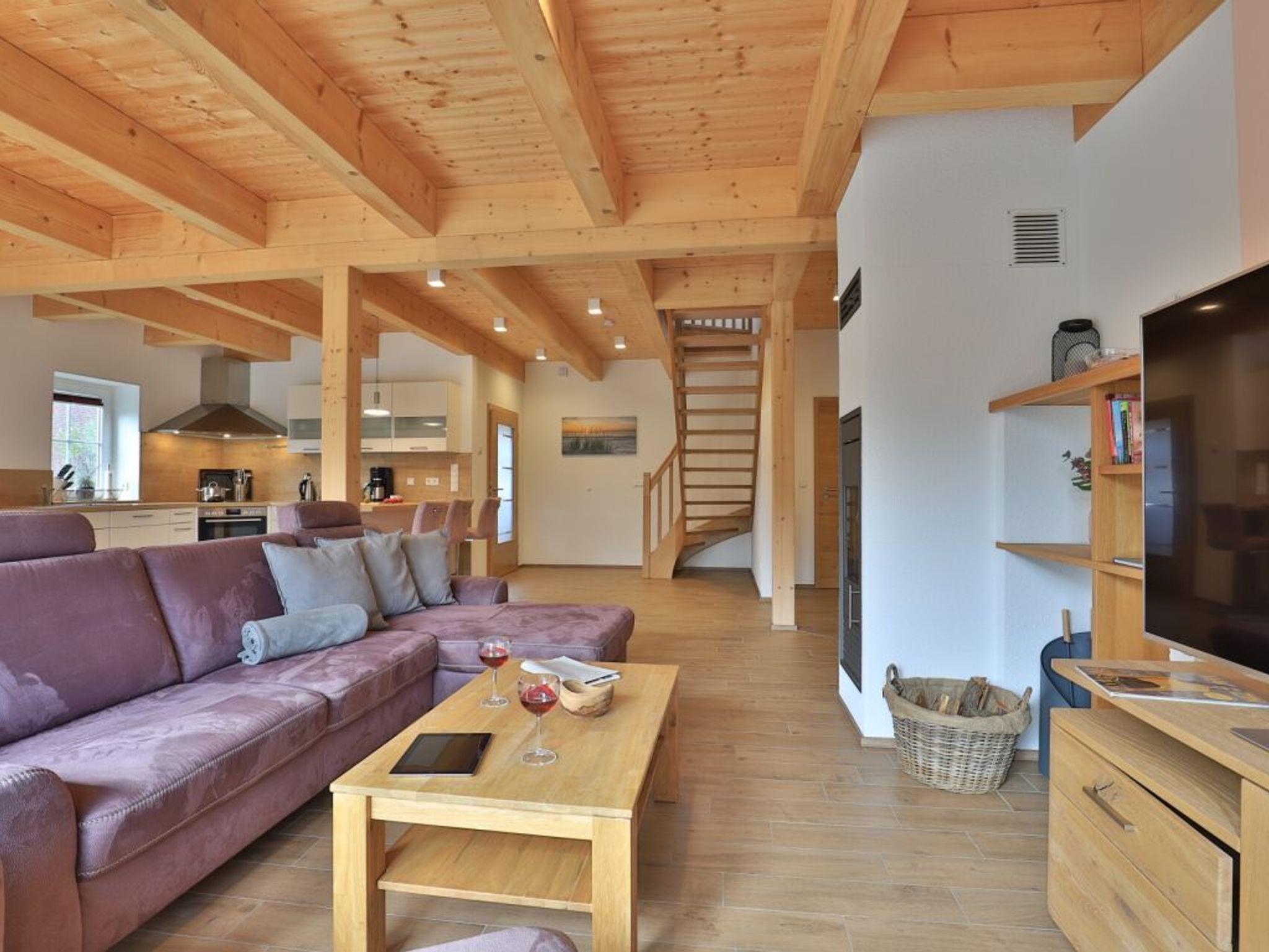 Die Möblierung im Erdgeschossbereich ist stilvoll. Eine Sofalandschaft lädt zur Auszeit am wohligen Kaminofen ein. Fernseher, Musikanlage und auch kostenfreie WLAN-Nutzung sind vorhanden. Vom Wohnbereich gelangen Sie eine saisonal möblierte Terrasse in nord-/ost Ausrichtung. Der große Garten ist ideal für Kinder und bietet zudem eine Grillmöglichkeit. Die offene Küche ist in den Wohnbereich integriert und verfügt über ein Induktionskochfeld, Backofen, Mikrowelle, Kühlschrank, Gefrierschrank, Kaffeemaschine, Toaster, Wasserkocher, Geschirrspüler u.v.m. Ihre zubereiteten Mahlzeiten nehmen Sie an einem großen Esstisch zu sich. Bei schönem Wetter, bestimmt auch gerne auf der Terrasse mit Blick in den Garten. Eines der separaten Komfort- Schlafzimmer befindet sich auf der Wohnebene. Dieses Schlafzimmer ist mit einem Doppelbett, TV und einem eigenen Bad mit ebenerdiger Dusche ausgestattet. Auch ein Hauswirtschaftsraum mit kostenfreier Waschmaschine & Wäschetrocknernutzung sowie ein Gäste-WC sind im Erdgeschoss vorhanden.