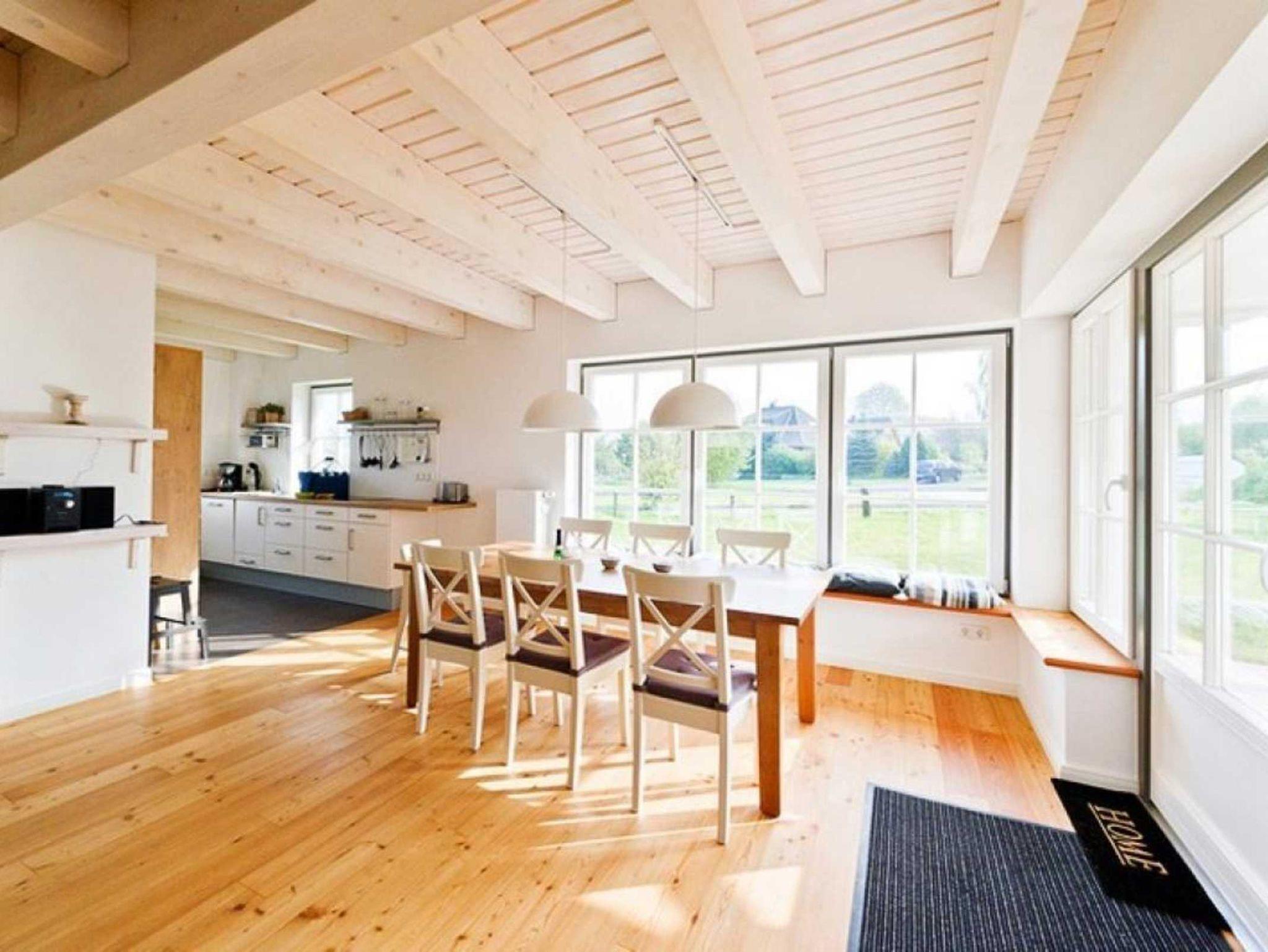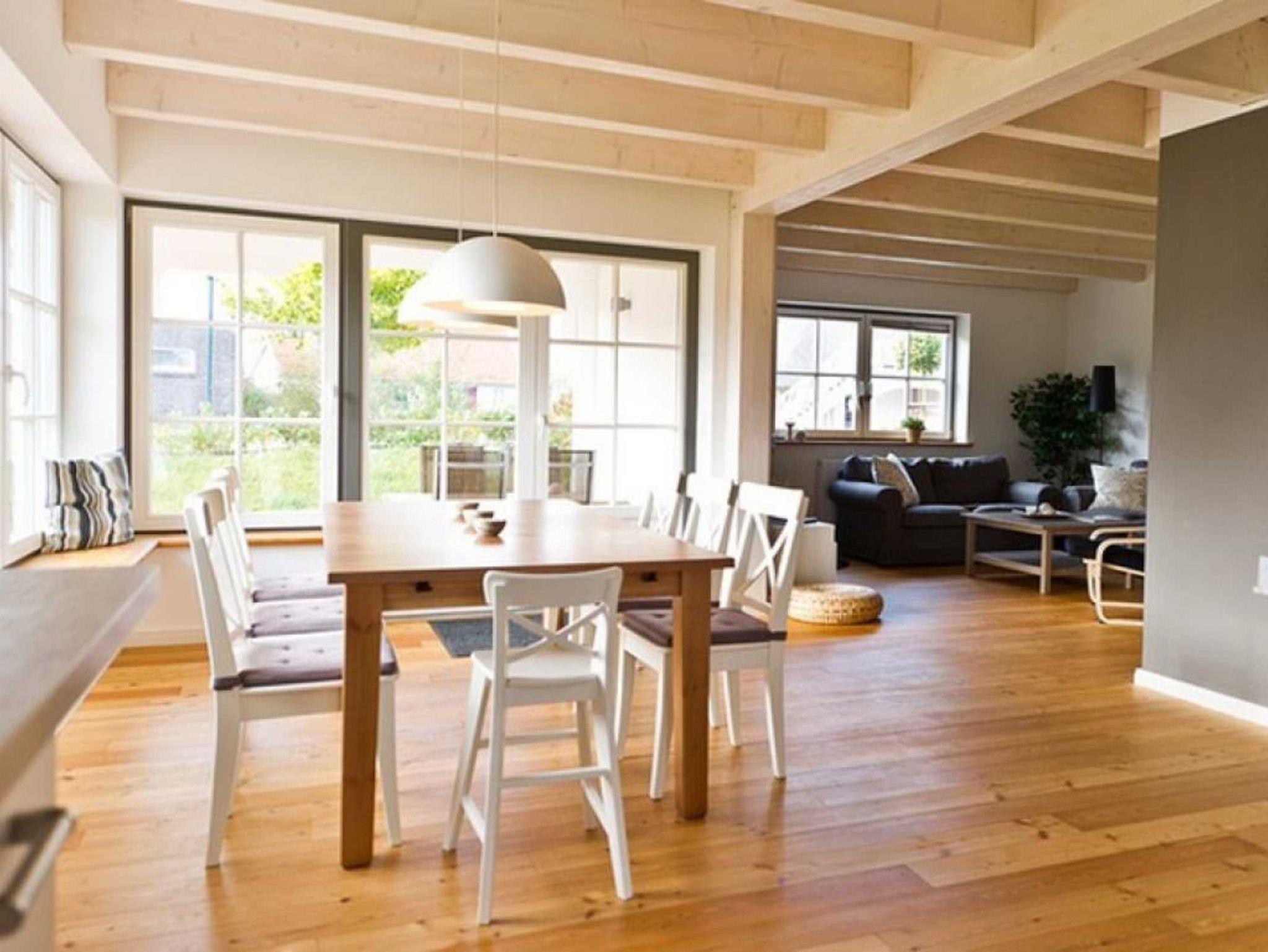 Unter ökologischer Bauweise wurde das Ferienhaus ?Ruhe Insel? mit natürlichen Materialien errichtet. Nachhaltig, energiesparend wirken sich auch die Solar Module des Daches aus. Das großzügige Urlaubsdomizil mit einer Wohnfläche von 120qm und vier separaten Schlafzimmern ist nahezu perfekt für befreundete Familien oder Eltern-Kind-Großeltern Urlaub. Sobald Sie das Haus mit dem schick eingerichteten und geräumigen Wohn-/Essraum betreten beginnt die Erholung. Die bequeme Sofalandschaft ist ebenso einladend, wie die integrierte Küche mit großem Esstisch für bis zu 6 Personen. Gemütliche Abende verbringen die Urlauber während der Sommermonate auf der großen Terrasse, vor dem Kaminofen im Wohnbereich, oder dem großen Smart- TV (50 Zoll) mit DVD- Player. Auch eine Musikanlage sorgt für Unterhaltung. Die integrierte Küche ist bestens ausgestattet mit Geschirrspüler, Ceranfeldherd, Backofen, Mikrowelle sowie ausreichend Geschirr und Besteck. Das Traumhaus eignet sich auch für längere Aufenthalte, da hier kostenfreies WLAN, Waschmaschine, Wäschetrockner, Bügeleisen und Bügelbrett selbstverständlich sind. Im Erdgeschoss befindet sich ein Wellness-Duschbad, indem eine Ecksauna für drei Personen vorhanden ist. 4 separate Schlafzimmer sind im Obergeschoss und jedes lässt sich über Verdunkelungsrollos abdunkeln und ist zudem mit Insektenschutz ausgestattet. Eines der Schlafzimmer ist mit 2 Einzelbetten ausgestattet, zwei weitere mit jeweils einem Einzelbett. Das vierte Schlafzimmer bietet ein Doppelbett. Zudem ist ein Vollbad im oberen Geschoss vorhanden. Beide Bäder mit Fußbodenheizung.