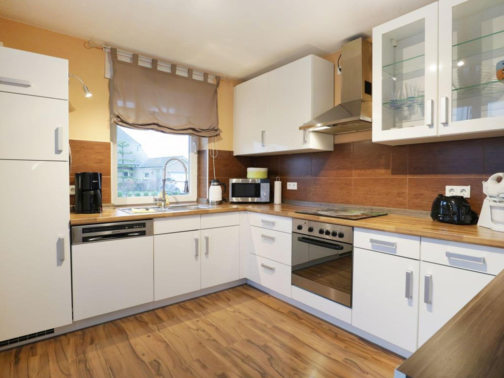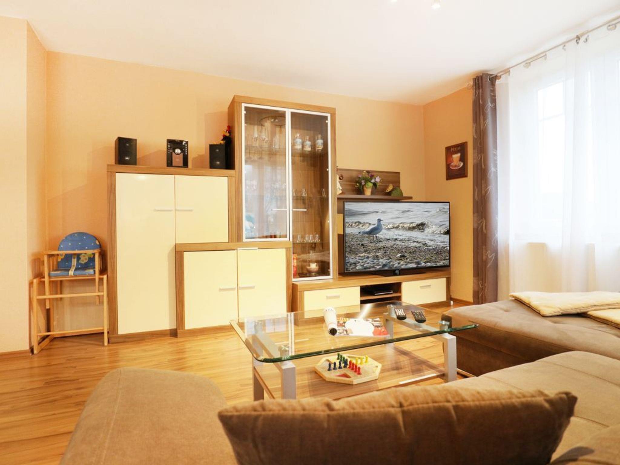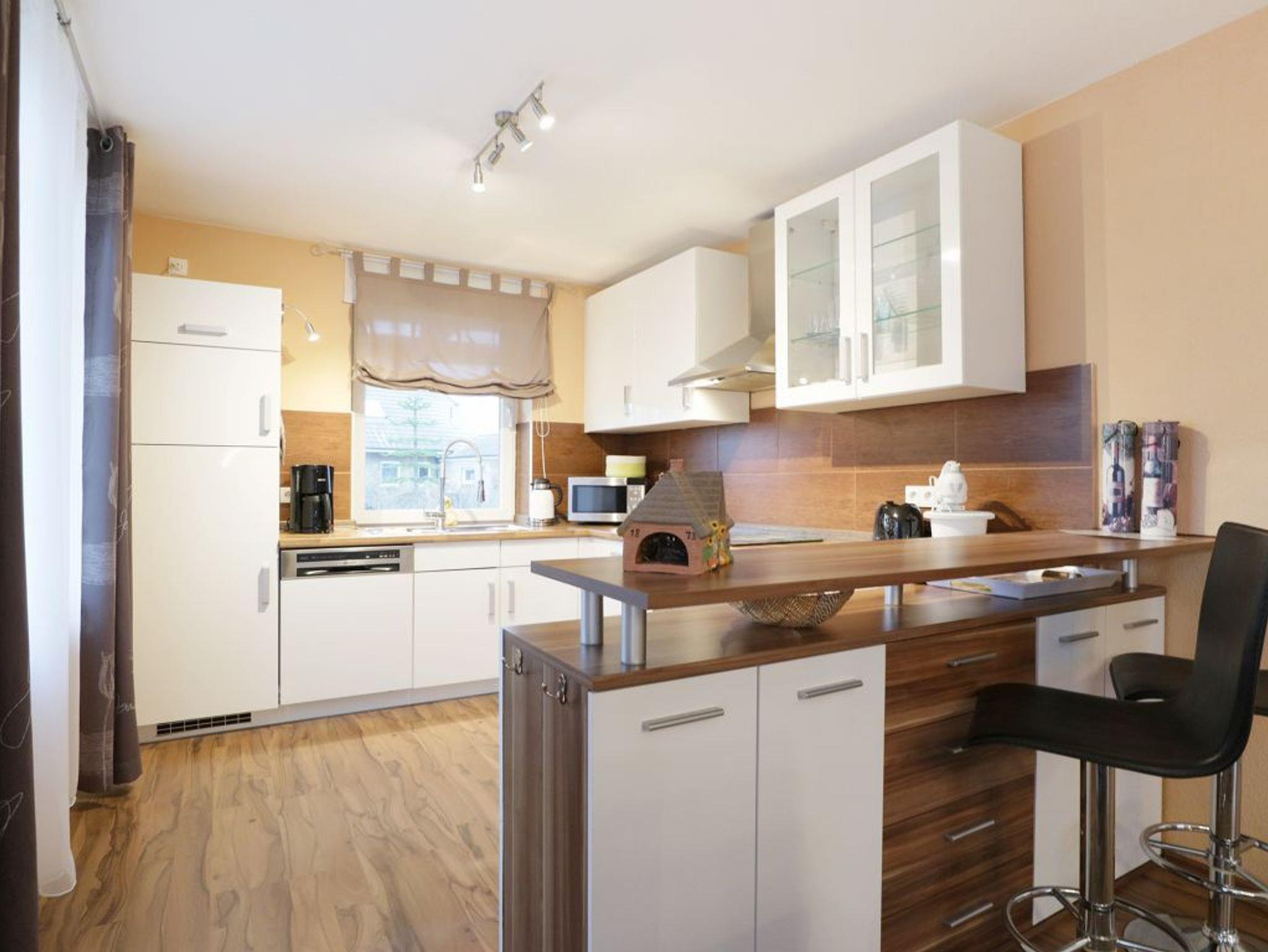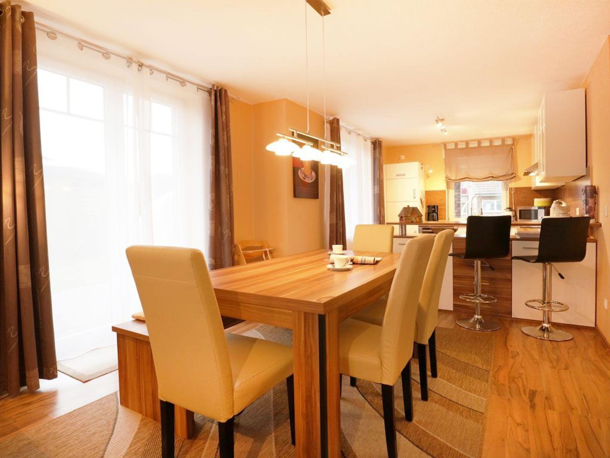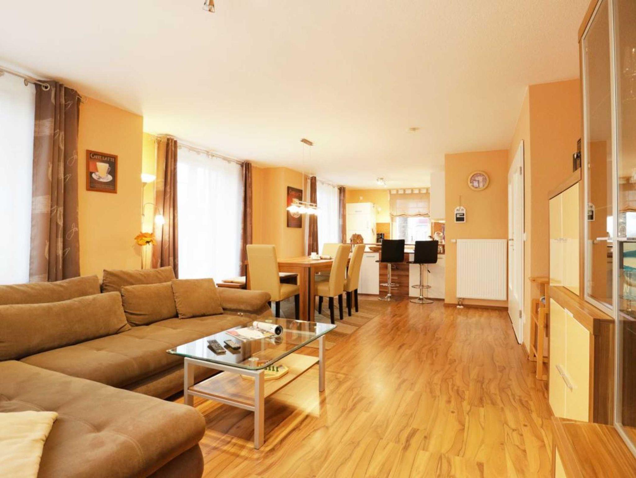 Das 2-Zimmer-Appartement befindet sich im Erdgeschoss des Hauses und bietet mit seinen 78m² ausreichend Platz für einen Urlaub für bis zu 4 Personen. Die Ferienwohnung verfügt über einen hellen, freundlichen Wohnbereich und einer integrierten, modernen eingerichteten Einbauküche, die mit Kühlschrank und Gefrierfach, Herd mit Ceranfeld, Backofen, Geschirrspüler, Kaffeemaschine, Wasserkocher, Toaster u.v.m. ausgestattet ist. Des Weiteren ist das Appartement mit einer Sauna ausgestattet. Ein LCD Fernseher und ein DVD Player sind vorhanden.