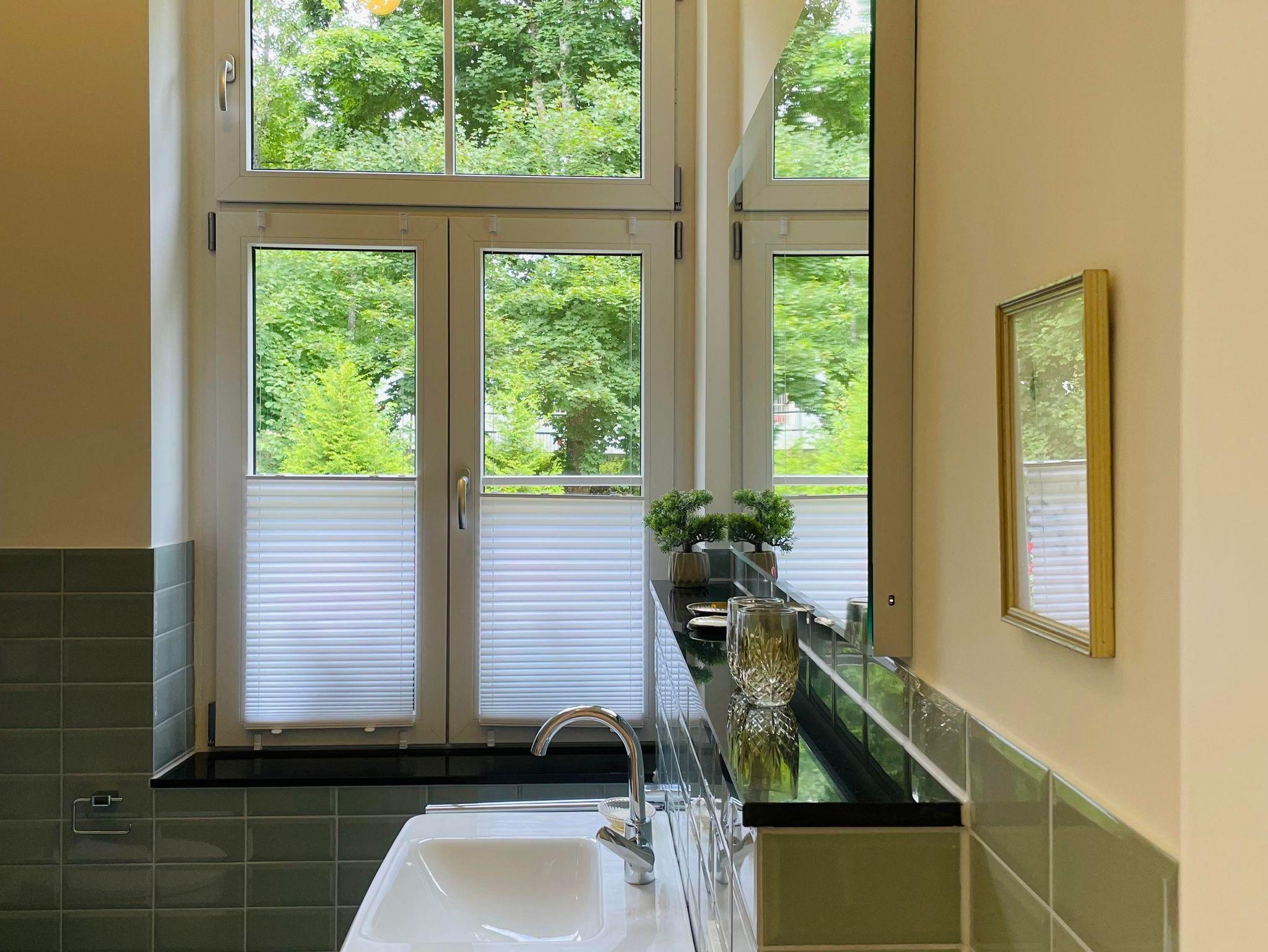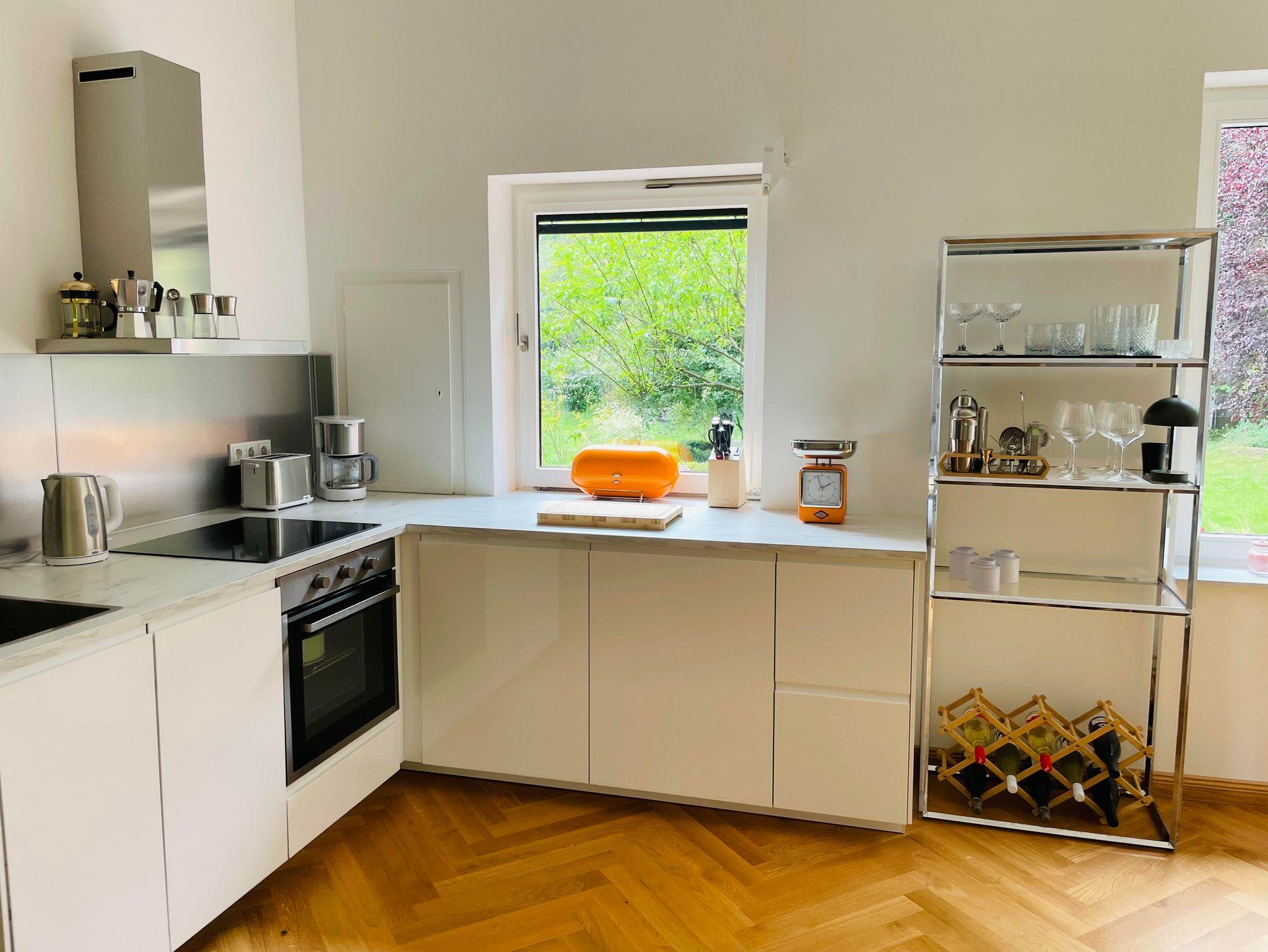 Eingebettet in die historische Atmosphäre des Hauses ist ein modernes Feriendomizil mit hochwertigem Parkettboden, Fußbodenheizung, zwei Schlafzimmern, einem lichtdurchfluteten Wohn- und Esszimmer, sowie zeitgemäßen Sanitäreinrichtungen und einer wunderschönen Terrasse mit Blick in den wilden Garten entstanden.