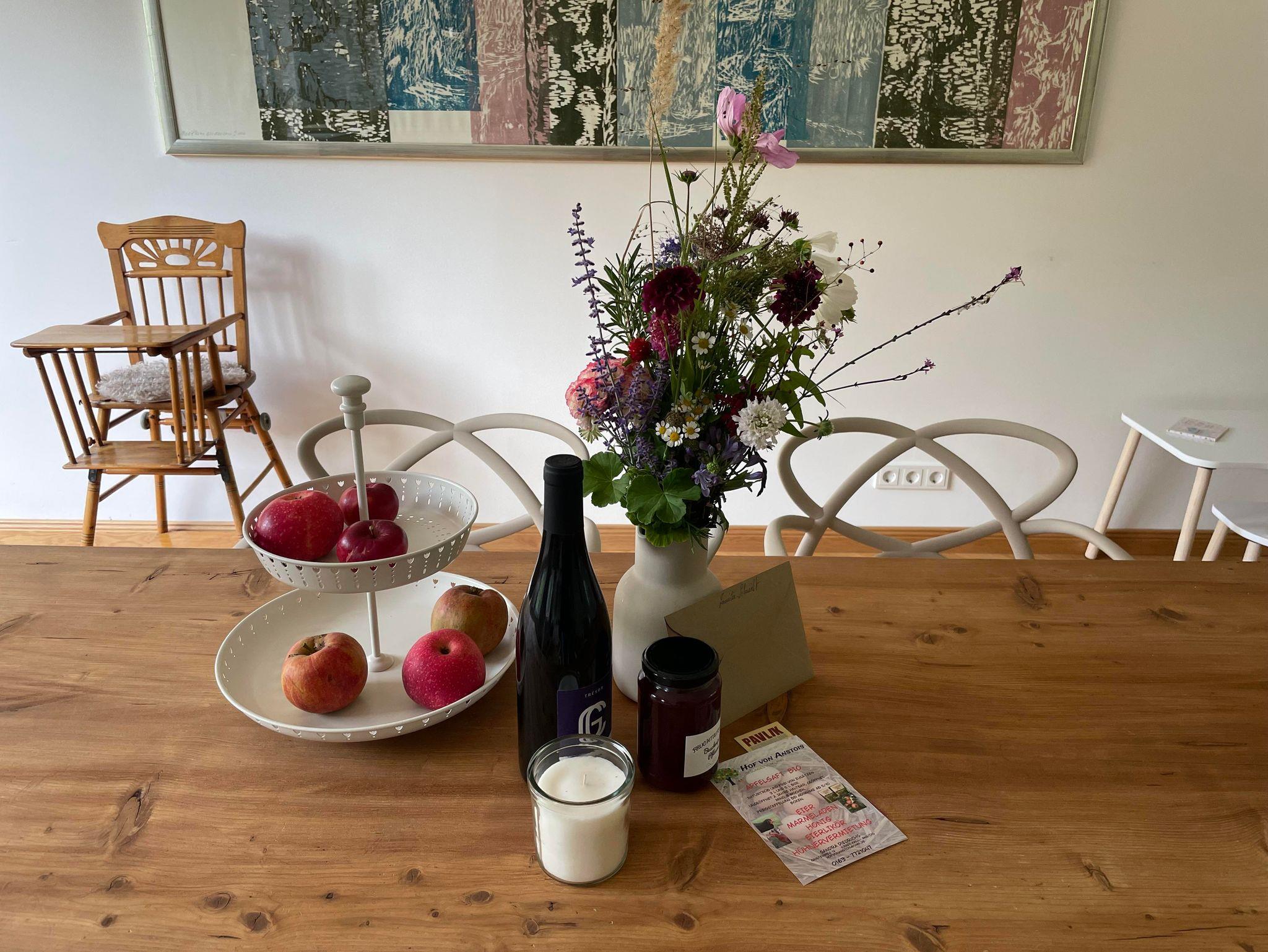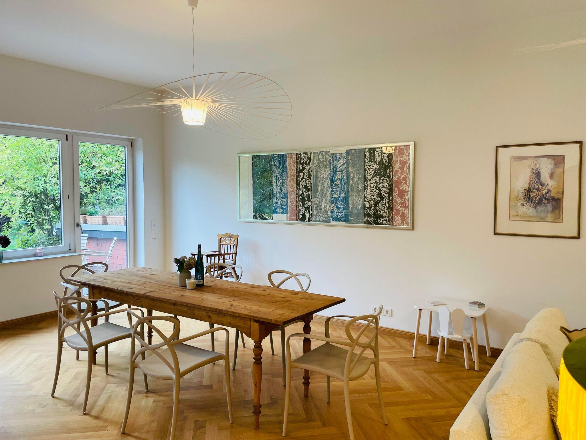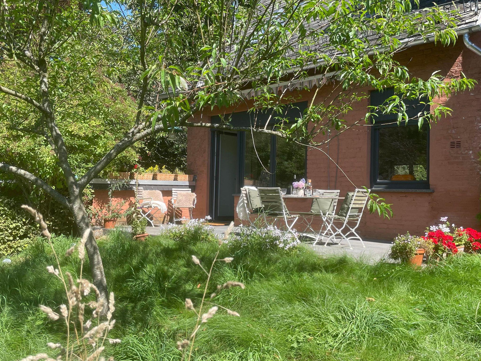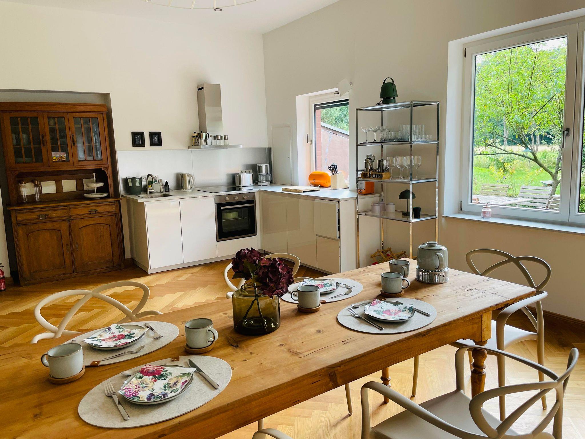 Entstanden ist ein modernes Feriendomizil mit 2 Schlafzimmern, einem großen Wohn- und Esszimmer mit moderner, voll ausgestatteten Küche, hochwertigem Parkettboden, Fußbodenheizung und zeitgemäßen Sanitäreinrichtungen – eingebettet in die historische Atmosphäre des Hauses. Die Sonnenterrasse mit Blick in den wilden Garten oder die kleine Gartenlounge laden zum Verweilen, Entspannen und -unsere kleinen Gäste- zum Spielen ein.