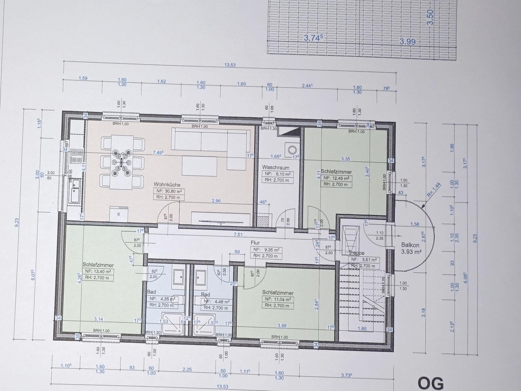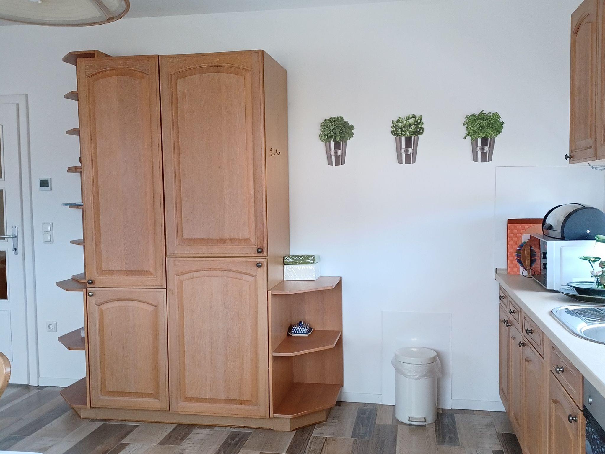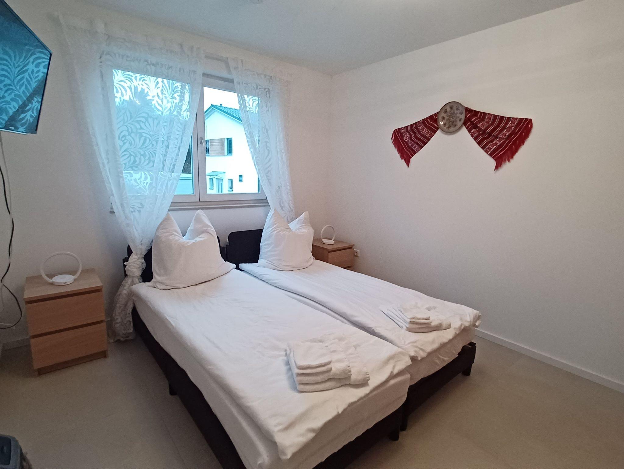 Eine Waschmaschine und ein Trockner stehen in der Diele zur Nutzung bereit. Die Ferienwohnung ist zudem ausgestattet mit zwei Bädern und einem einladenden Balkon mit schöner Aussicht auf die Juralandschaft.