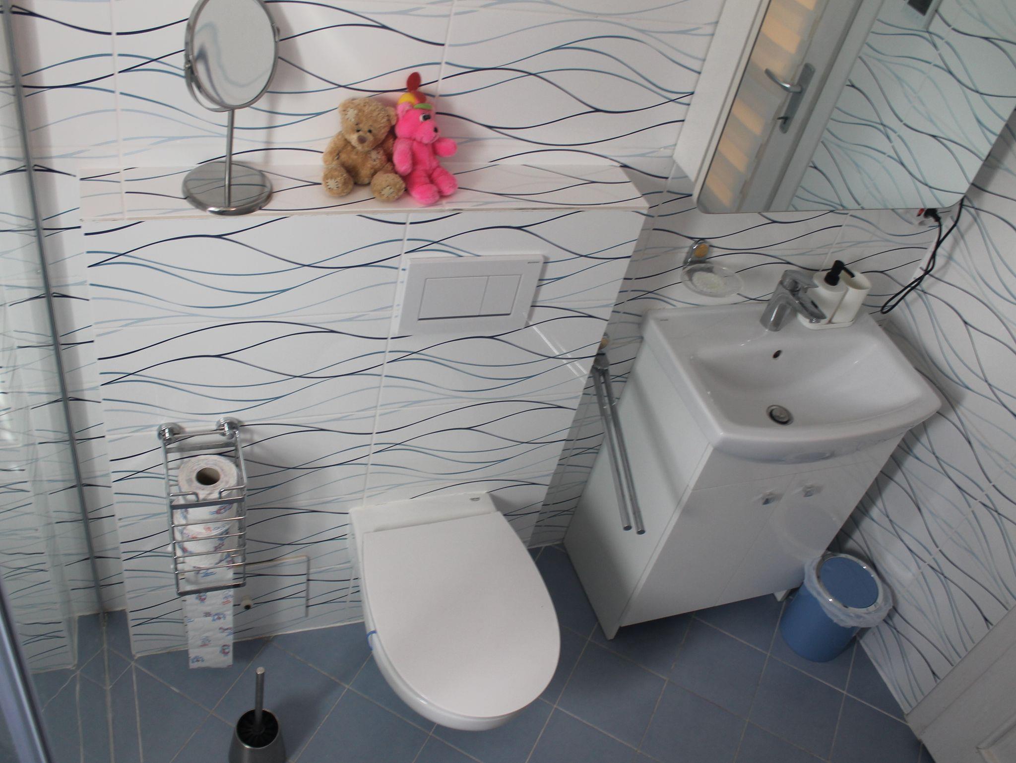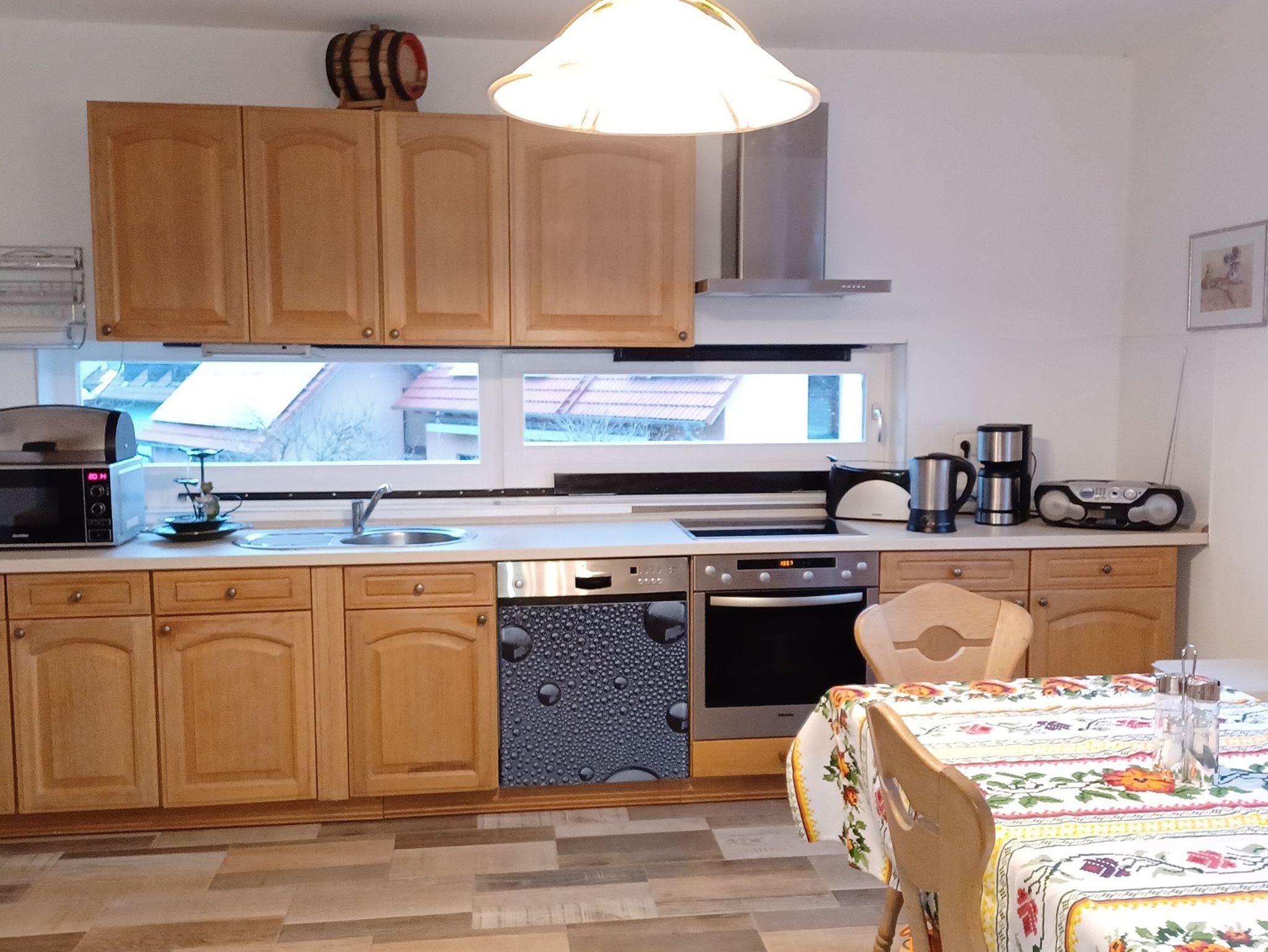 Eine Waschmaschine und ein Trockner stehen in der Diele zur Nutzung bereit. Die Ferienwohnung ist zudem ausgestattet mit zwei Bädern und einem einladenden Balkon mit schöner Aussicht auf die Juralandschaft.