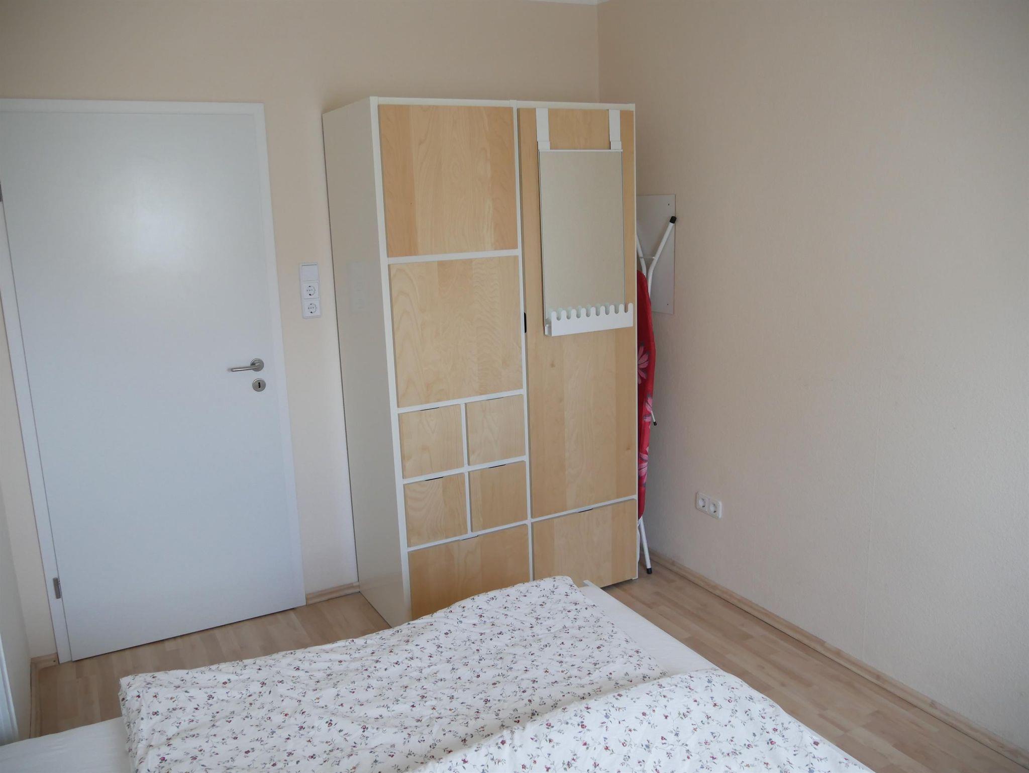 Das helle und freundliche Schlafzimmer bietet Platz für zwei Personen im Doppelbett (1,60m x 2,00m) mit offenem Fußende.