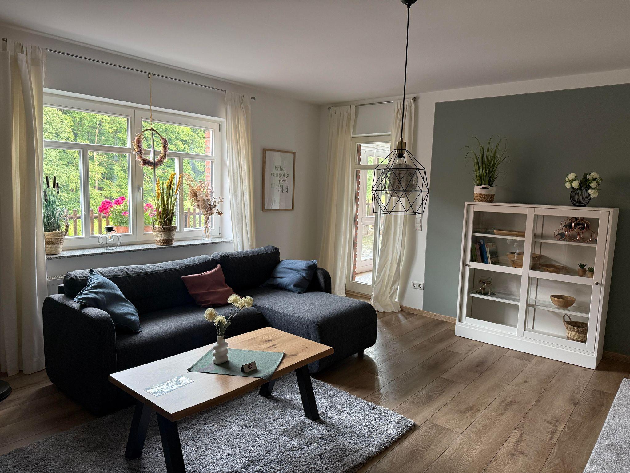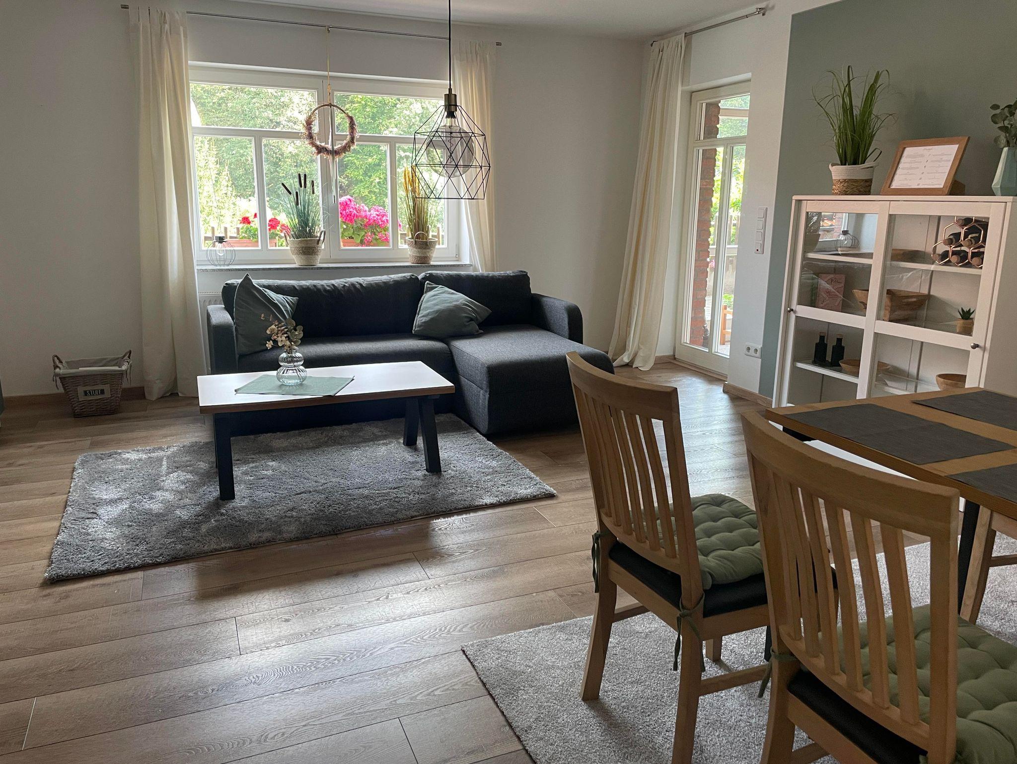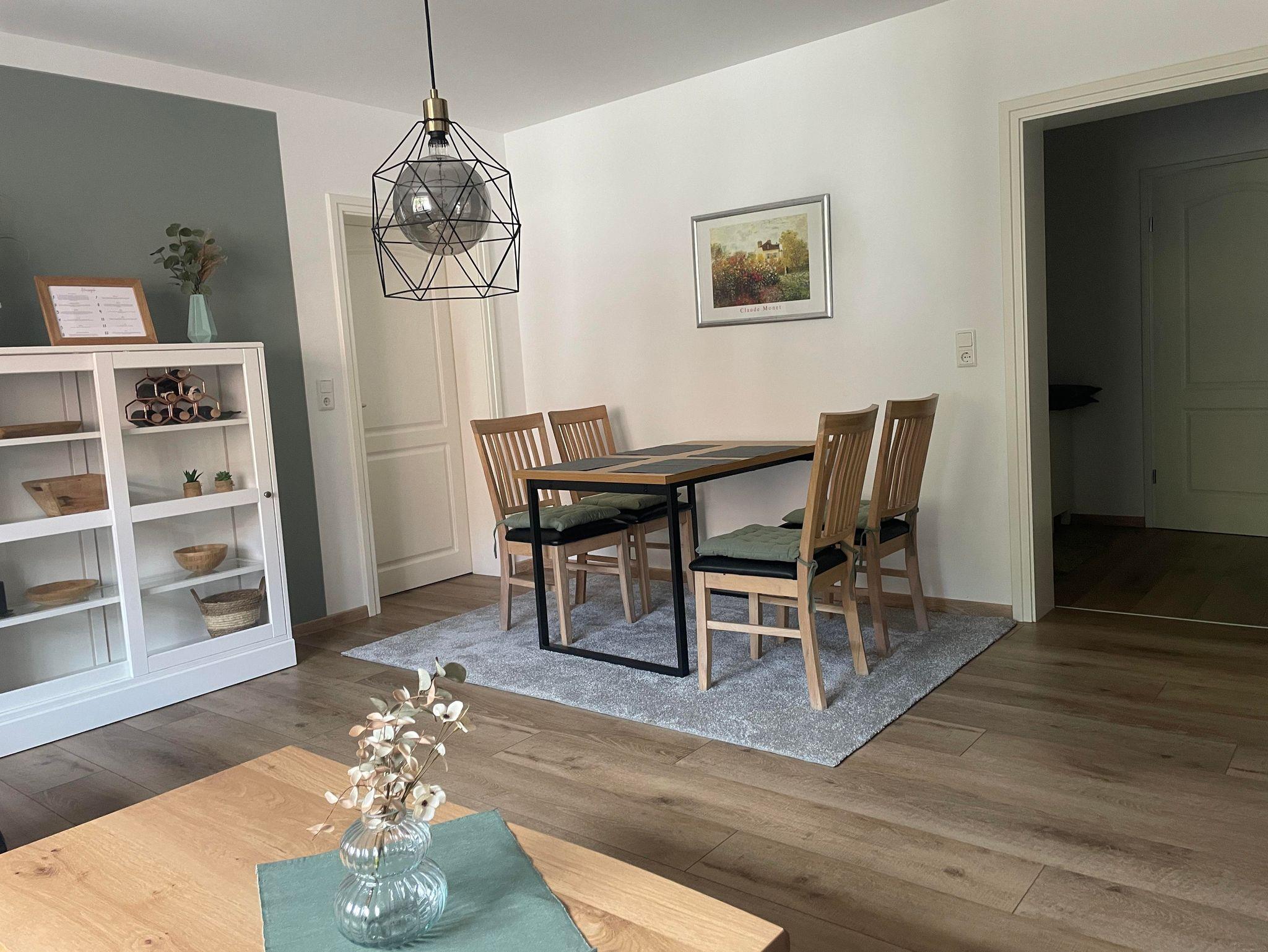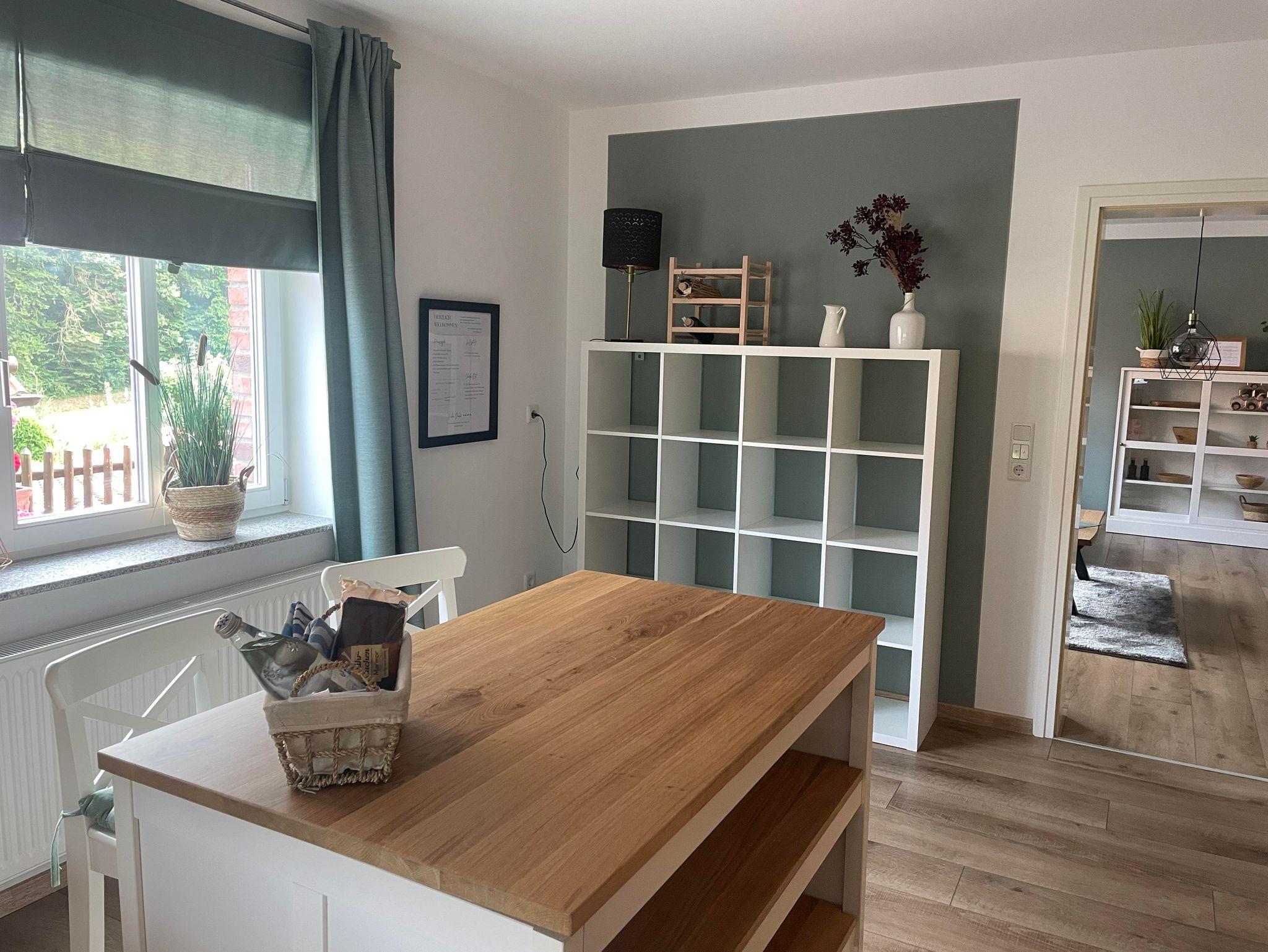 Die in 2024 neu eingerichtete Ferienwohnung bietet eine große ausgestatte Küche mit Kühlschrank, Elektroherd, Mikrowelle, Spülmaschine, Wasserkocher und Kaffeemaschine.