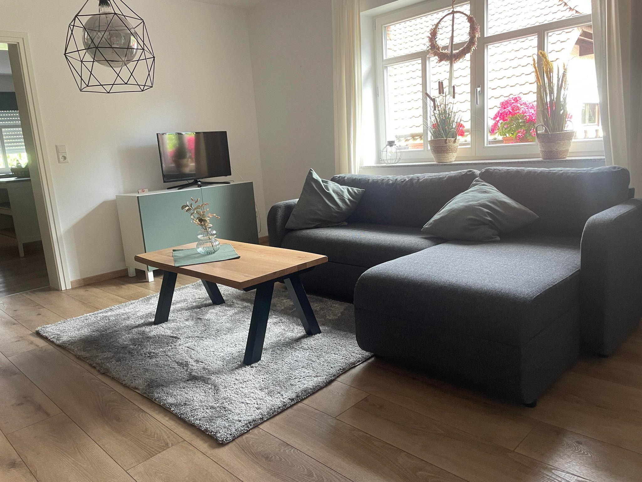 Ein Wohnzimmer mit Flachbildschirm und großer Schlafcouch für 1-2 weitere Gäste. Im Durchgangszimmer vom Wohnzimmer zum Badezimmer, steht bei Bedarf eine weitere hochwertige Schlafcouch mit Topper zur Verfügung.
