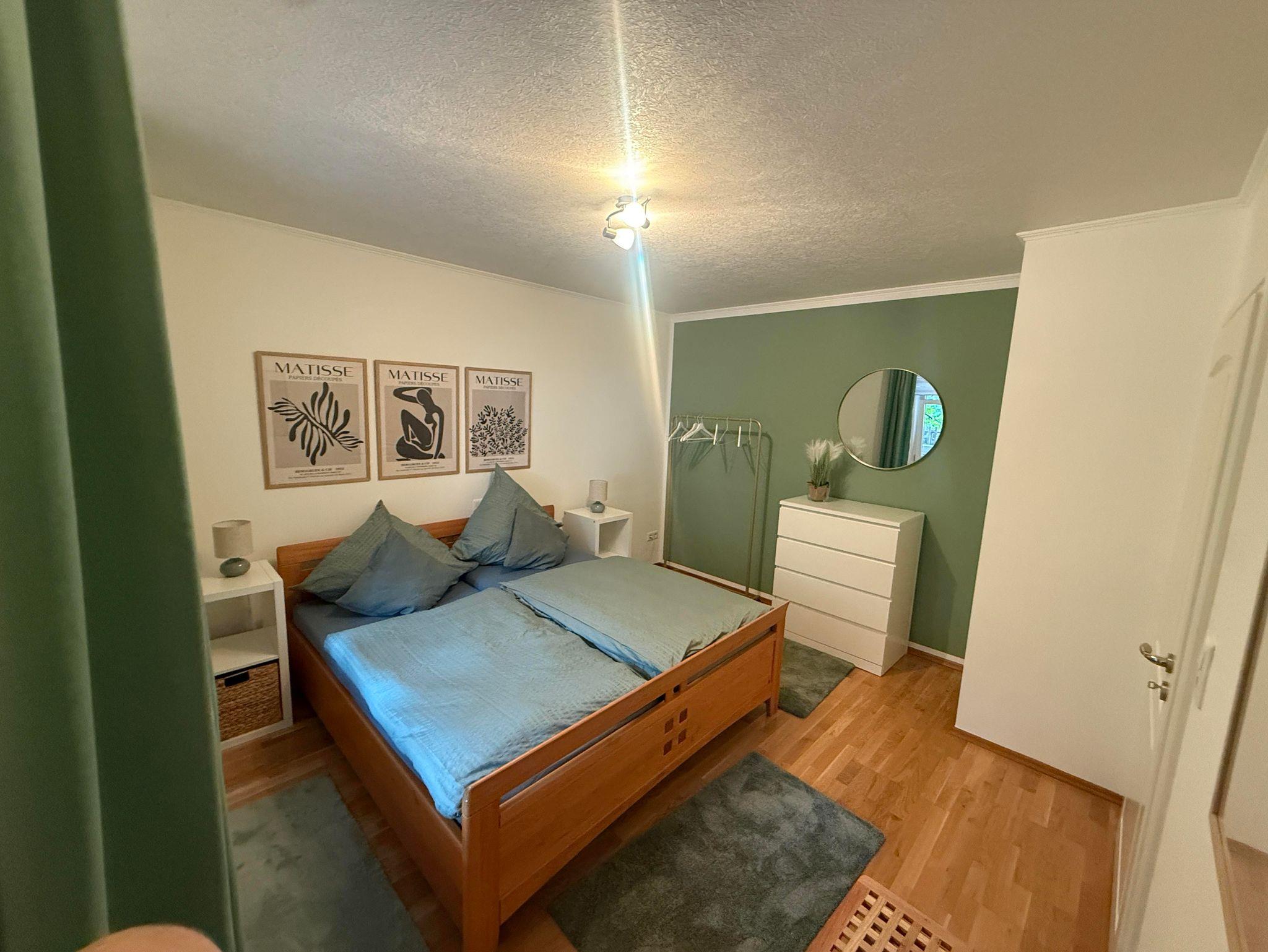 Ein Schlafzimmer mit einem Doppelbett.