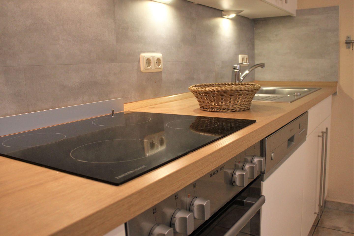 Die zum Wohnzimmer offene Küche ist mit Haushaltsgeräten wie Geschirrspülmaschine oder Mikrowelle und reichlich Geschirr gut ausgestattet und an dem großzügigen Esstisch haben alle Gäste genügend Platz.