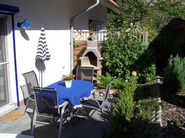 Die Sonnenterrasse erreichen Sie ebenfalls vom Wohnzimmer aus. Hier können Sie bequeme Gartenmöbel und einen gemauerten Grill nutzen und die Seele baumeln lassen.