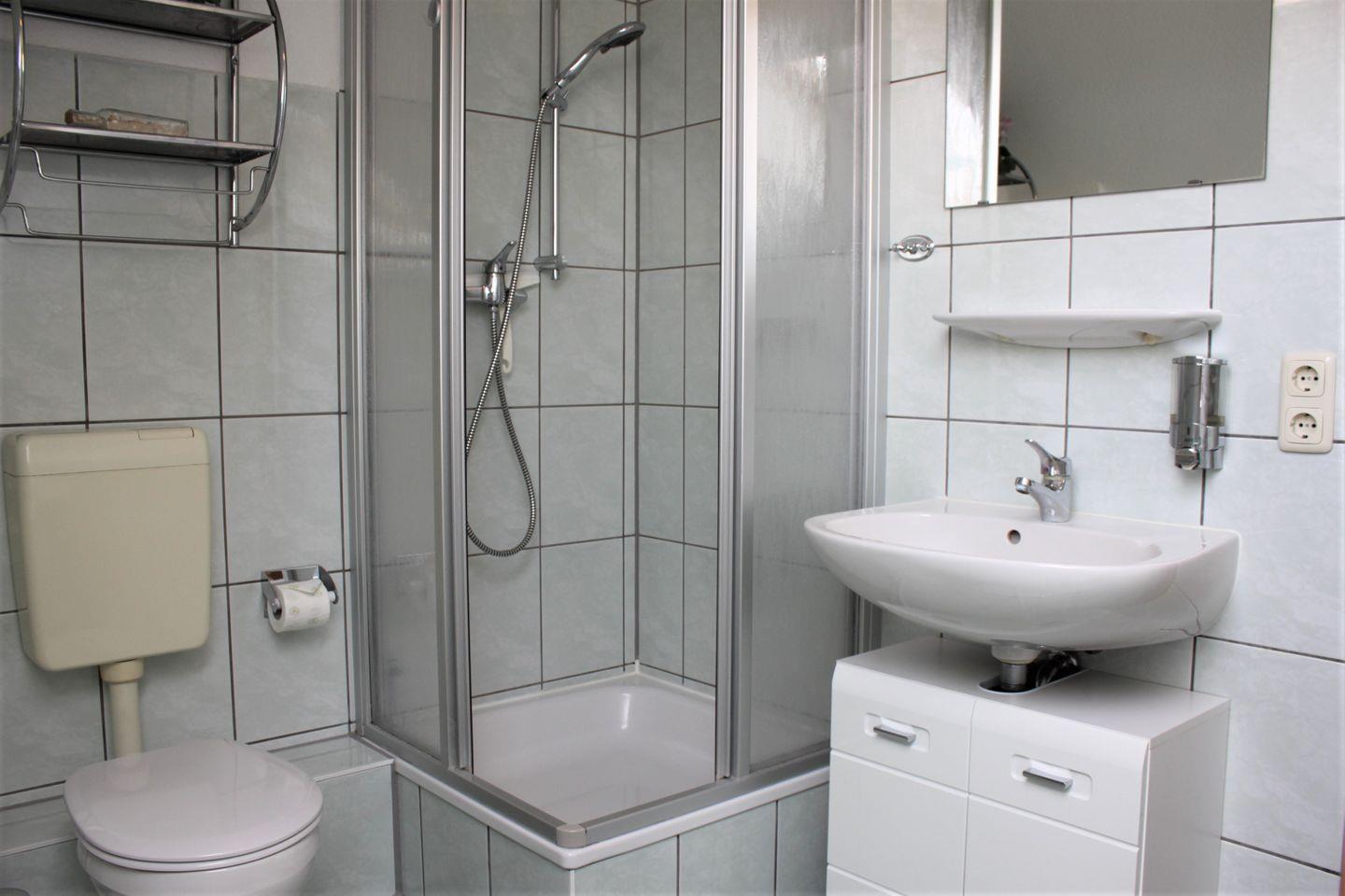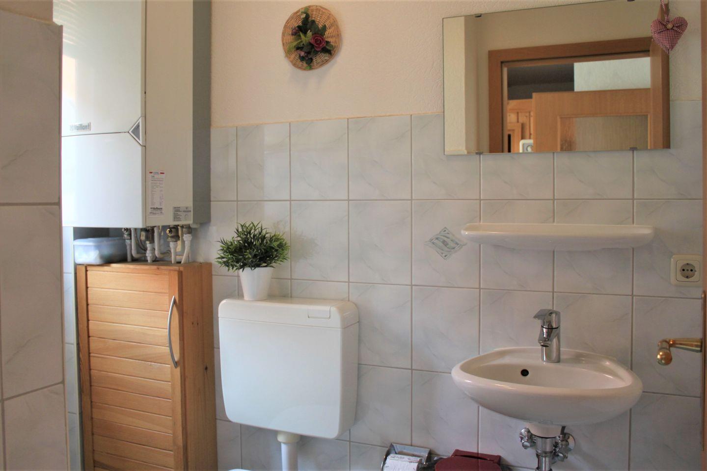 Das Badezimmer ist voll ausgestattet mit einer Dusche, Waschtisch und WC. Ein zusätzliches Gäste-WC befindet sich im Erdgeschoss des Hauses.