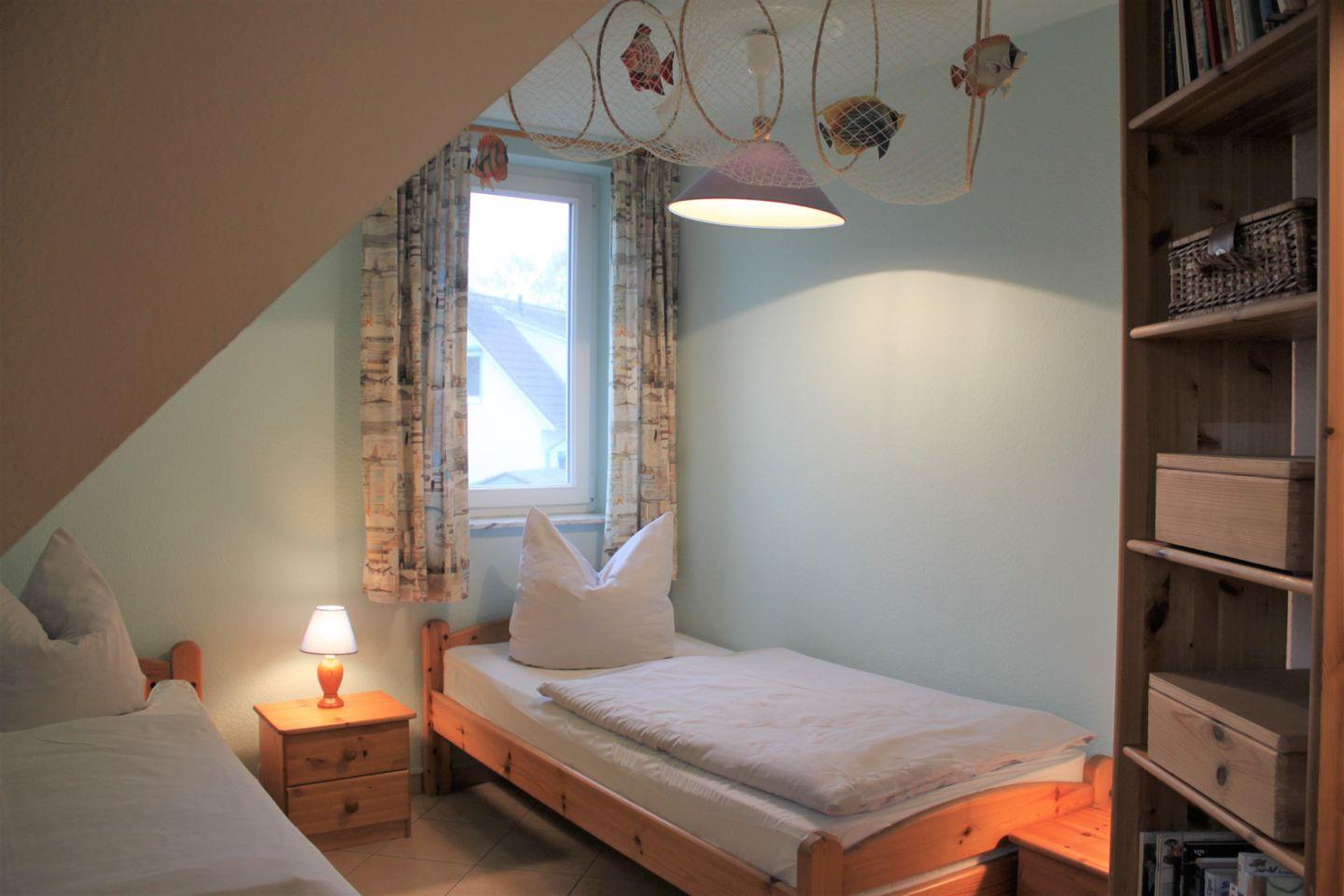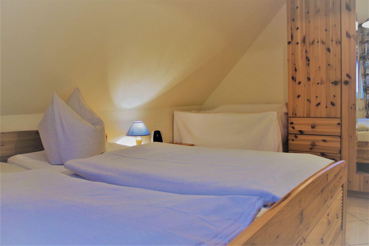 In der oberen Etage befinden sich die Schlafräume, die entweder mit einem Doppelbett oder zwei Einzelbetten möbliert sind. In beiden Räumen haben Sie außerdem genügend Stauraum für Ihre Urlaubsgarderobe. Für die ganz kleinen Gäste steht zusätzlich ein Kinderreisebett und ein Kinderhochstuhl zur Verfügung.