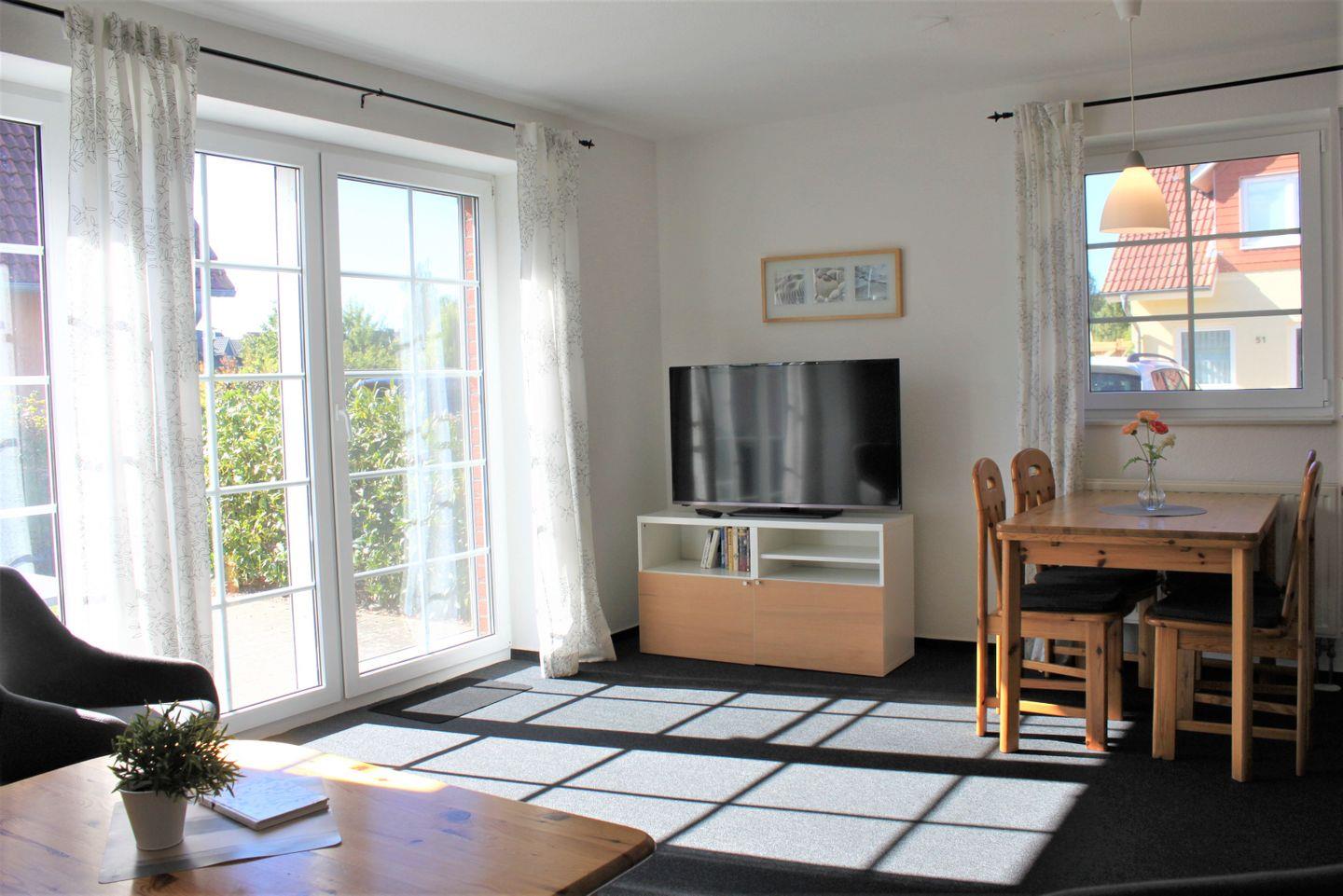 Über den Flur gelangen Sie in den hellen Wohn- und Essbereich mit Zugang zu der möblierten Terrasse. Ausgestattet mit einem gemütlichen Sofa und TV-Gerät werden Sie sich rund um wohlfühlen. Die integrierte Küche ist unter anderem mit einem Kühlschrank mit Gefrierfach, einem Herd mit Backofen, Geschirrspülmaschine, Wasserkocher und Kaffeemaschine gut ausgestattet und lädt zu geselligen Kochabenden ein. Ihre Mahlzeiten genießen Sie entweder an dem angrenzenden Esstisch oder auf der möblierten Terrasse.