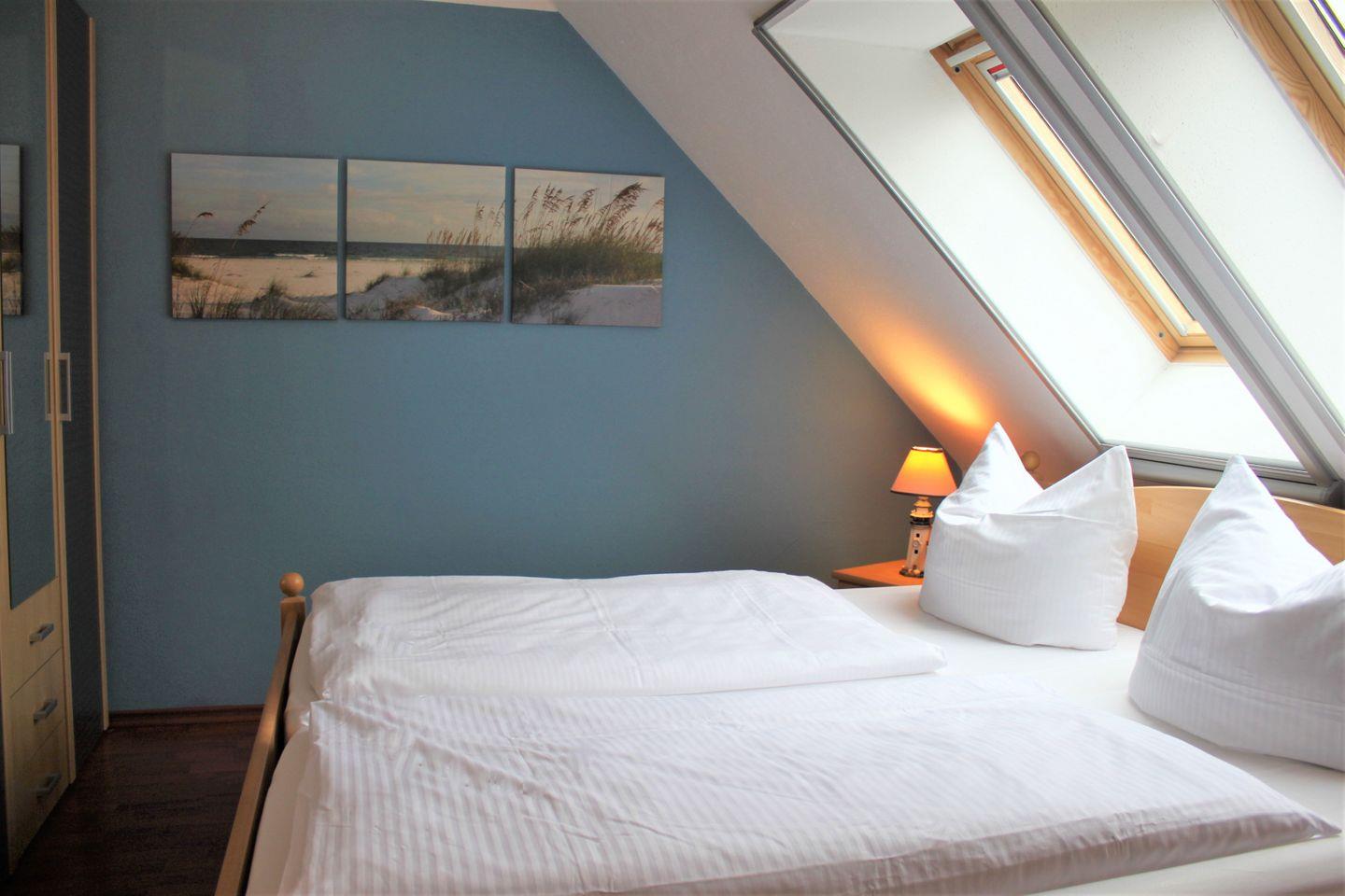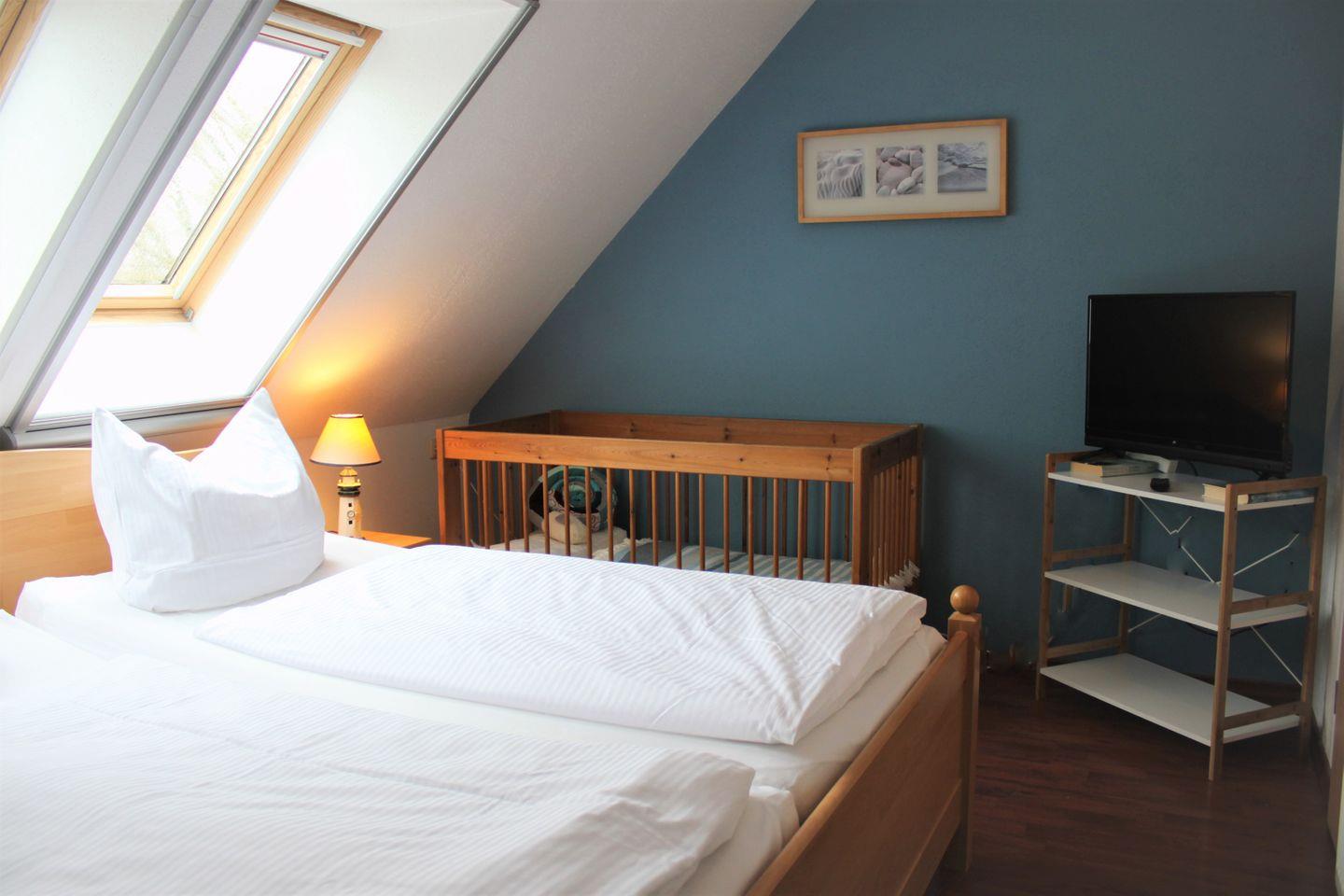 Die beiden separaten Schlafzimmer befinden sich im Obergeschoss des Hauses. Ein Schlafzimmer ist mit einem Doppelbett, einem Kleiderschrank und einem TV-Gerät ausgestattet. Das andere Schlafzimmer bietet Ihnen ebenfalls ein Doppelbett (mit durchgehender Matratze), ein zusätzliches Einzelbett mit Ausziehfunktion und Stauraum für Ihre Garderobe.