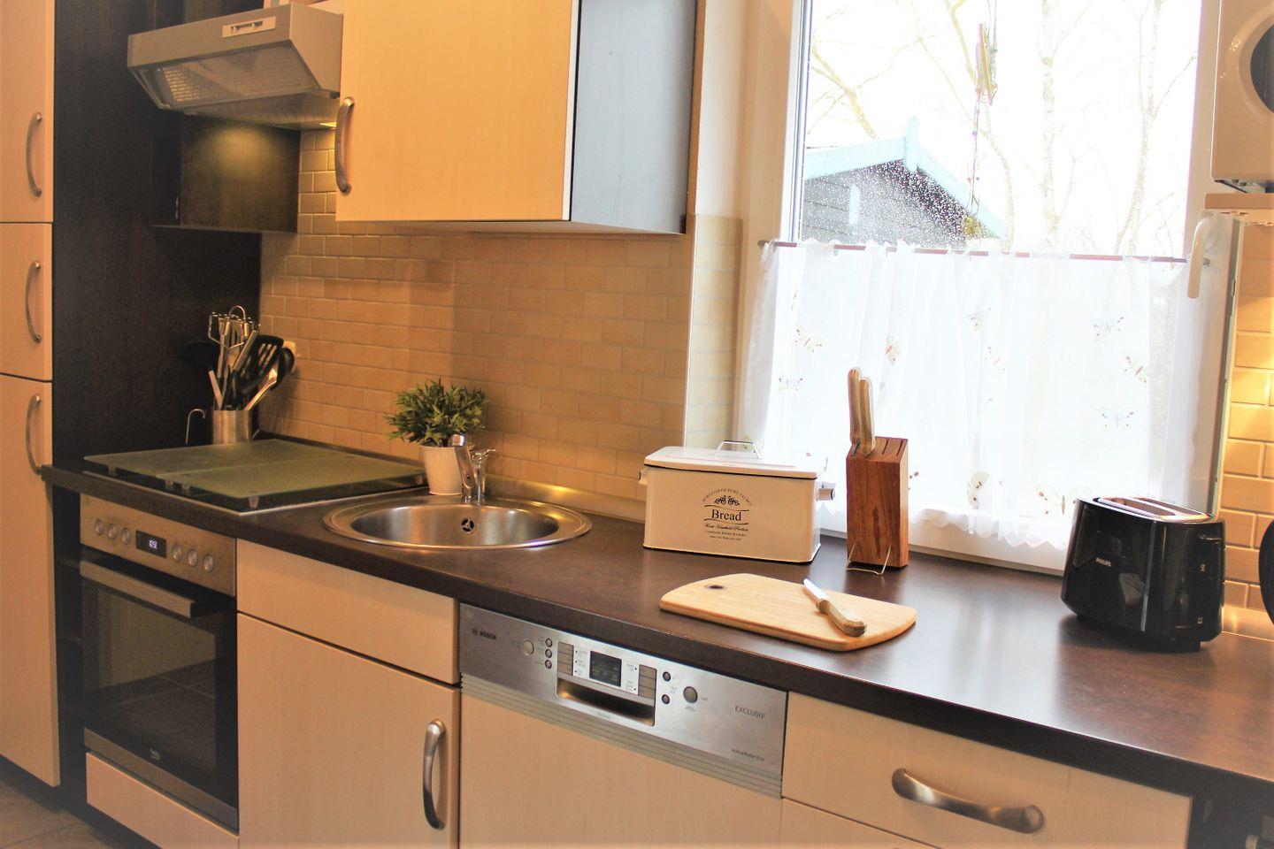 Im großzügigen Wohn- und Essbereich verfügen Sie über eine komfortable, große Couch, ein TV-Gerät und einen großzügigen Esstisch, an dem alle Gäste bequem Platz finden. Die Küche ist in den Raum integriert und bietet eine tolle Ausstattung, wie z.B. Kühlschrank mit Gefrierfach, Herd mit Backofen, Mikrowelle, Geschirrspülmaschine und diverse Kleingeräte. Sie können sich bestens selbst versorgen.