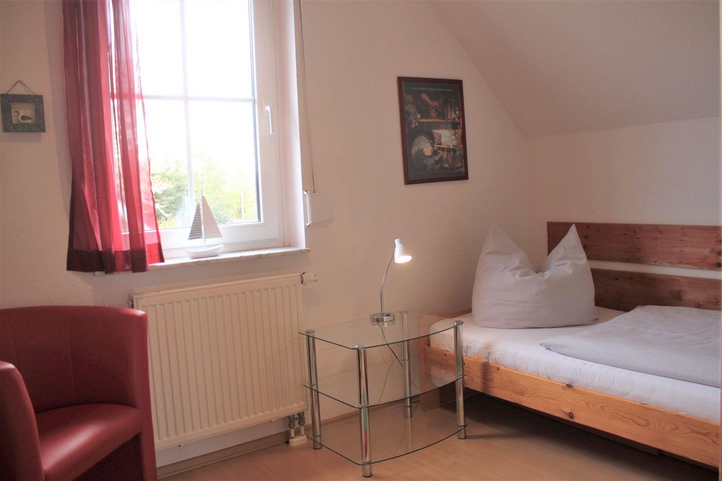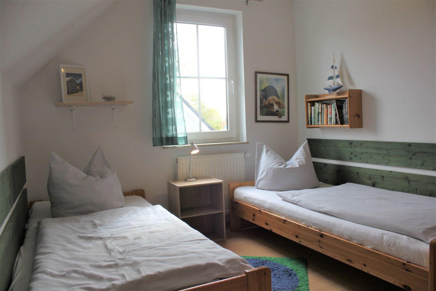 Über eine Treppe gelangen Sie in die obere Etage des Hauses, wo sich die drei separaten Schlafzimmer befinden. Ein Schlafzimmer ist mit einem Doppelbett, Klappliege, Kleiderschrank und zusätzlichem TV-Gerät möbliert. Ein Zimmer verfügt über zwei Einzelbetten, ein Zimmer ist mit einem Einzelbett ausgestattet. Es gibt ausreichend Stauraum für Ihre Garderobe.