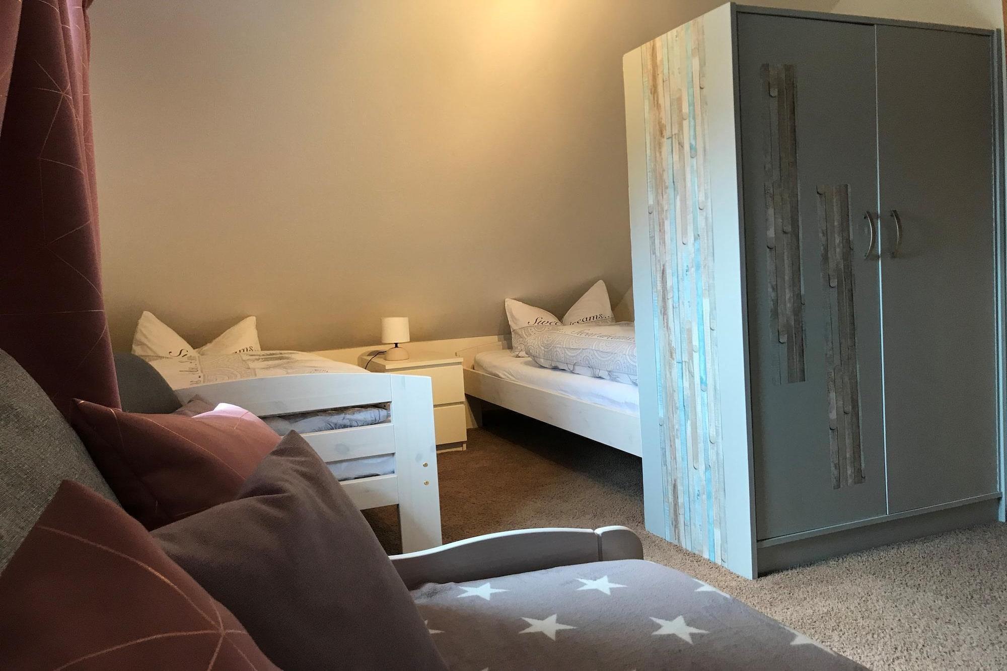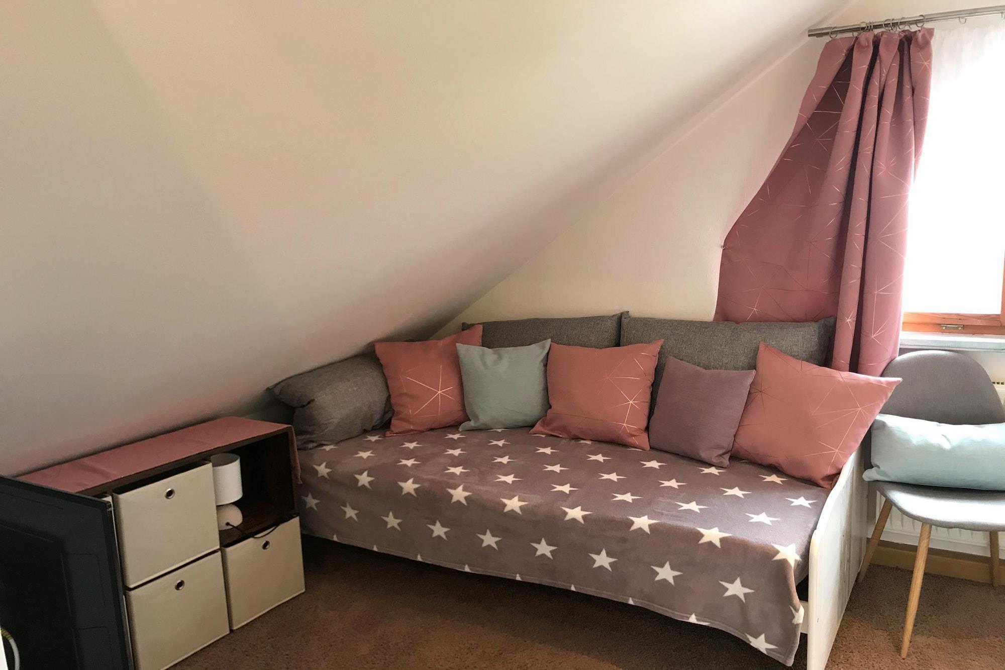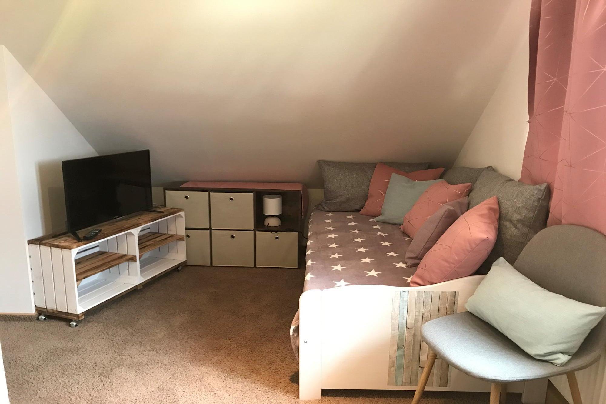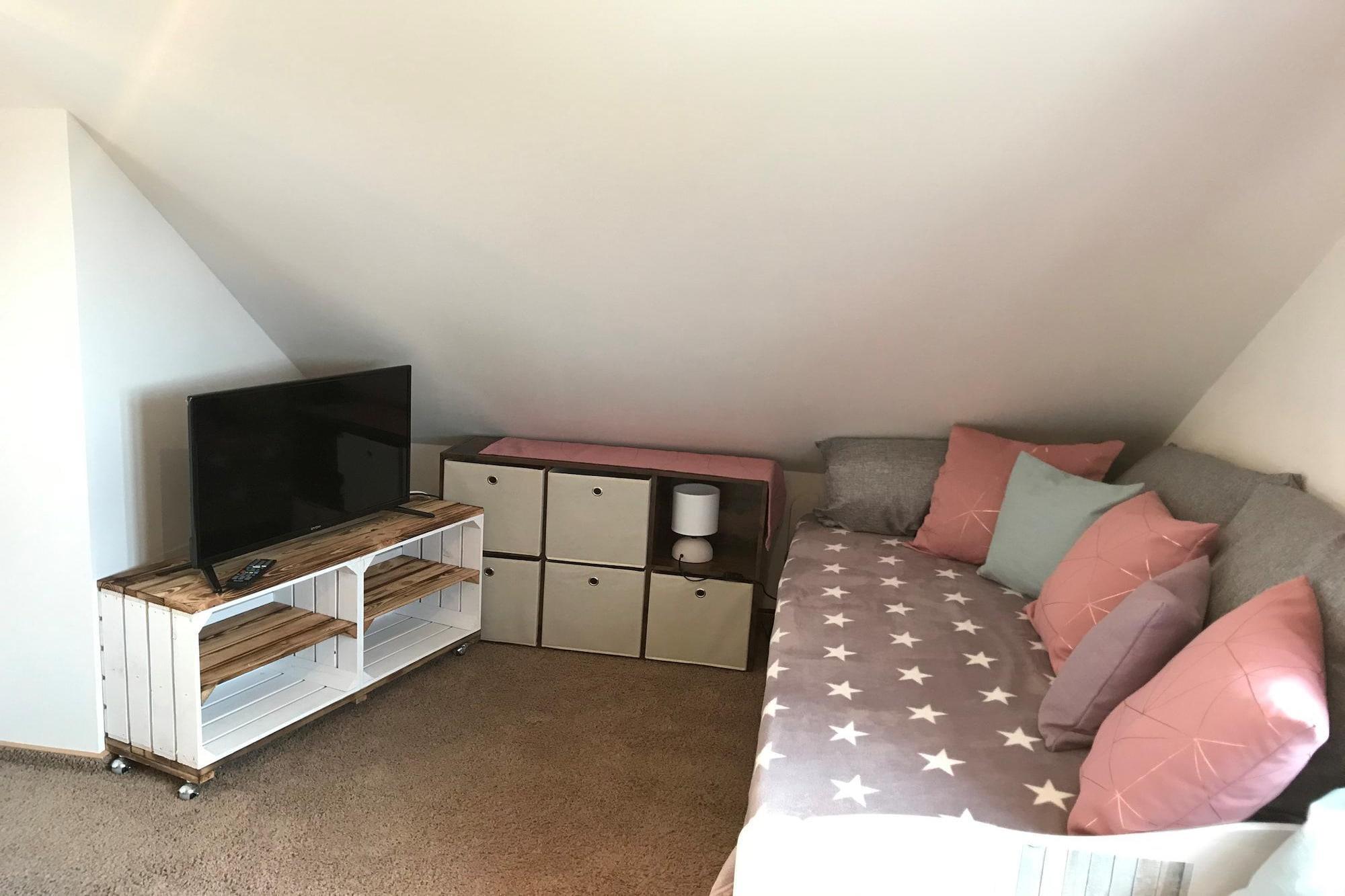 Væk fra stress og hverdagsliv finder du en atmosfære af behagelig komfort og ro i dette feriehus på bakken. Fra balkonen har du en vidunderlig panoramaudsigt over Rhön-bjergene. Bag huset på terrassen kan I nyde aftensolen med udsigt til skovkanten og helt sikkert starte en hyggelig grillaften. Kaltensundheim ligger i en højde af 460 meter over havets overflade, cirka 15 kilometer fra Meiningen. Karakteristiske bjerge er Hemschenberg i sydøst, Alte Mark i syd og Leichelberg i øst. Det smukke bybillede er præget af de mange bindingsværkshuse, især bageriet fra 1704 er et besøg værd. Her er nu indrettet et landsbymuseum, som giver information om den lokale historie og DDR's historie. Aktiviteter i nærheden: Bliv aktiv og udforsk de forskellige cirkulære vandreture omkring Kaltensundheim. Igen og igen støder du på en smuk udsigt fra toppen af de omkringliggende bjerge. Udflugter til Meiningen - også med bus - anbefales. Meiningen er en vigtig by for kunst og teater. Her kan du besøge Kunsthaus og Elisabethenburg Palace. Og selvfølgelig er Rhön også kendt for sin ølbrygningskunst: Uanset om det er overgæret eller uklar hvidøl, blomstret pilsner eller mørk kastanjebrun med et cremet skumlag - mange familievirksomheder med regionale rødder overbeviser med den traditionelle bryggerikunst Mobility : Ikke egnet til personer med nedsat mobilitet