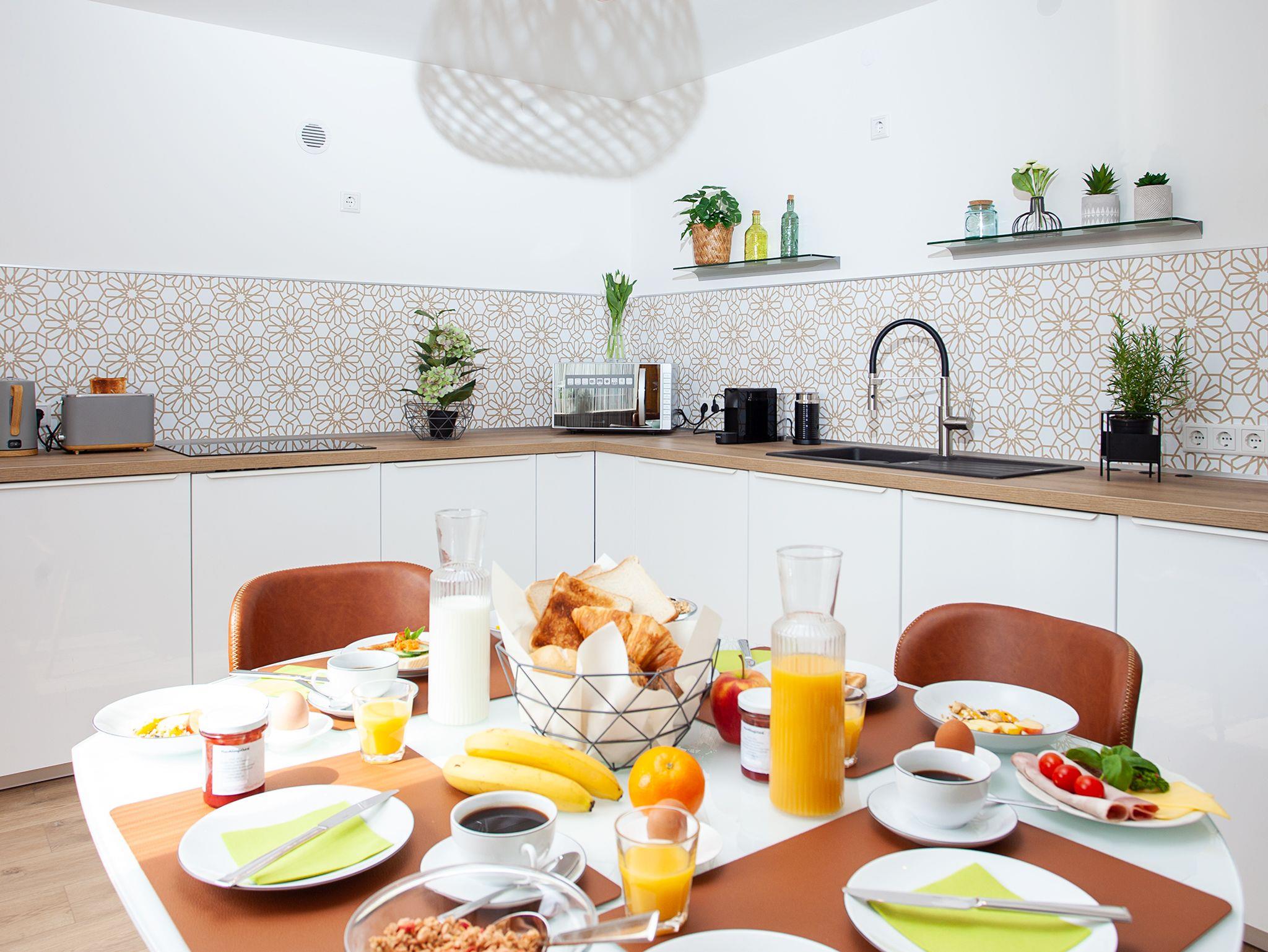 In allen Appartements befindet sich eine voll ausgestattete Küche mit Induktionsherd, Kühlschrank, Mikrowelle/Grillkombination, Wasserkocher und Nespresso-Kaffeemaschine. Das schöne wertige Koch- und Essgeschirr bereitet Selbstversorgern Vergnügen und lässt keine Wünsche offen. In jedem Zimmer befindet sich ein großer SMART – TV.