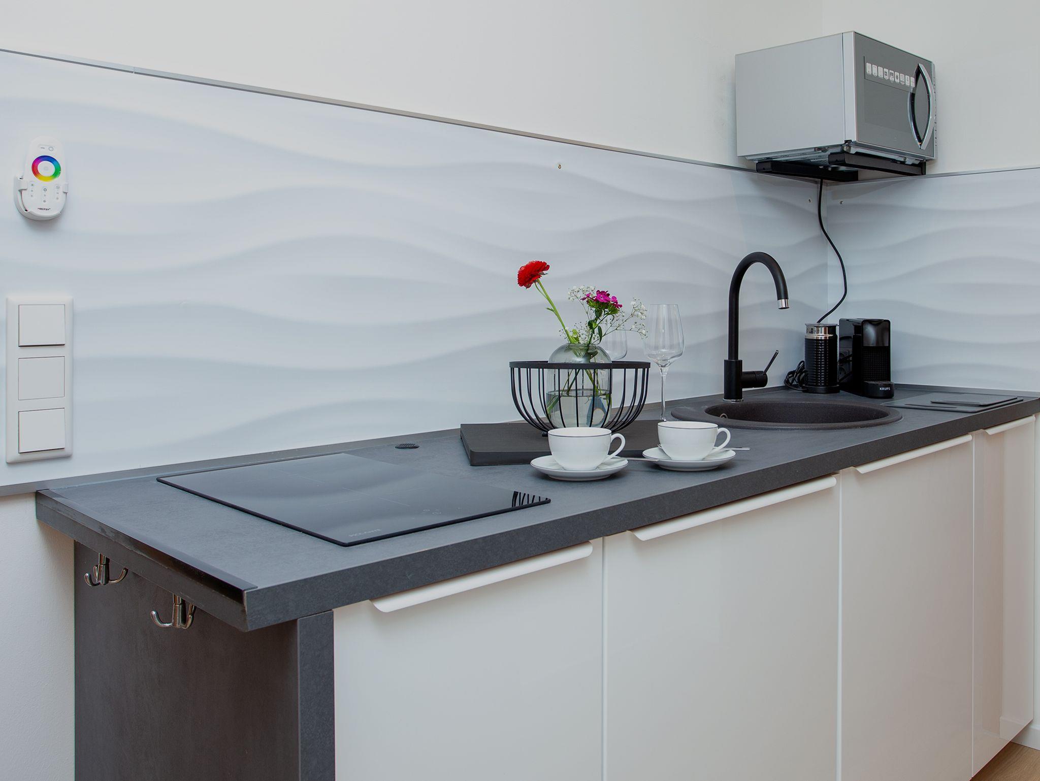 In allen Appartements befindet sich eine voll ausgestattete Küche mit Induktionsherd, Kühlschrank, Mikrowelle/Grillkombination, Wasserkocher und Nespresso-Kaffeemaschine. Das schöne wertige Koch- und Essgeschirr bereitet Selbstversorgern Vergnügen und lässt keine Wünsche offen. In jedem Zimmer befindet sich ein großer SMART – TV.