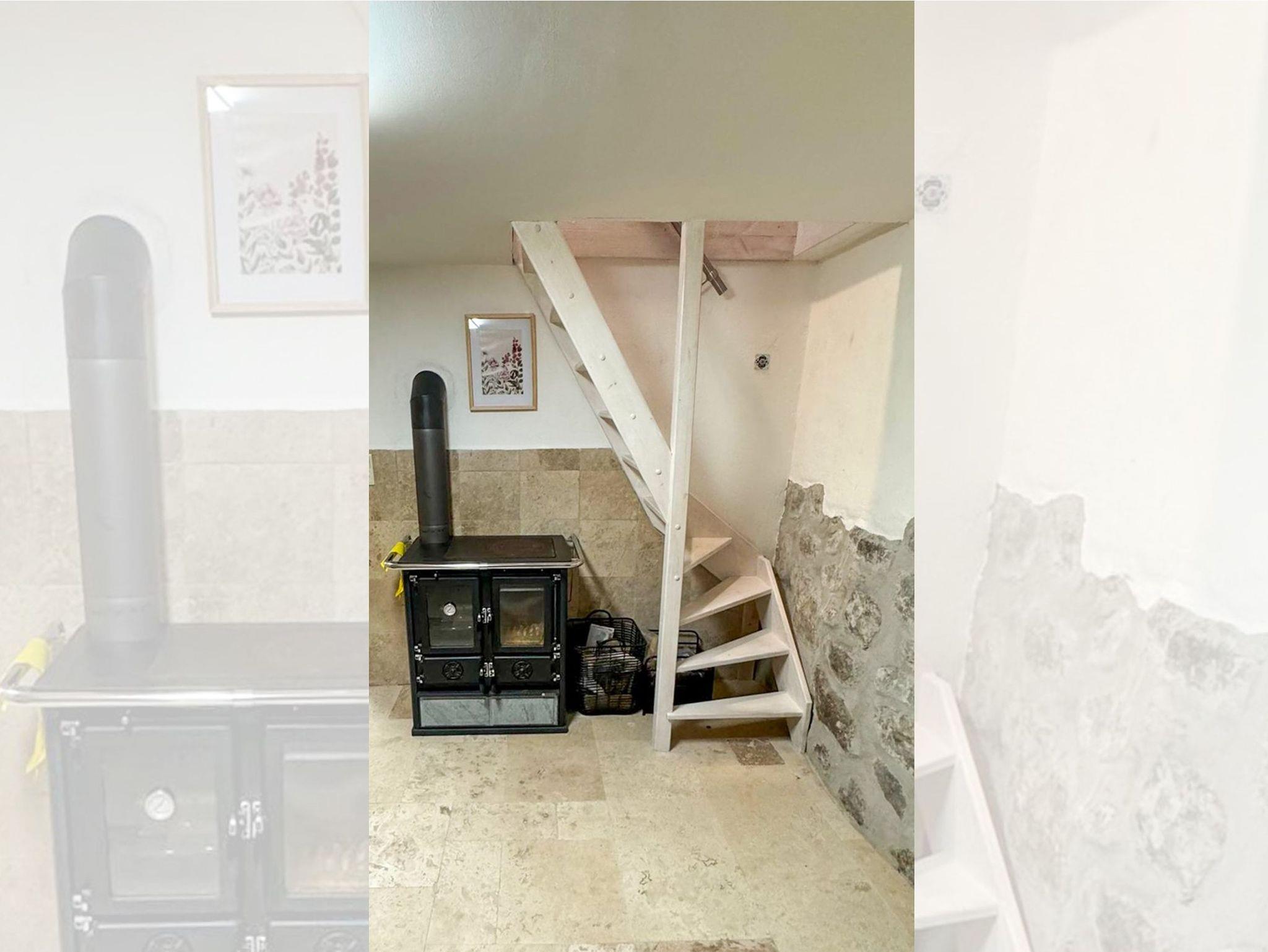 Das zweite Häuschen, „Antons Remise“, liegt hinter „Ellas Gehöft“ und überzeugt durch ebenso viel Charme. Im Erdgeschoss finden Sie eine gut ausgestattete Küche, ein Wohnzimmer mit Kachelofen und ein Badezimmer mit Dusche und WC. Auch hier führt eine steilere Treppe ins Obergeschoss, wo sich zwei Schlafzimmer mit Doppelbetten befinden.