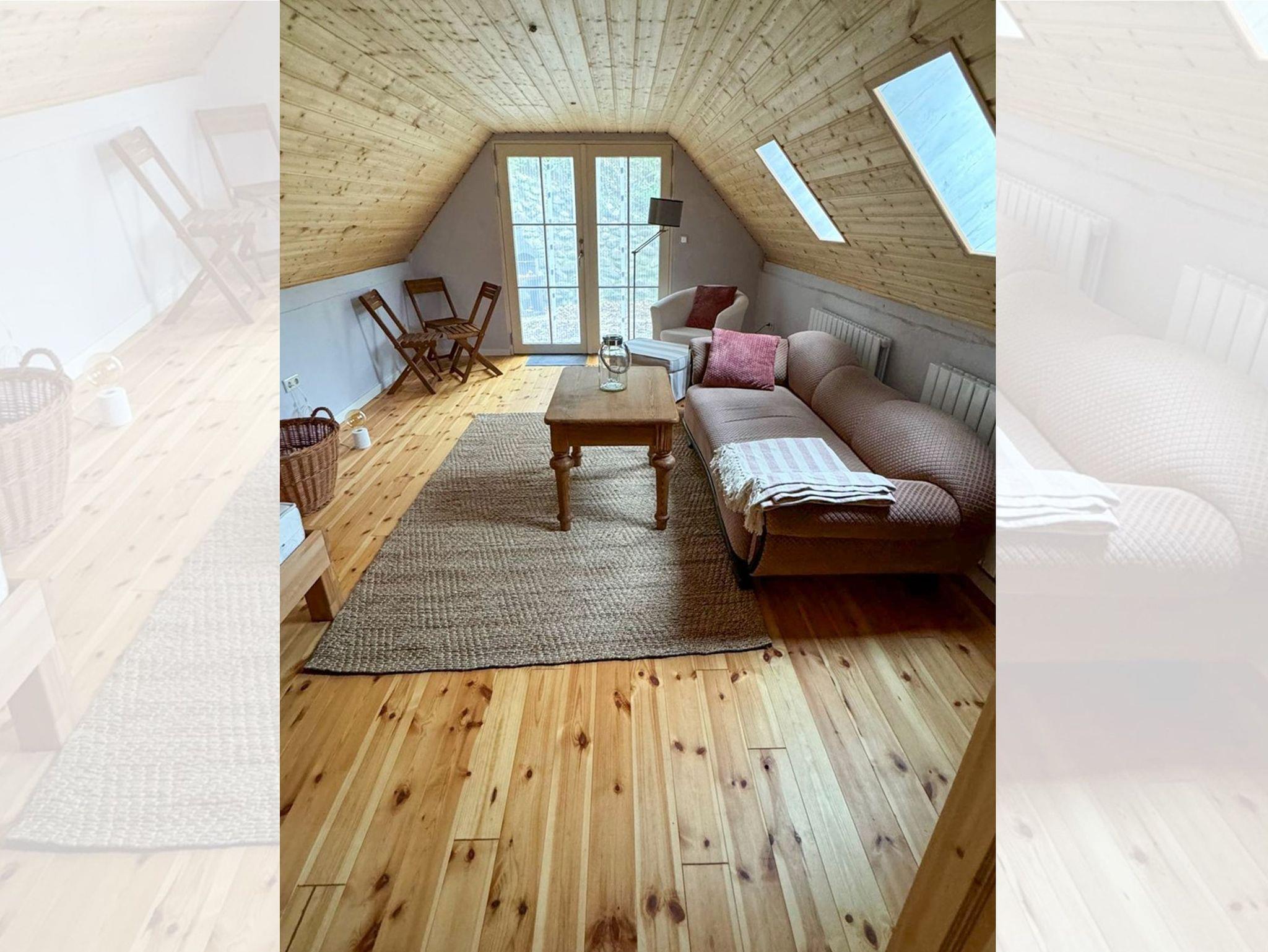 Das erste Häuschen, „Ellas Gehöft“, bietet im Erdgeschoss ein gemütliches Wohnzimmer, eine separate Küche mit rustikalem Holzofen und Zugang zur Terrasse sowie ein Badezimmer mit Dusche und WC. Eine charmante, steilere Holztreppe führt Sie in die oberen Etagen, wo sich zwei Schlafzimmer mit je einem Doppelbett und ein weiteres Badezimmer mit Dusche und WC befinden.