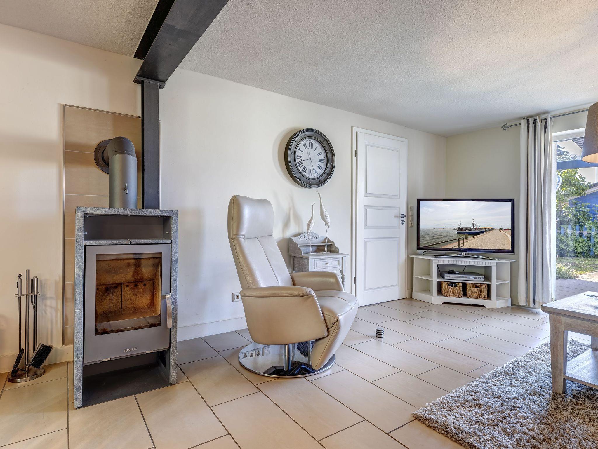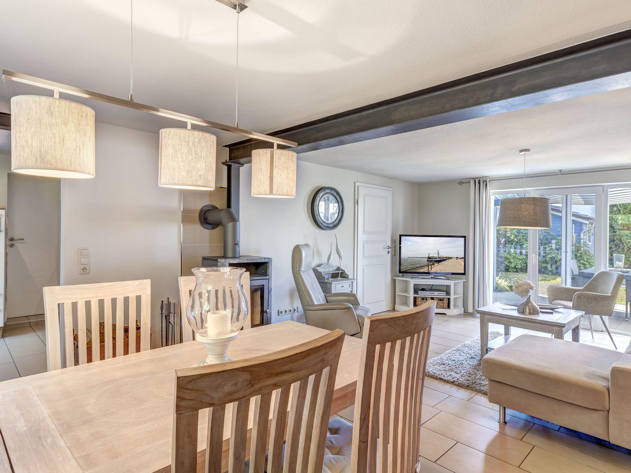 Willkommen im Haffkieker ? Ihrem Traumziel für einen unvergesslichen Aufenthalt! Der großzügige Wohn-Essbereich bietet Platz für bis zu 4 Personen und lädt mit einer gemütlichen Couch zum Entspannen ein. An kühlen Abenden sorgt der Kamin für wohlige Wärme und eine behagliche Atmosphäre. Vom Wohnbereich aus gelangen Sie direkt auf die möblierte Terrasse, ideal für entspannte Stunden im Freien!