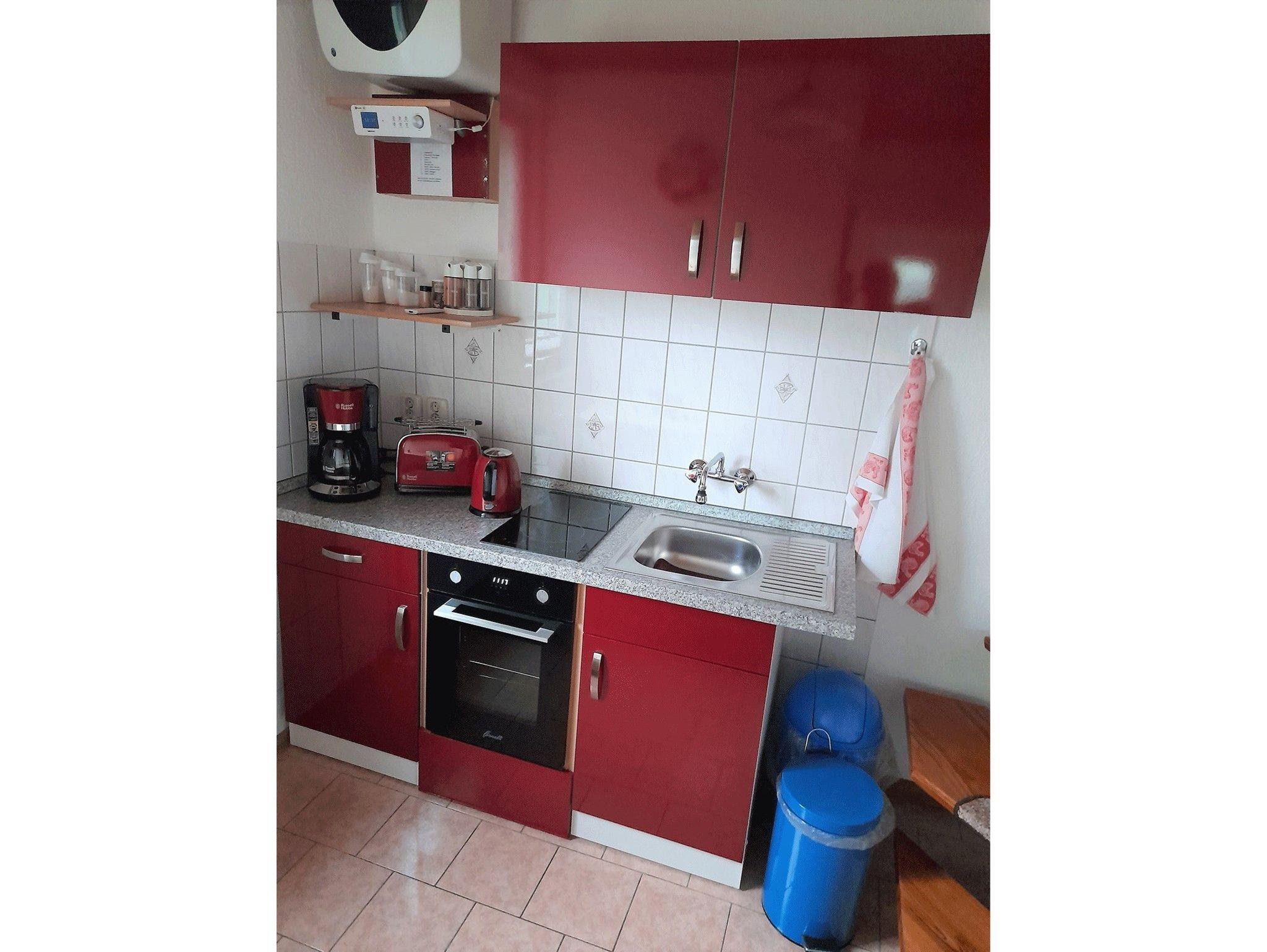 Die modern eingerichtete 2-Raum-Ferienwohnung (45 qm) verfügt im Erdgeschoß über ein Bad (DU/WC), eine separate Küche ausgestattet mit Backofen und zwei Induktionsplatten, Spüle, Kühlschrank mit Gefrierfach, Kaffeemaschine, Wasserkocher, Toaster, Geschirr und Besteck sowie einer kleinen Sitzecke, Esstisch, zwei Stühlen und W-LAN-Radio. Über eine Treppe (innerhalb der Wohnung) erreicht man im 1. Obergeschoß das Schlafzimmer mit einem Doppelpolsterbett (1,80 x 2,00 m), zwei Nachttischen und einem Kleiderschrank. Der Wohnraum (auch im Obergeschoß) ist mit einer Couch & Couchtisch, TV-Flachbildschirm und einer Flachstrecke eingerichtet. Alle Räume im Obergeschoß haben Dachschrägen und sind mit Teppichboden ausgestattet. Kostenfreies WLAN ist verfügbar.