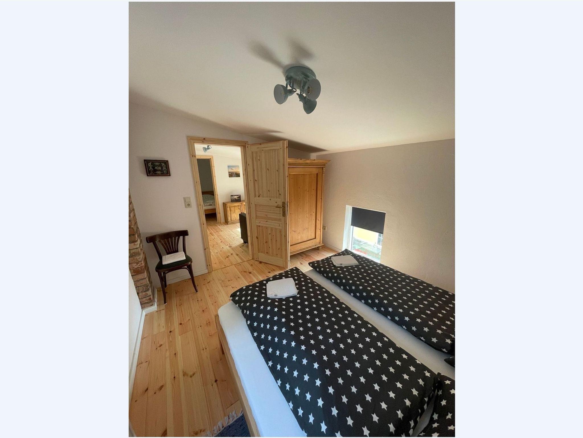 Eine Holztreppe führt Sie in das Obergeschoss, wo sich zwei liebevoll eingerichtete Schlafzimmer befinden, jeweils mit einem komfortablen Doppelbett.