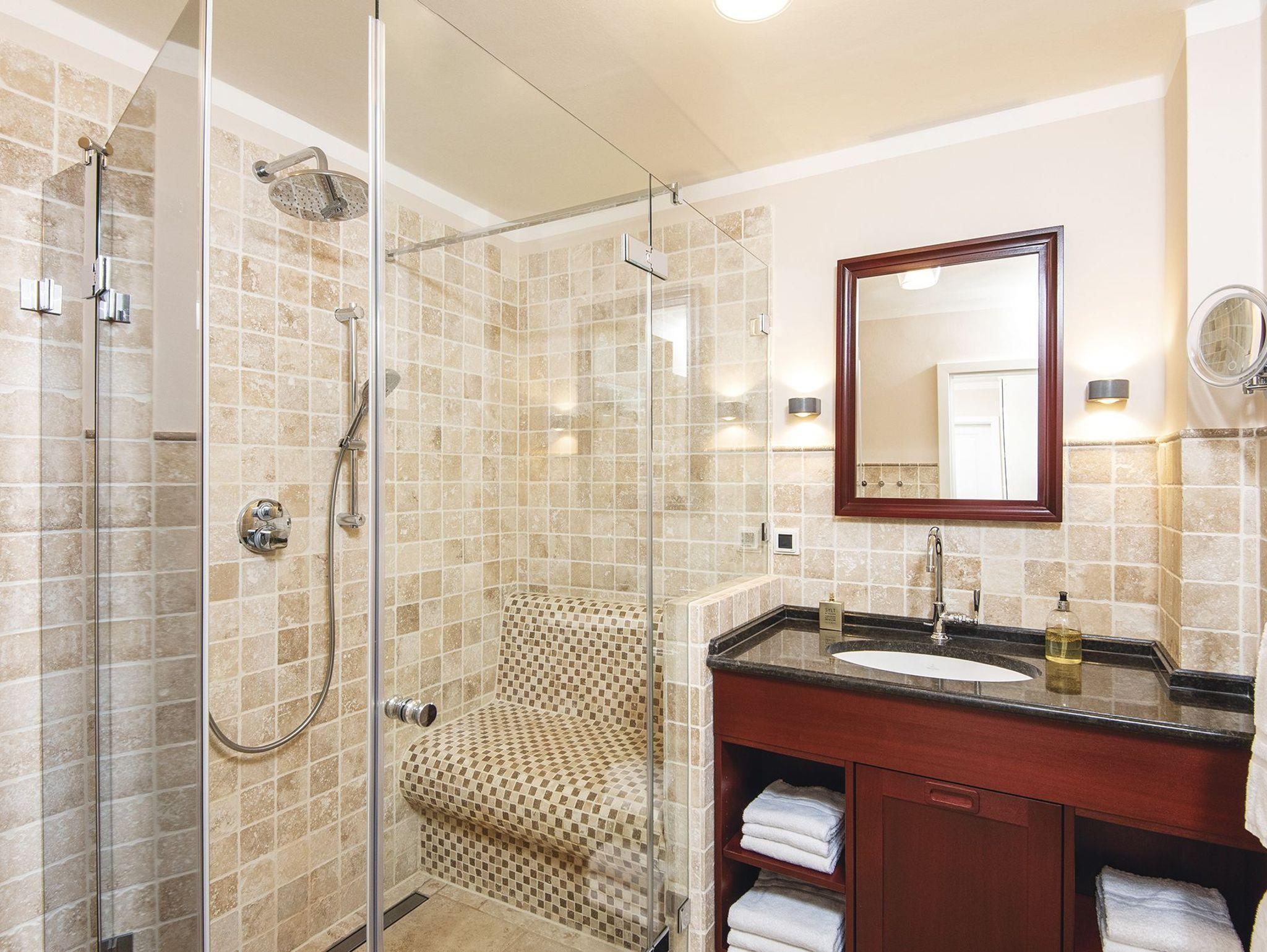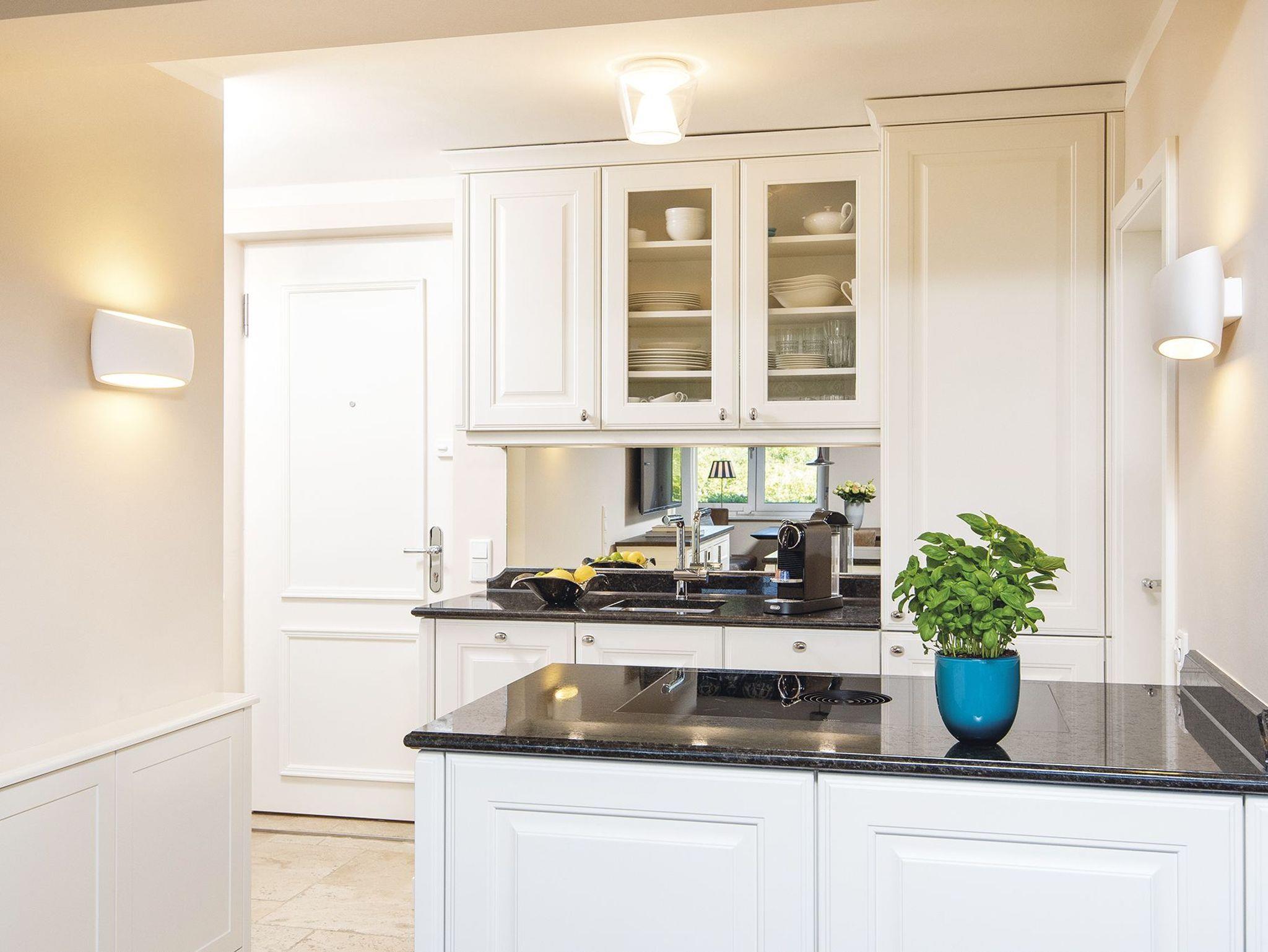 Traumhafte Lage auf dem Roten Kliff, umgeben von viel Grün mitten im Naturschutzgebiet. Diese Erdgeschosswohnung in einem gepflegten Appartementhaus unter Reet ist hochwertig und mit etwas maritimem Flair eingerichtet. Von dem kleinen Flur aus erreicht man durch die offene Küche mit Kochinsel das elegante Wohnzimmer. De Sede Ledermöbel, ein Wand-TV und ein toller Dünenblick über die Terrasse mit Strandkorb gen Westen sind hier die Vorzüge. Hinter der nächsten Tür erwartet Sie ein Doppelschlafzimmer mit Einbauschränken, TV und kleinem Arbeitsplatz vor dem Fenster, hier lockt der beruhigende Ausblick über Dünen und Sylter Heckenrosen. Ebenfalls vom Flur gehen auch das kleine Schlafzimmer mit Kojenbett, plus einem ausziehbaren Gästebett bzw. zusätzlichem Einzelbett für ein Kind und TV, sowie das elegante Bad mit Sitzdusche im XXL-Format ab. Das Quartier ist komplett mit Holzdielen und Natursteinböden ausgelegt.