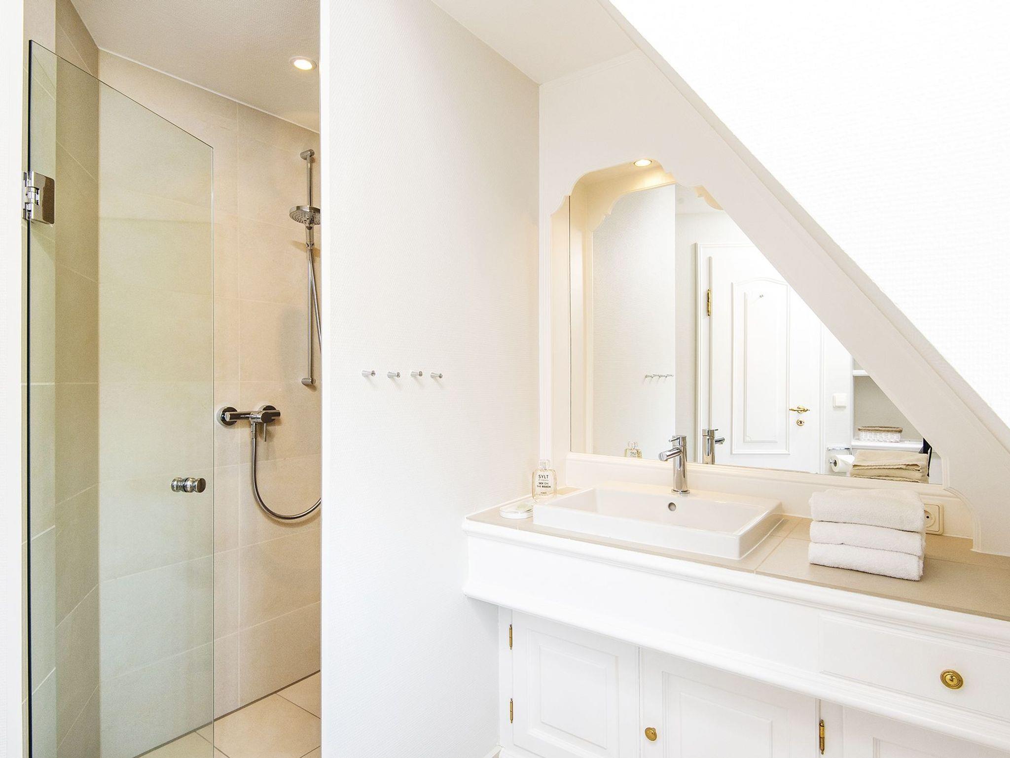 Gemütliches Ambiente nur einen kleinen Fußmarsch von Kampens Zentrum entfernt und alles, was vier Personen zum Wohlfühlen brauchen. Schon der Weg zum Haus führt Sie durch einen romantisch eingewachsenen Gang. Vom kleinen Flur gelangt man direkt in den behaglichen Wohnbereich mit Kamin und Essecke für Vier, offener Küche und Zugang zur Terrasse gen Westen samt Strandkorb. Das Hausteil hat ein Doppelschlafzimmer mit Duschbad im Obergeschoss und ein weiteres Doppelschlafzimmer mit Wannenduschbad im Untergeschoss. Das gesamte Hausteil ist mit Fliesen und Laminat ausgelegt.
