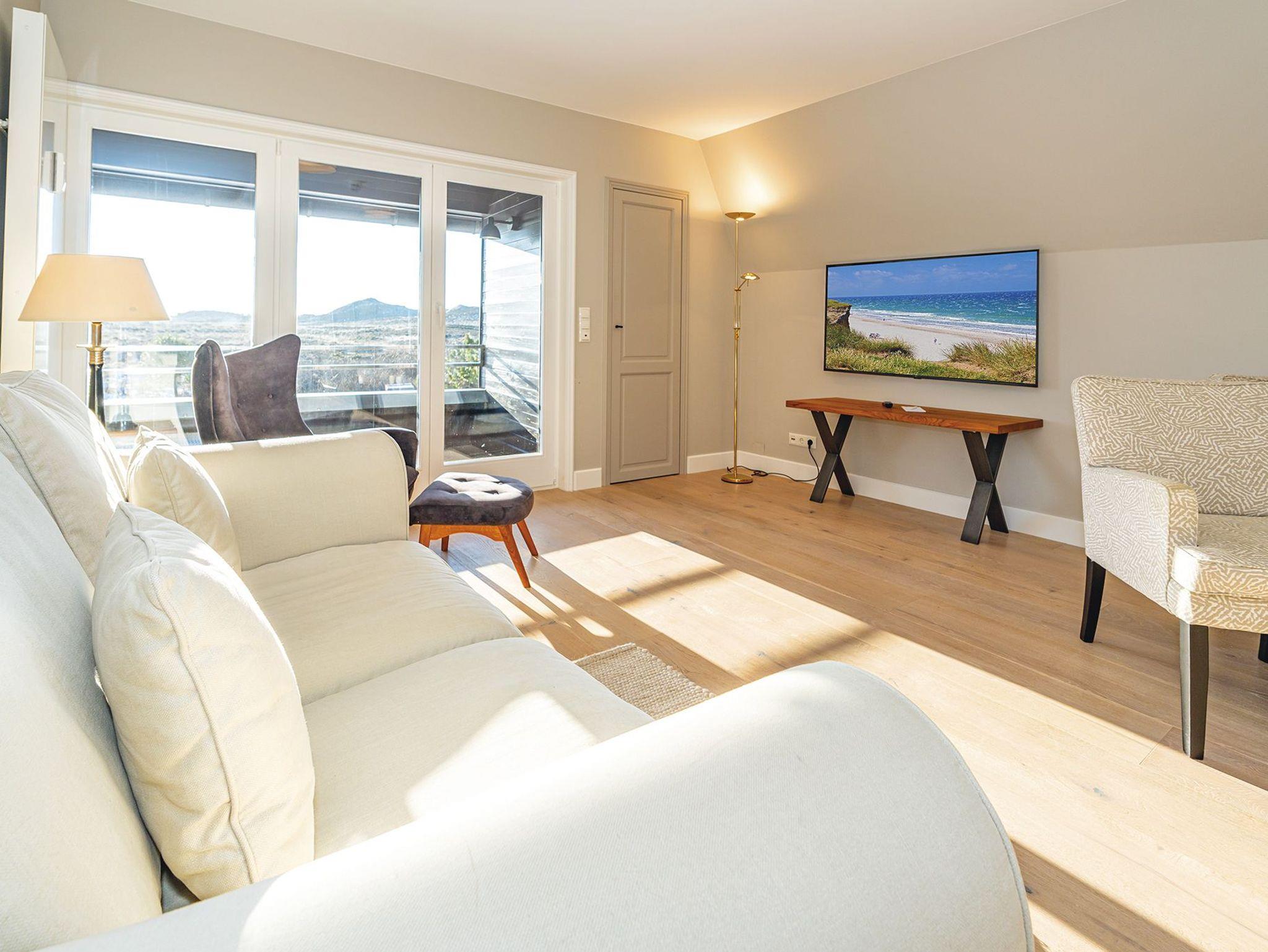 Dieses zauberhafte Quartier für Drei erwartet Sie im 1. OG eines gepflegten Appartementhauses in der Kurhausstraße. Der Eingangsbereich mit Gäste-WC schließt direkt an die elegante offene Küche und den kombinierten WohnEssbereich an. Hier überzeugt sofort der tolle Panoramaausblick über die Kampener Heidelandschaft vom Leuchtturm Langer Christian bis hin zur Uwe Düne, sowie der gemütlich geschützte Südbalkon. Der gleiche schöne Ausblick erfreut im Einzelschlafzimmer mit französischem Bett und Chaiselongue im Obergeschoss des Quartiers. Ein weiteres Schlafzimmer für Zwei und je ein Dusch- und Wannenbad, sowie hochwertige Tischlereinbauten in einheitlichem Stil komplettieren diese Etage. Das gesamte Quartier ist frisch renoviert und verkörpert eine moderne Interpretation des Landhausstils in Grau- und Weißtönen mit schmuckem Holzfußboden.