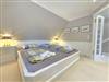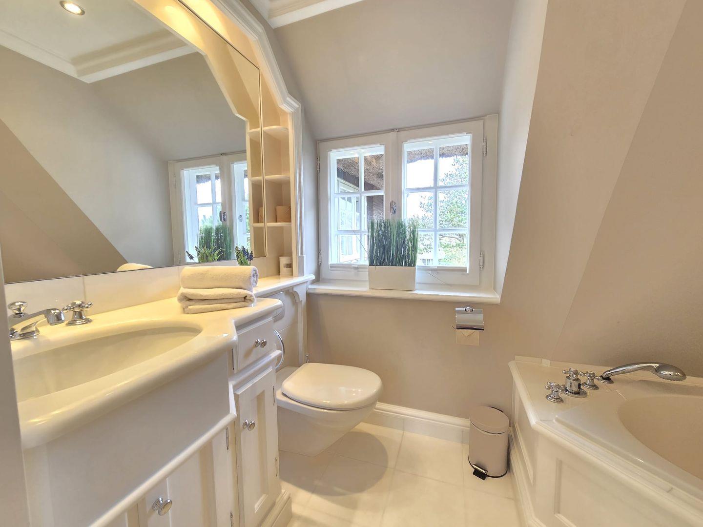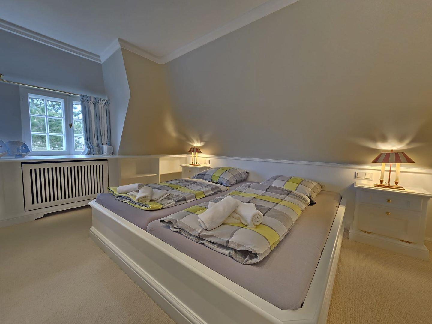 Das Obergeschoss des Hauses verfügt über ein großzügiges Schlafzimmer mit einem großen Doppelbett (2,00 m x 2,00 m), einem kleinen Schreibtisch und einem Fernseher. Auf gleicher Ebene erwartet Sie ein Vollbad mit Badewanne und Dusche.