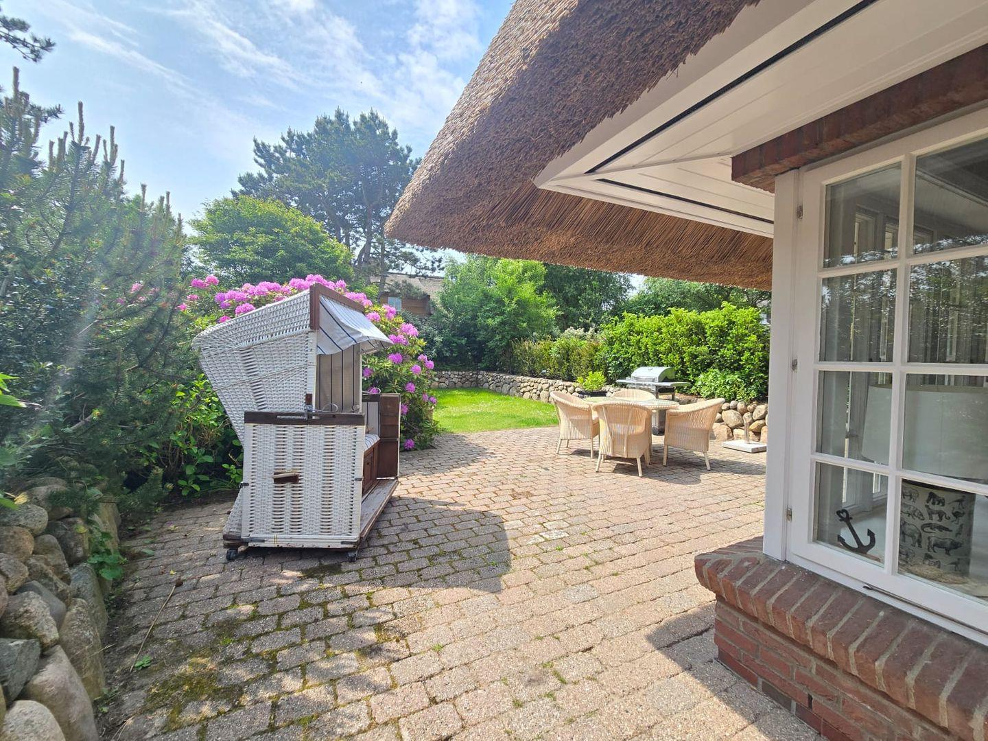 Vom Wohnbereich aus betreten Sie die möblierte Terrasse. Der Garten ist mit hochwertigen Garpa Gartenmöbeln, Garpa Liegen und einem Strandkorb ausgestattet.