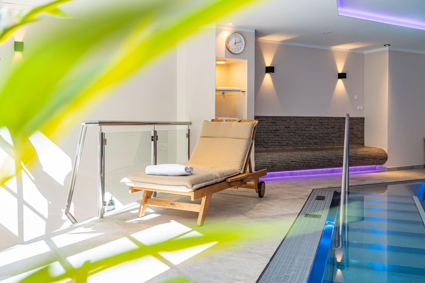 Die neue und moderne Küche bietet alles was es benötigt um kleine oder auch größere Köstlichkeiten zubereiten zu können. Das Badezimmer ist mit Natursteinboden, Regendusche, WC, Waschtisch und Haartrockner ausgestattet. Im Haus befindet sich ein neu sanierter Wellnessbereich mit Pool und Saunen zur gemeinschaftlichen Nutzung.