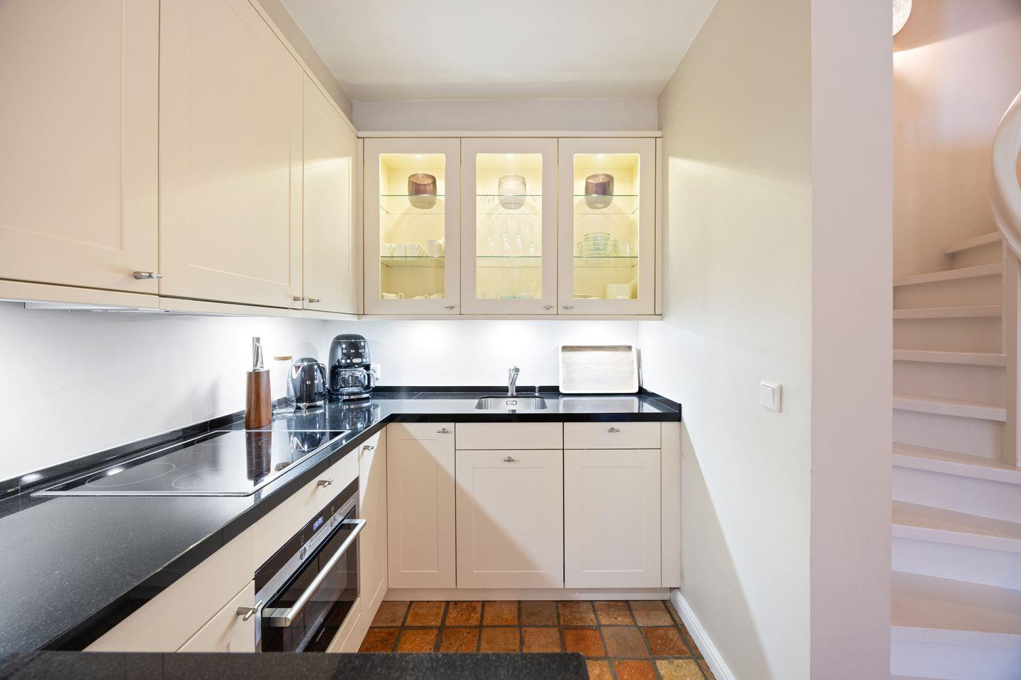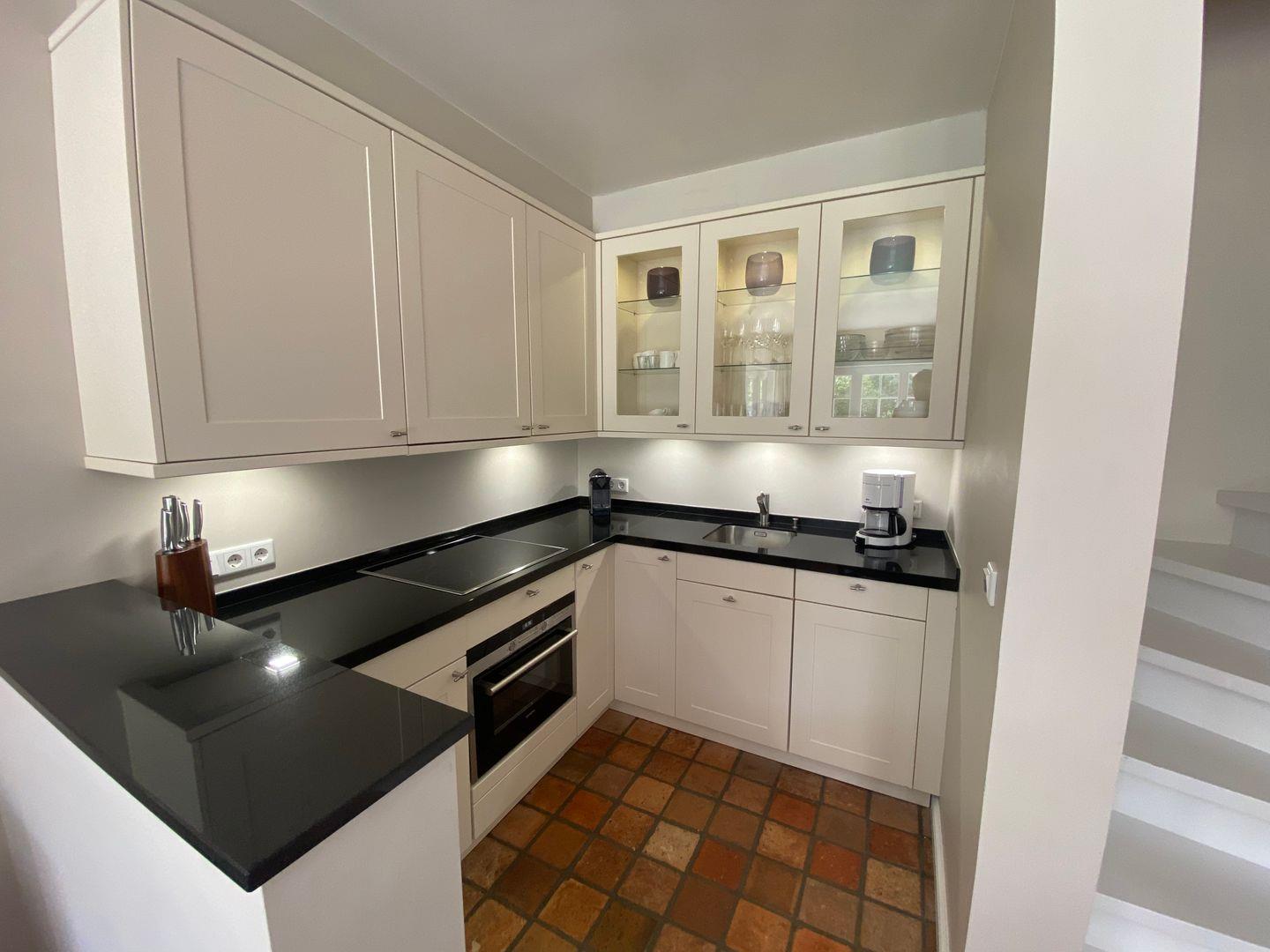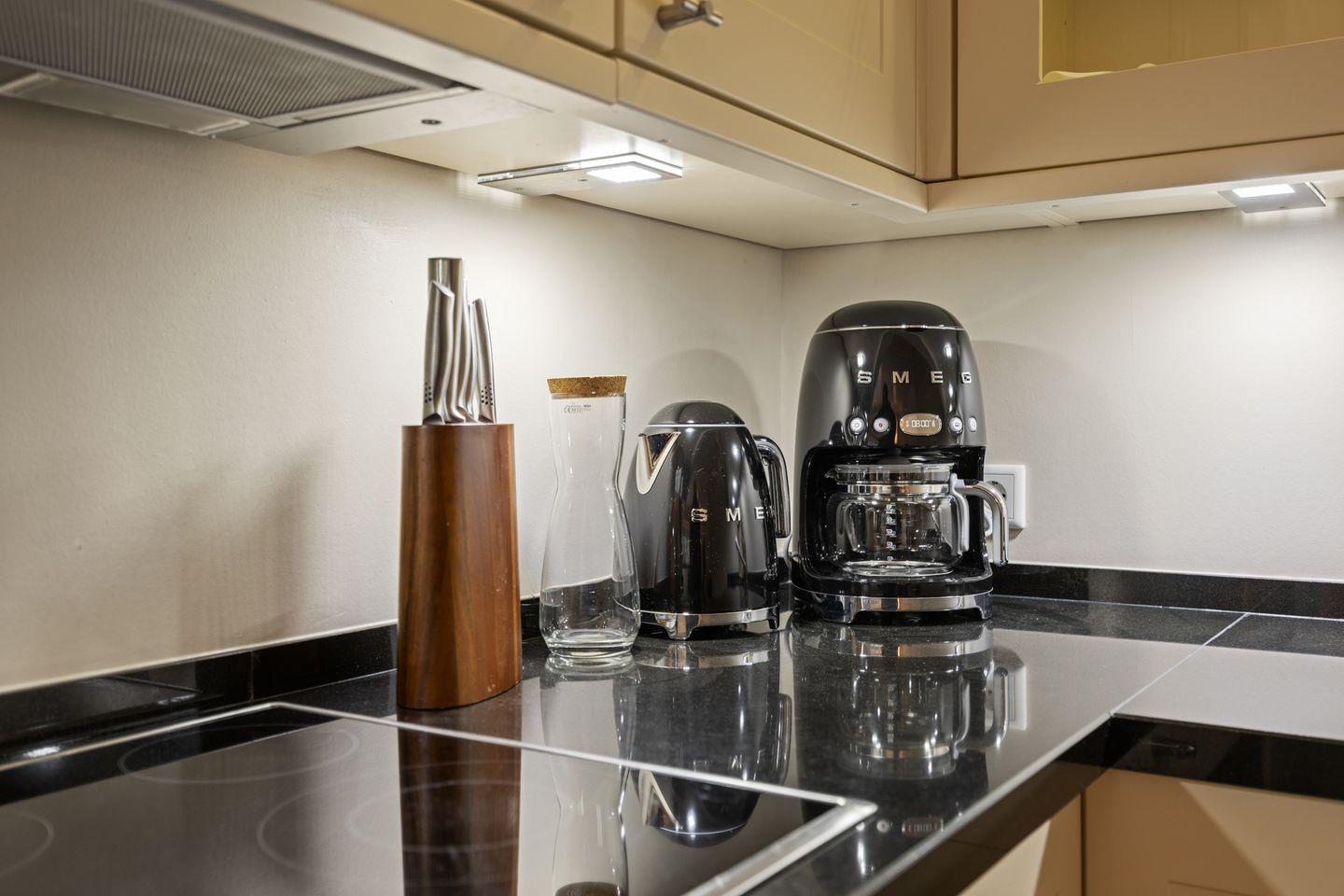 Die Küche ist mit hochwertigen Geräten der Marke Smeg ausgestattet und lässt keine Wünsche offen. Hier finden Sie alles, was Sie für die Zubereitung köstlicher Mahlzeiten benötigen – inklusive einer Nespressomaschine für den perfekten Start in den Tag. Der direkte Zugang zur möblierten Terrasse mit einem typischen Sylter Strandkorb und stilvollen Gartenmöbeln lädt zu entspannten Stunden im Freien ein.