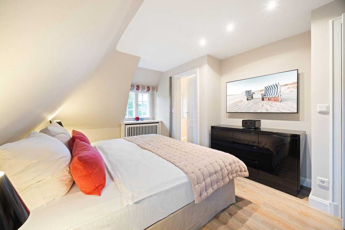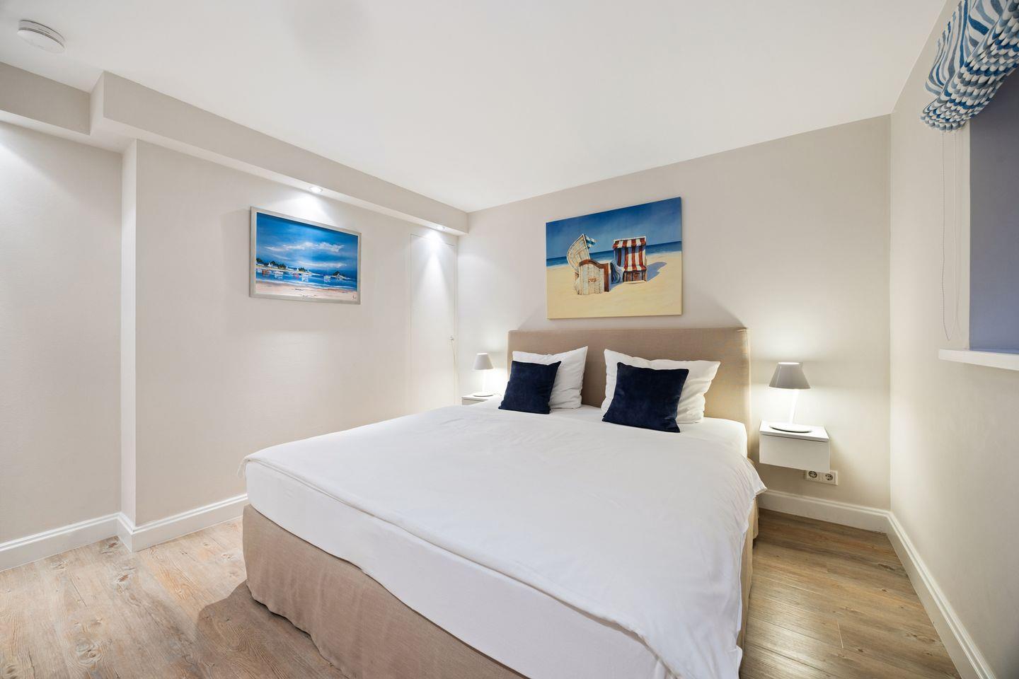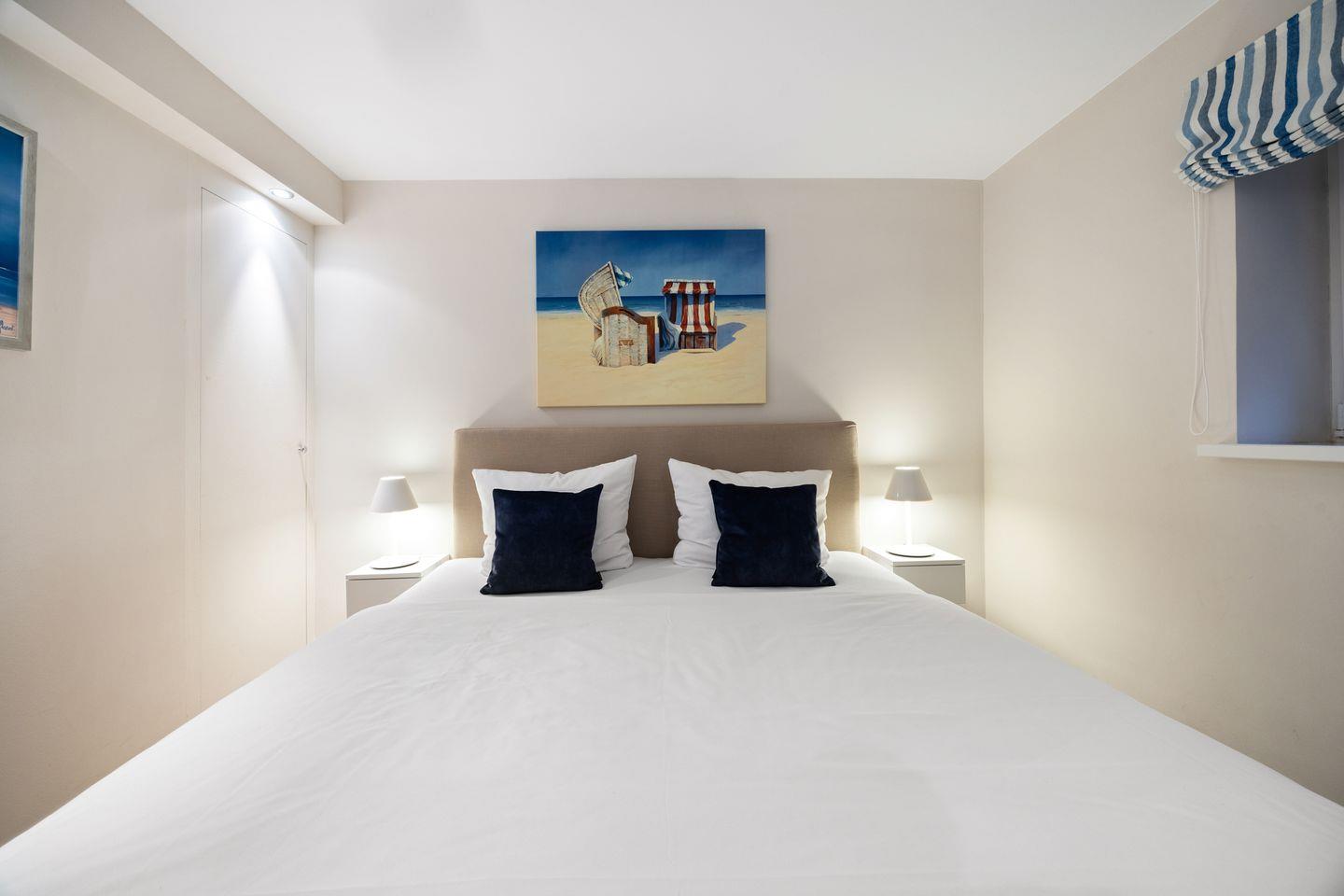 Die beiden Schlafzimmer bieten höchsten Schlafkomfort und stilvolles Design. Das Hauptschlafzimmer verfügt über ein Kingsize-Bett (180x200 cm) mit elektrisch verstellbaren Lattenrosten, einen Flatscreen-TV sowie ein En-Suite Badezimmer und einen kleinen begehbaren Kleiderschrank. Das zweite Schlafzimmer ist ebenfalls mit einem Doppelbett (180x200 cm) und einem Flatscreen-TV ausgestattet und bietet direkten Zugang zu einem modernen Badezimmer mit Wanne und Dusche sowie einer Sauna – perfekt für entspannte Stunden nach einem Tag am Strand.