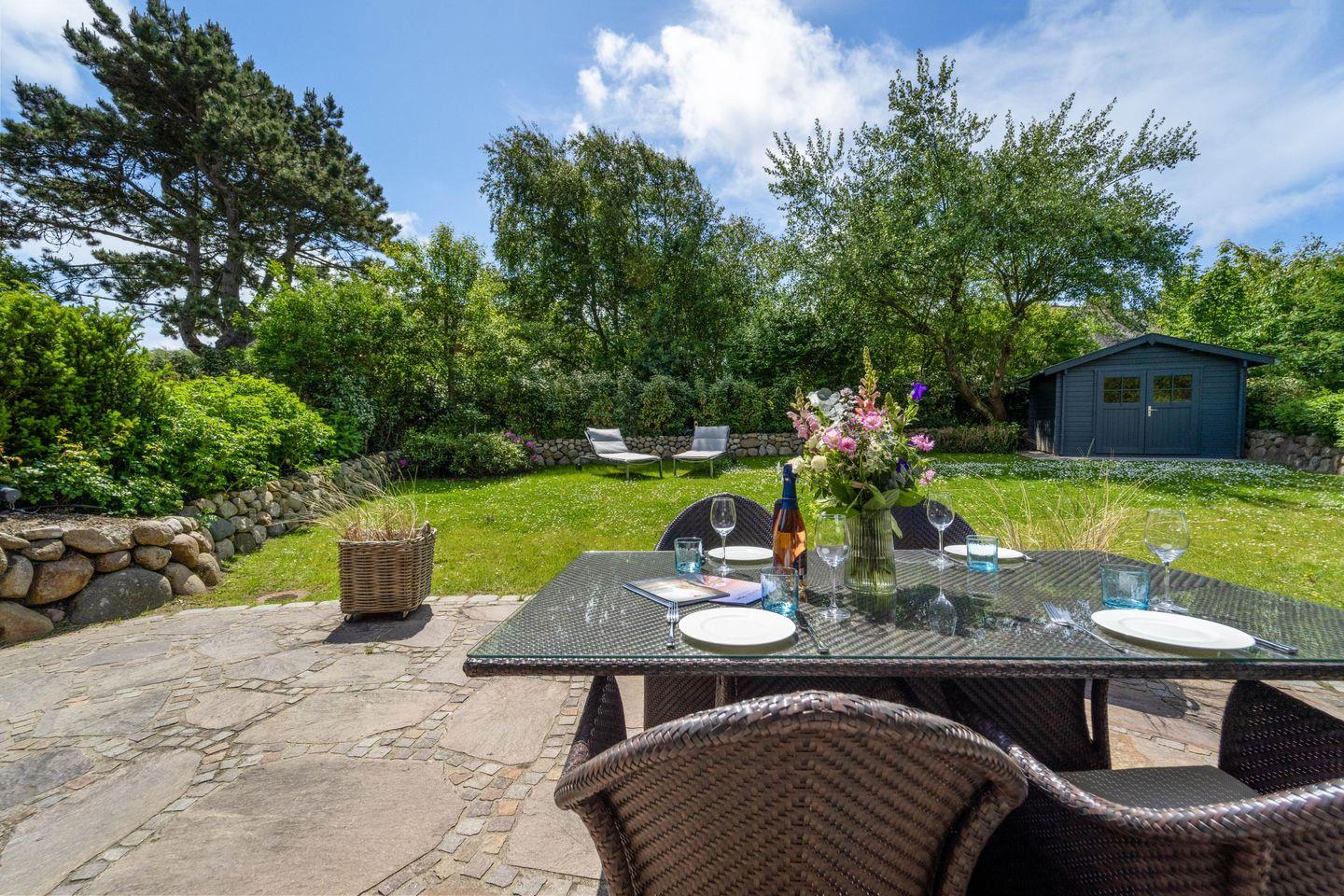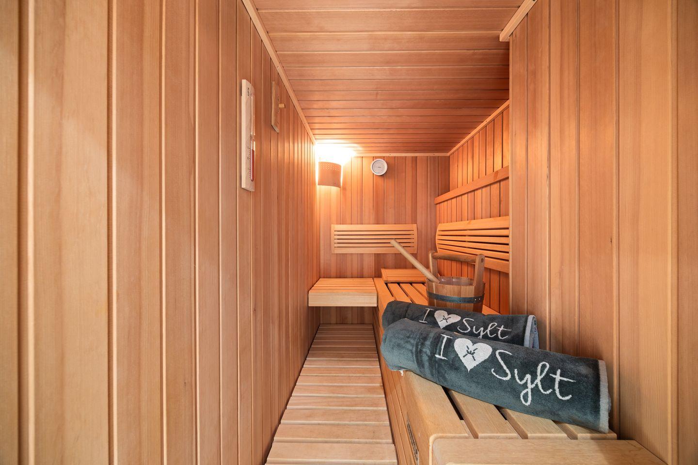 Das moderne Badezimmer mit Wanne und Dusche sowie einer privaten Sauna bietet zusätzlichen Luxus und Wohlbefinden. Der idyllisch eingewachsene Garten mit der sonnigen Südterrasse ist der ideale Ort, um die frische Nordseeluft zu genießen. Entspannen Sie im Strandkorb oder auf den stilvollen Sonnenliegen und lassen Sie die Seele baumeln.