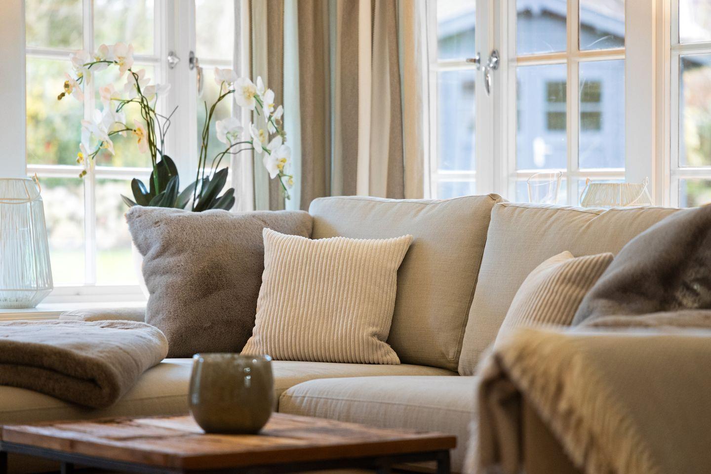 Der lichtdurchflutete Wohnbereich im Erdgeschoss beeindruckt mit stilvollem Design und hochwertiger Ausstattung. Die einladende Couch sorgt für eine gemütliche Atmosphäre, ideal für entspannte Abende nach einem erlebnisreichen Tag auf Sylt. Große Fenster bieten einen herrlichen Blick in den idyllischen Garten und lassen viel Tageslicht in den Raum. Der angrenzende Essbereich und die moderne, offene Küche bieten viel Raum für gemeinsame Mahlzeiten.
