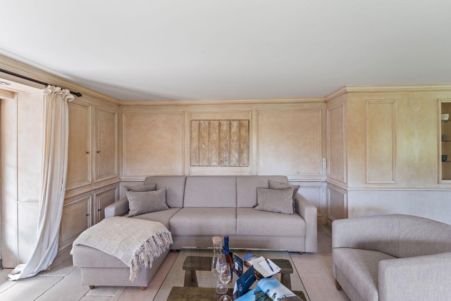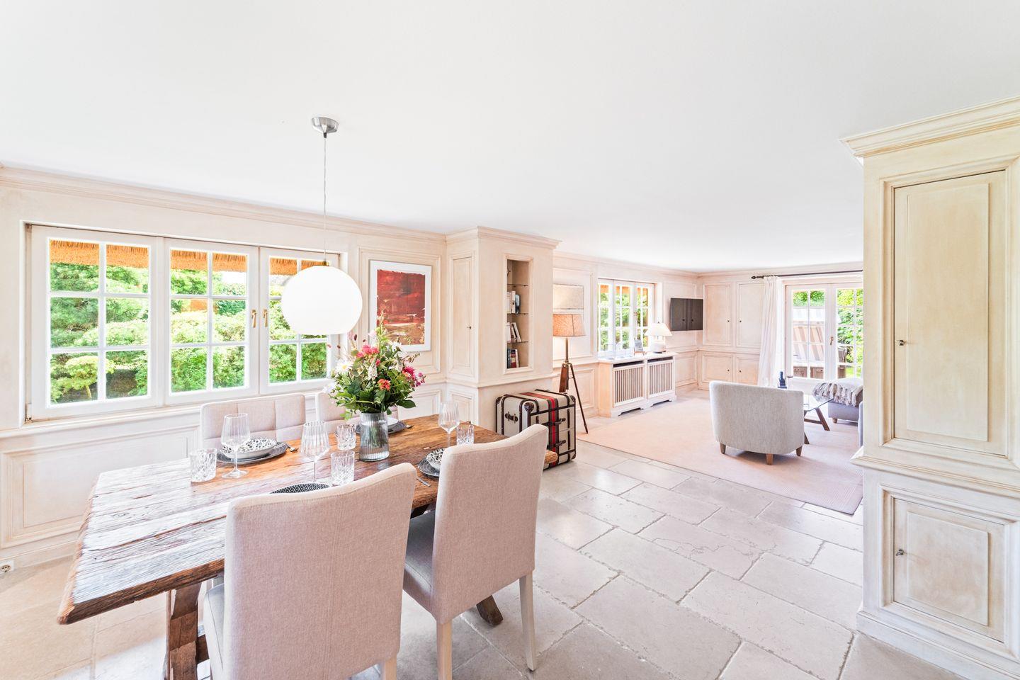 Im offenen Wohn- und Essbereich empfängt Sie eine behagliche Atmosphäre. Weiche Sofas laden zu gemütlichen Stunden bei einem Glas Wein ein, während der großzügige Esstisch aus friesischem Holz der perfekte Ort für gemeinsame Mahlzeiten oder gesellige Abende ist. Große Fenster lassen viel Tageslicht herein und bieten Ausblicke auf den liebevoll angelegten Garten.