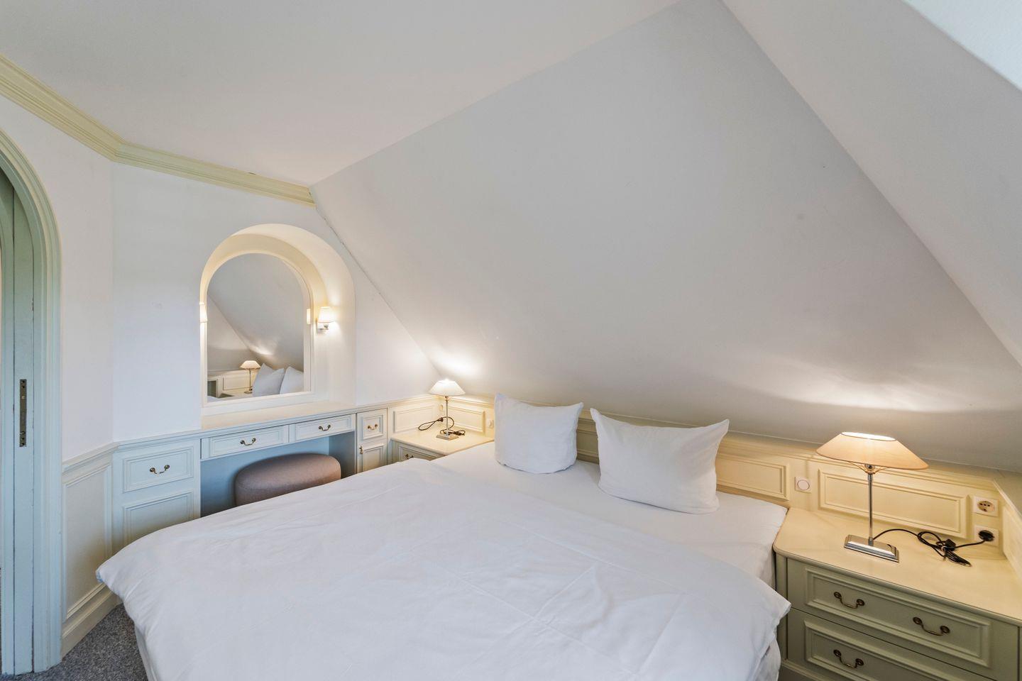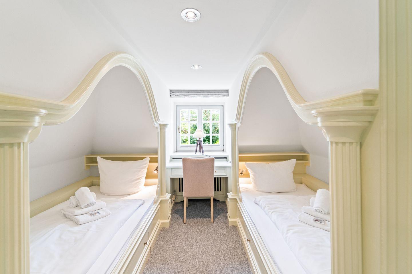 Die beiden Schlafzimmer versprechen süße Träume: Das Hauptschlafzimmer mit einem komfortablen Doppelbett und maßgefertigten Tischlereinbauten ist eine wahre Wohlfühloase. Das zweite Schlafzimmer bietet zwei bequeme Einzelbetten und ebenfalls maßgefertigte Einbauten – ideal für Kinder oder weitere Gäste. Ein kleines separates Zimmer mit einem Waschtisch sorgt für zusätzlichen Komfort.