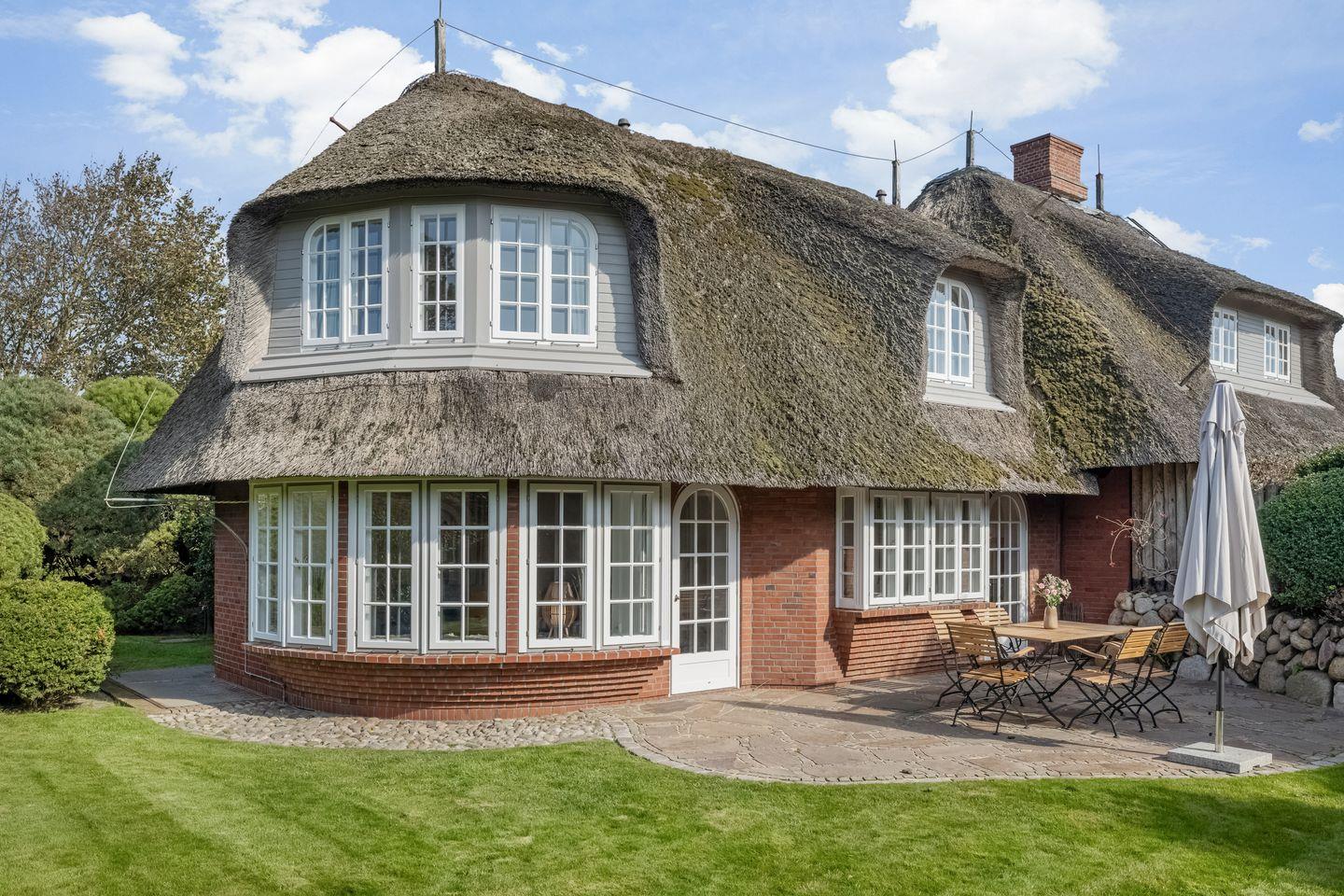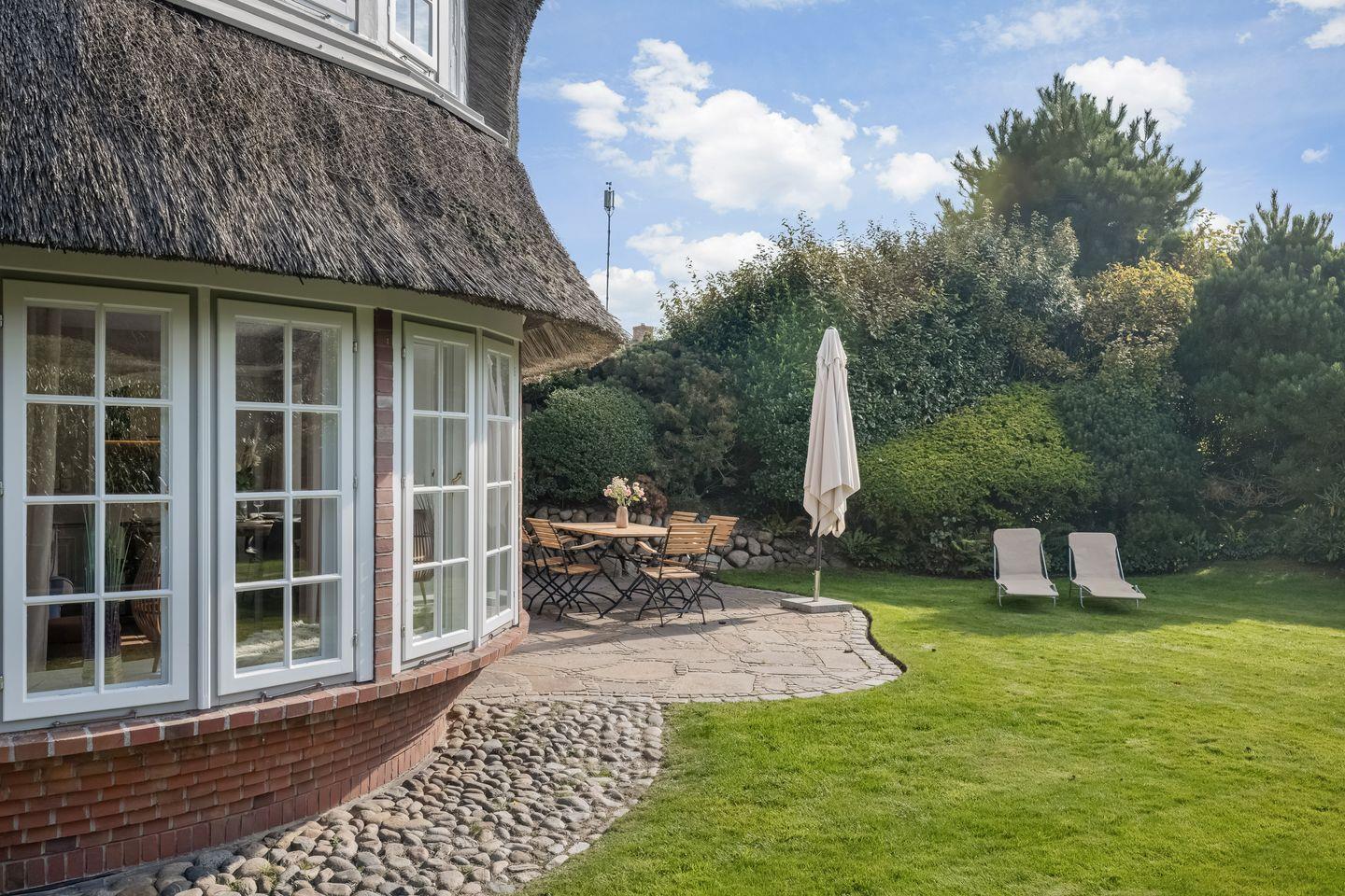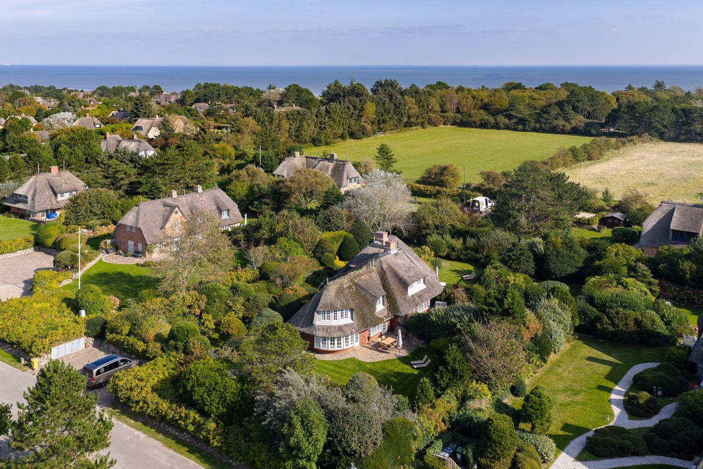 2025 kernsaniertes, exklusives ca. 90 m² großes 5 Sterne Ferienhaus unter Reet für bis zu 5 Pers. samt Sauna und Garten in idyllischer Lage in Kampen. PKW-Stellplatz, WLAN sowie Strandkorb (saisonabhängig) vorhanden. Haustiere sind willkommen.