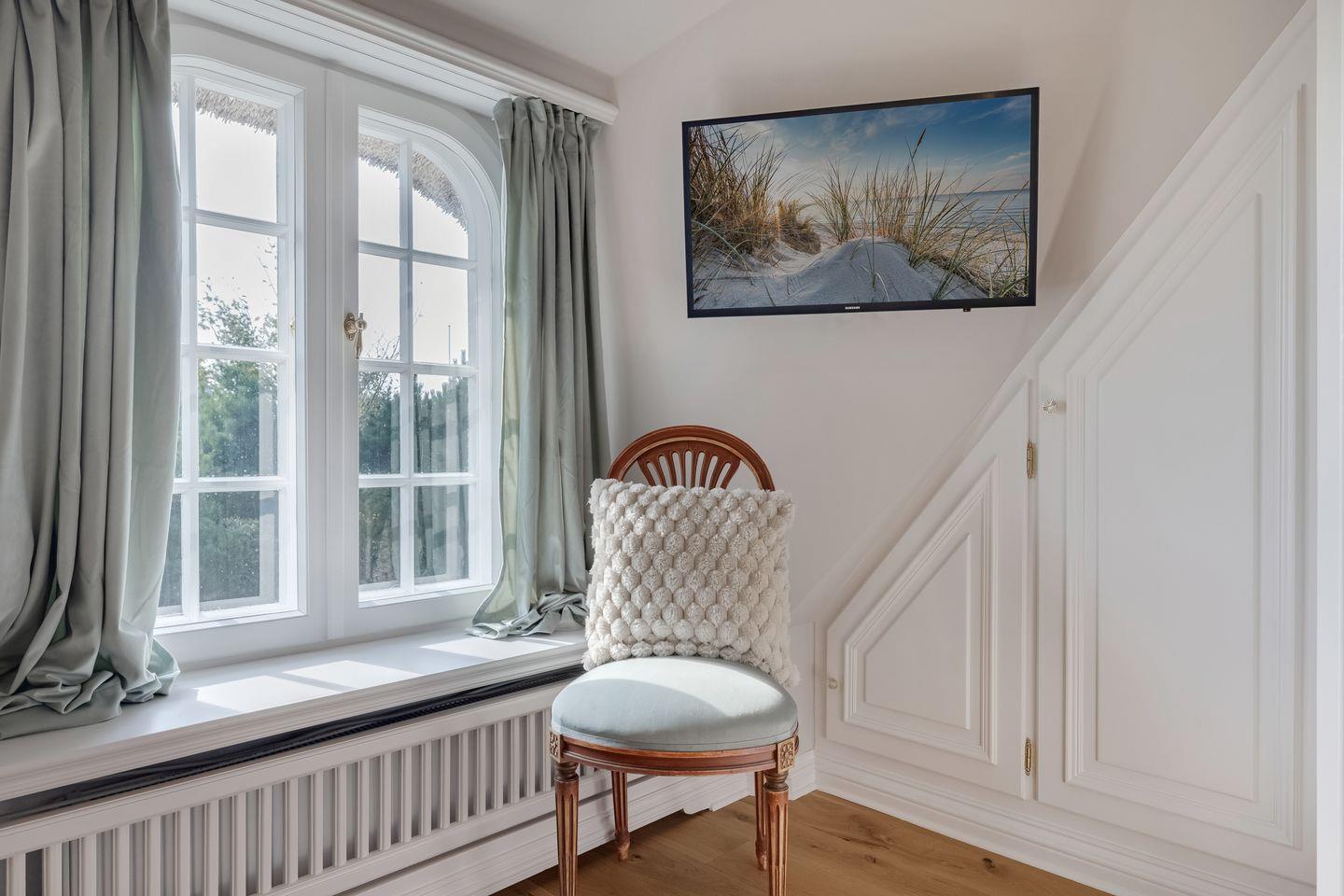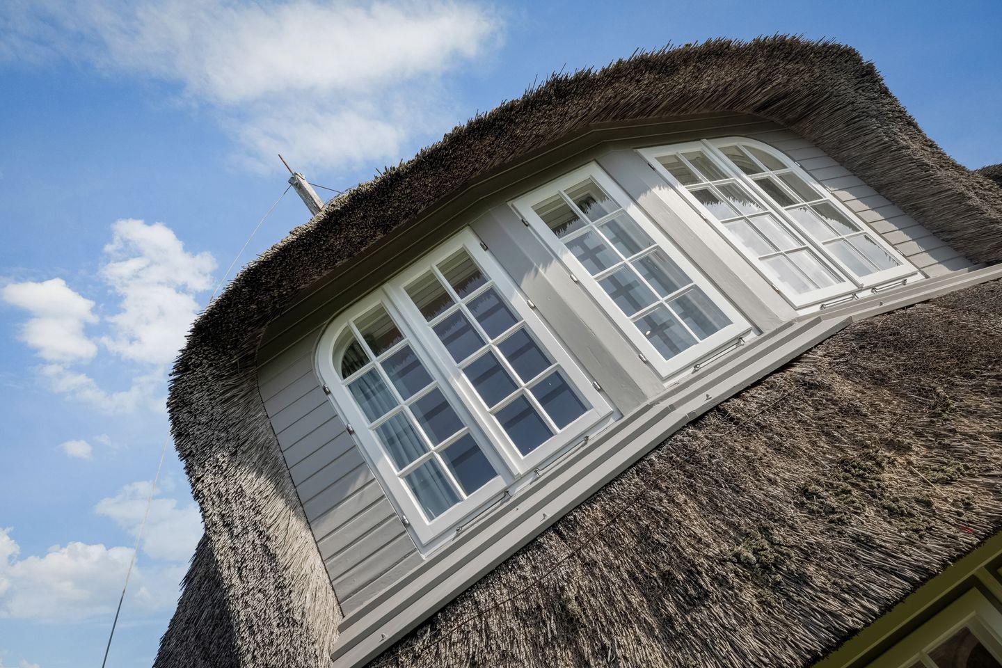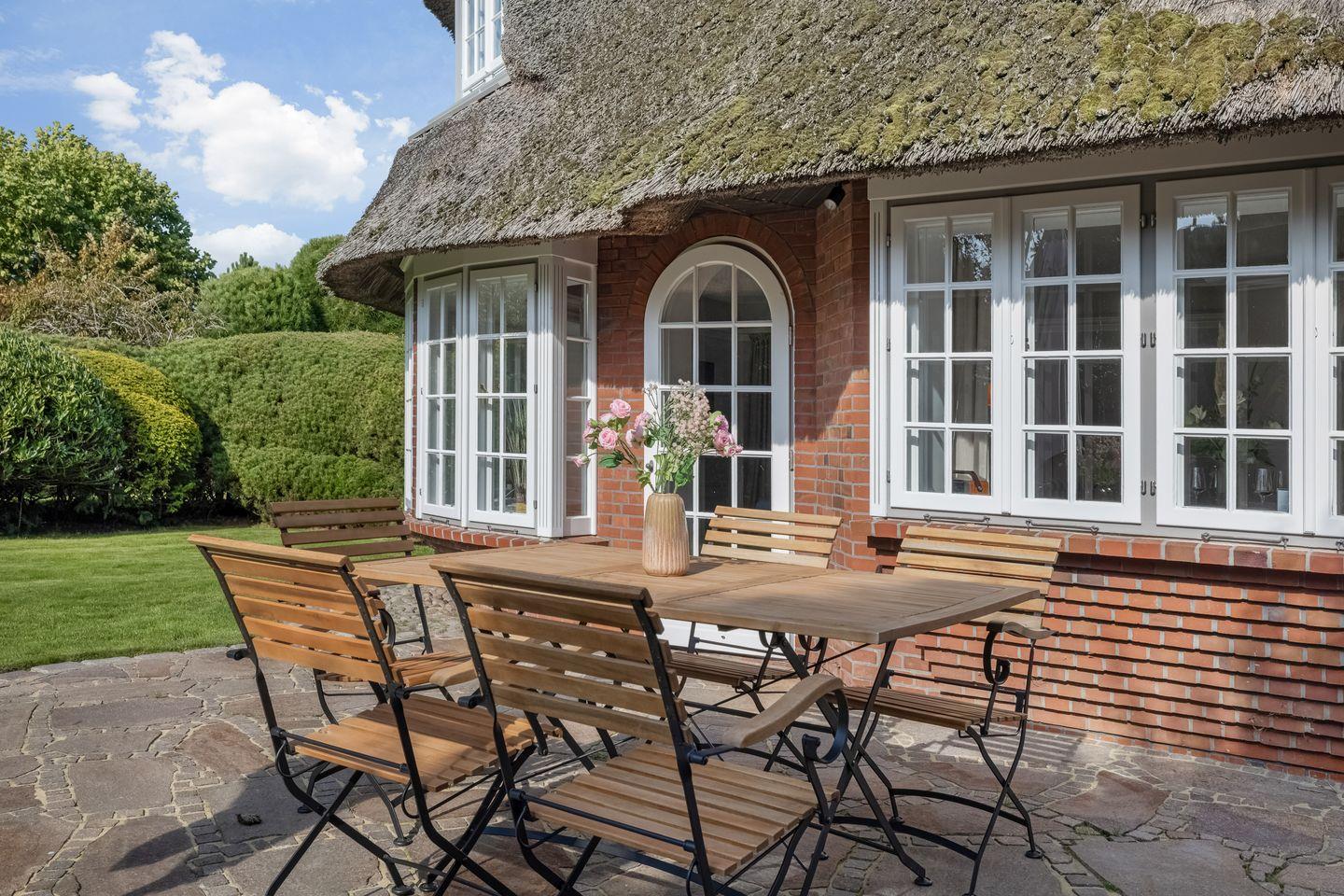 2025 kernsaniertes, exklusives ca. 90 m² großes 5 Sterne Ferienhaus unter Reet für bis zu 5 Pers. samt Sauna und Garten in idyllischer Lage in Kampen. PKW-Stellplatz, WLAN sowie Strandkorb (saisonabhängig) vorhanden. Haustiere sind willkommen.