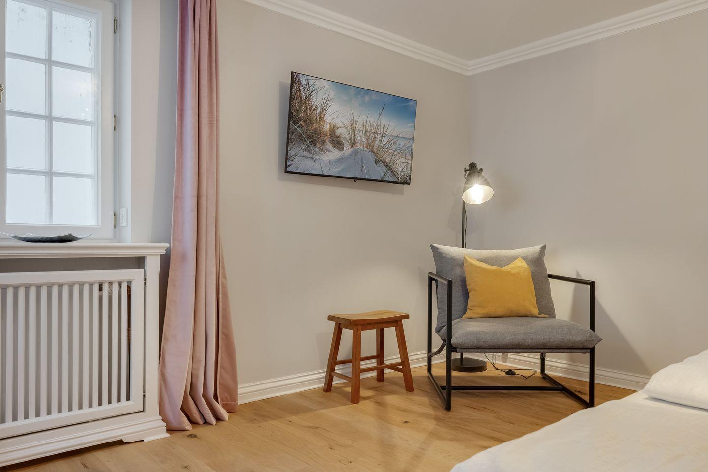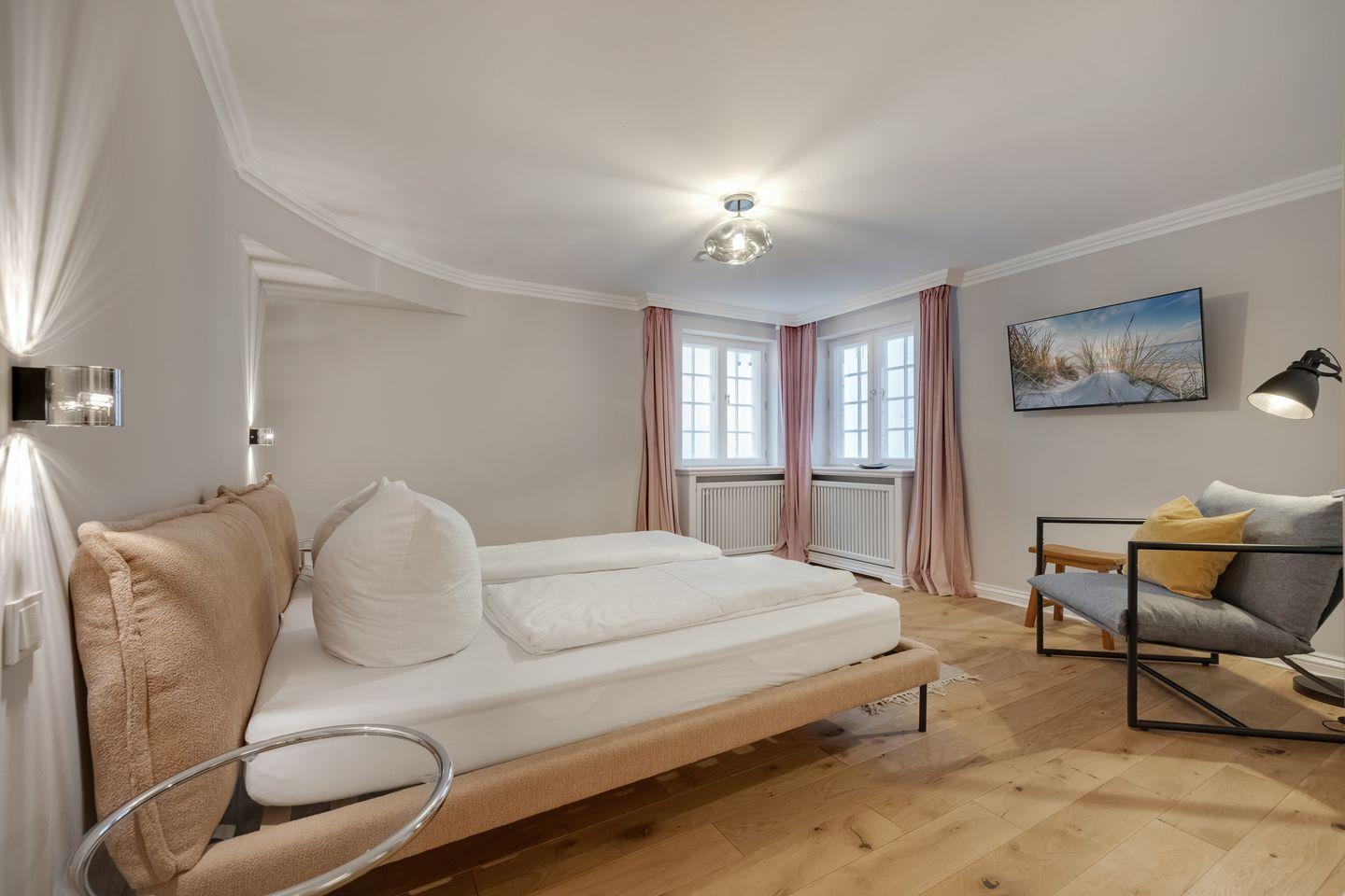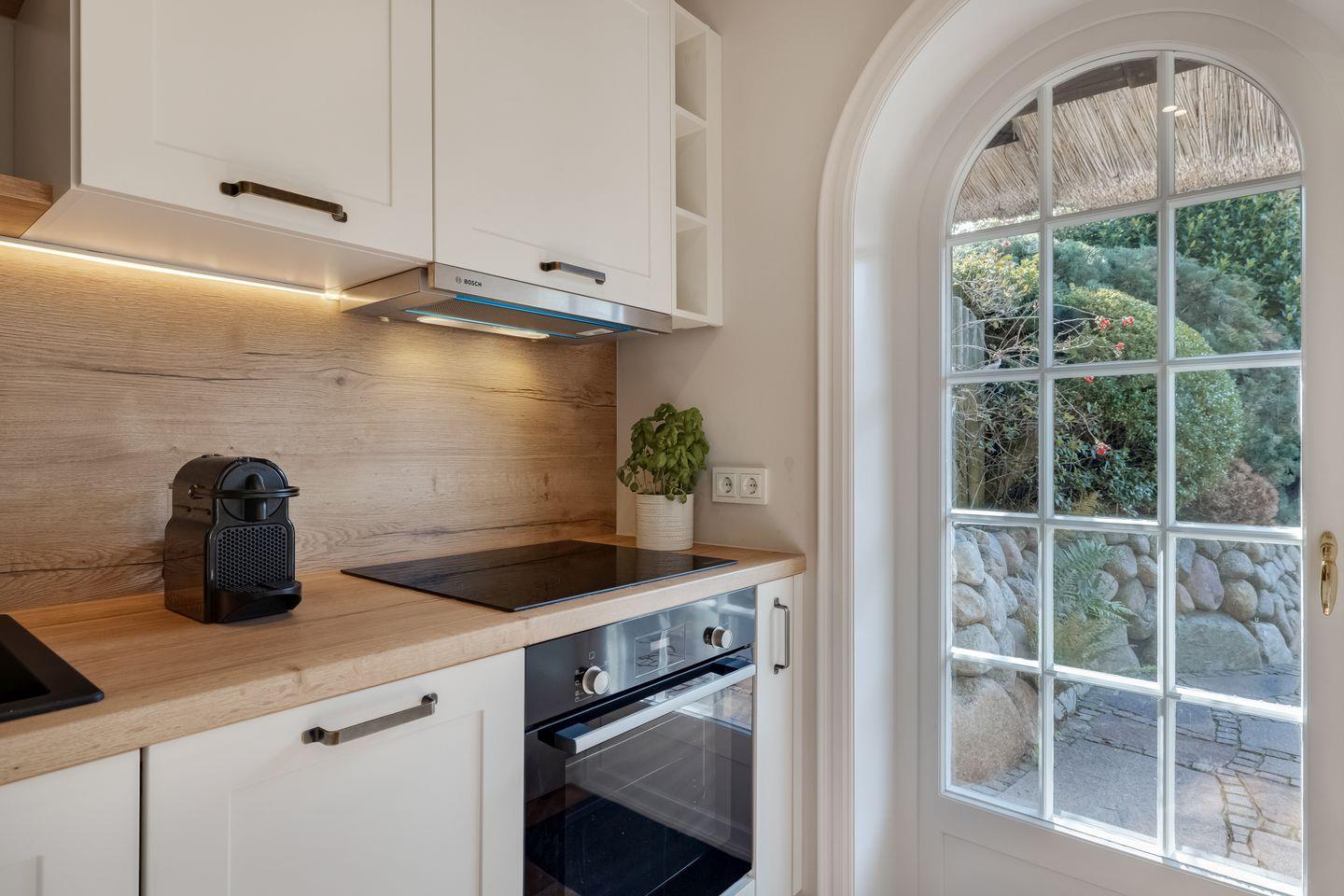 Diese im Jahr 2025 vollständig sanierte, exklusive 5 Sterne Hausscheibe unter Reet bietet auf ca. 90 m² eine großzügige Wohnfläche und bietet Platz für bis zu 5 Personen. Die ruhige, idyllische Lage in Kampen stellt den perfekten Ausgangspunkt dar, um sowohl das malerische Watt im Osten als auch die lebendige Innenstadt von Kampen bequem zu Fuß zu erreichen. Im Erdgeschoss empfängt Sie ein lichtdurchfluteter, offener Wohn- und Essbereich, der dank einer beeindruckenden Fensterfront einen herrlichen Blick auf den eigenen Garten freigibt. Die moderne, offene Küche ist mit hochwertigen Geräten bestens ausgestattet. Das Obergeschoss beherbergt ein gemütliches Doppelschlafzimmer sowie ein weiteres Schlafzimmer mit einem Einzelbett. Das elegante Tageslichtbad ist mit einer Dusche ausgestattet und bietet alles für eine erfrischende Auszeit. Im Souterrain erwartet Sie ein großzügiges Doppelschlafzimmer, ein zusätzliches Duschbad und ein Wellnessbereich mit einer Sauna – der perfekte Ort, um zu entspannen. Hier steht Ihnen ein weiteres Gäste-WC zur Verfügung. Alle Schlafräume und das Wohnzimmer sind mit Smart-TVs ausgestattet, um Ihnen Unterhaltung und Komfort zu bieten. Die Südterrasse mit angrenzendem Garten und einem Strandkorb (saisonabhängig) lädt zu entspannten Stunden im Freien ein. Darüber hinaus stehen Ihnen WLAN, ein eigener PKW-Stellplatz sowie eine Waschmaschine und ein Trockner zur Verfügung. Haustiere sind hier herzlich willkommen, sodass auch Ihr vierbeiniger Begleiter sich wie zu Hause fühlen kann. Erkunden Sie tagsüber den charmanten Ort Kampen und die Insel Sylt und lassen Sie den Abend in gemütlicher Runde ausklingen.