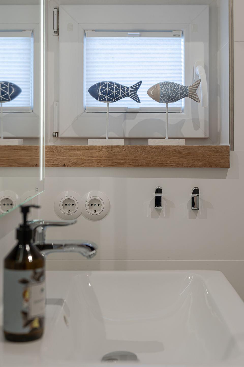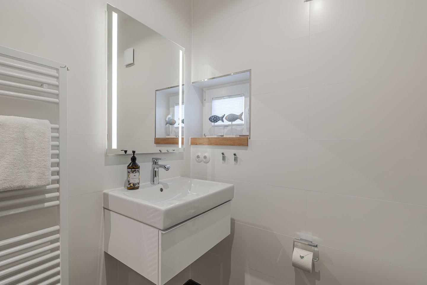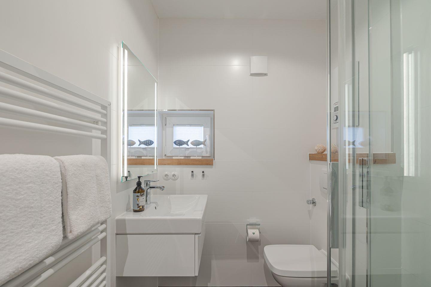 Das moderne Duschbadezimmer mit Fenster bietet Komfort für Ihren Aufenthalt.