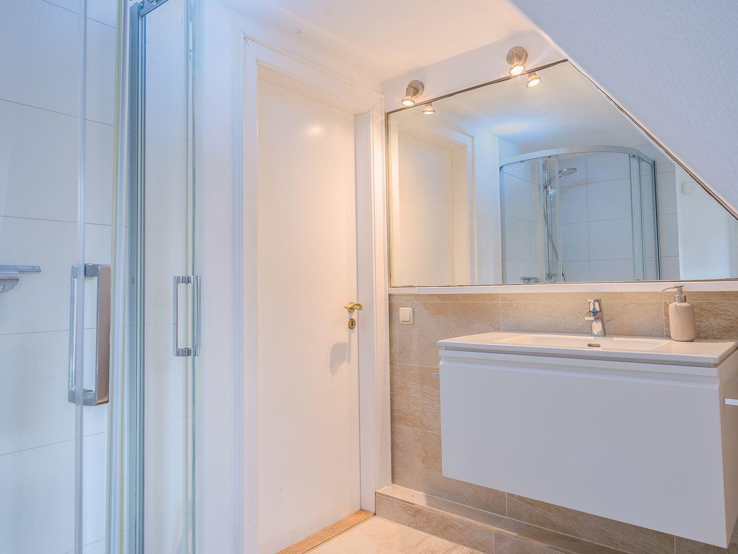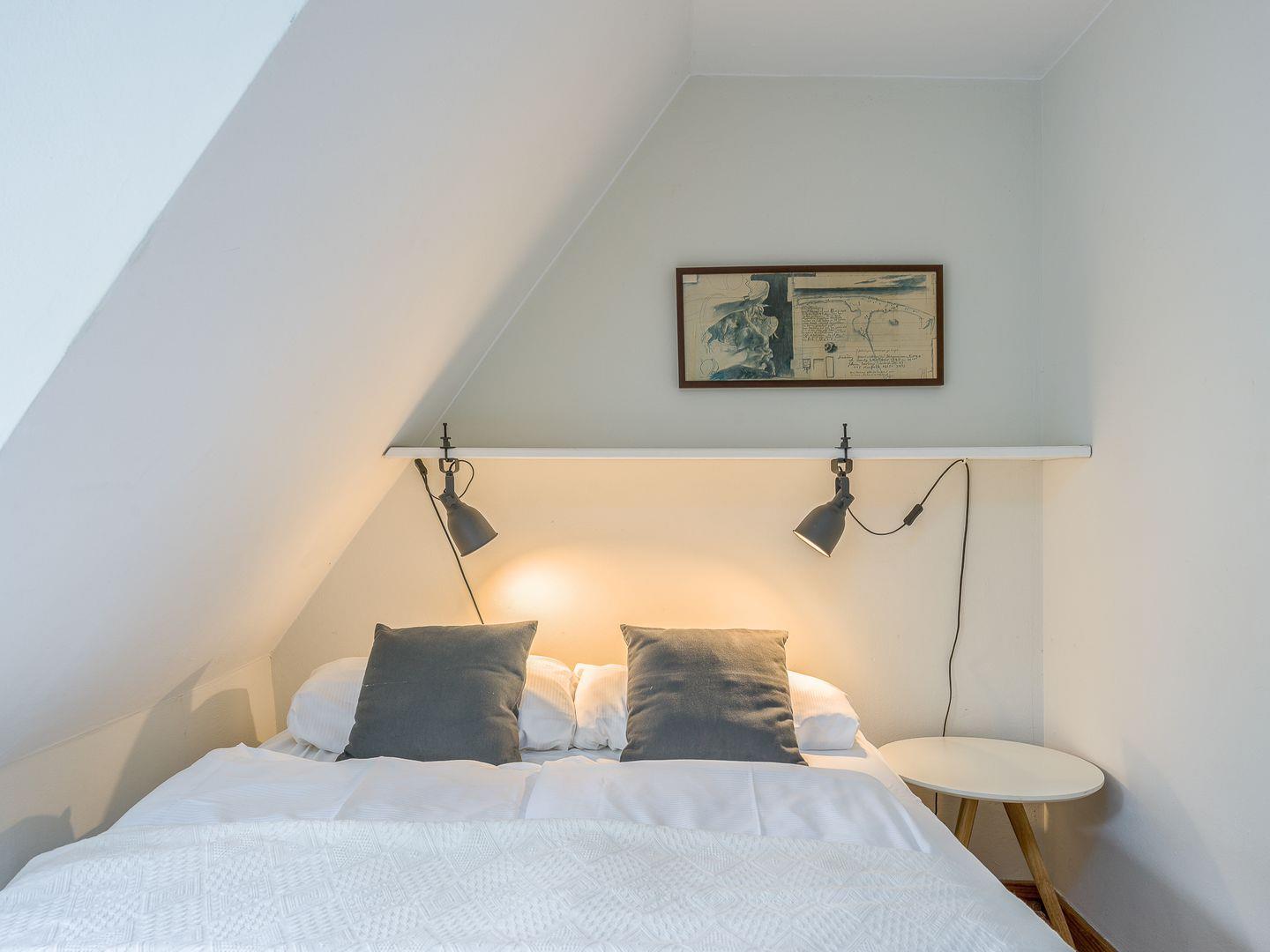 Hinter einer Schiebetür versteckt sich die moderne Küche, die mit allem Nötigen ausgestattet ist. Zusätzlich befindet sich noch ein Gäste-WC im Erdgeschoss. Eine Treppe höher geht es zu den beiden Schlafzimmern, von denen eines mit einem Doppelbett (140x200cm) sowie eine weiteres mit zwei Einzelbetten (90x200cm) ausgestattet ist. Im Obergeschoss befindet sich auch das geräumige Duschbad mit Tageslicht.