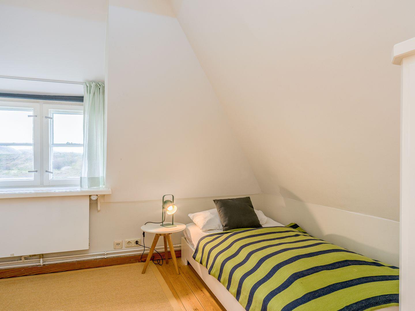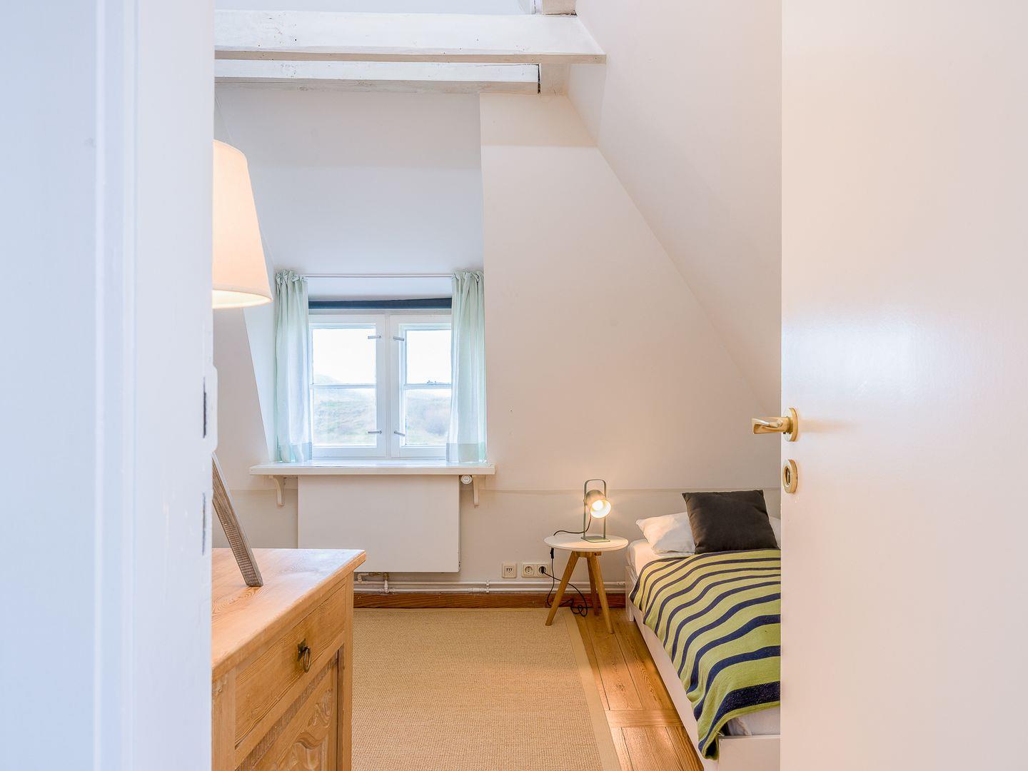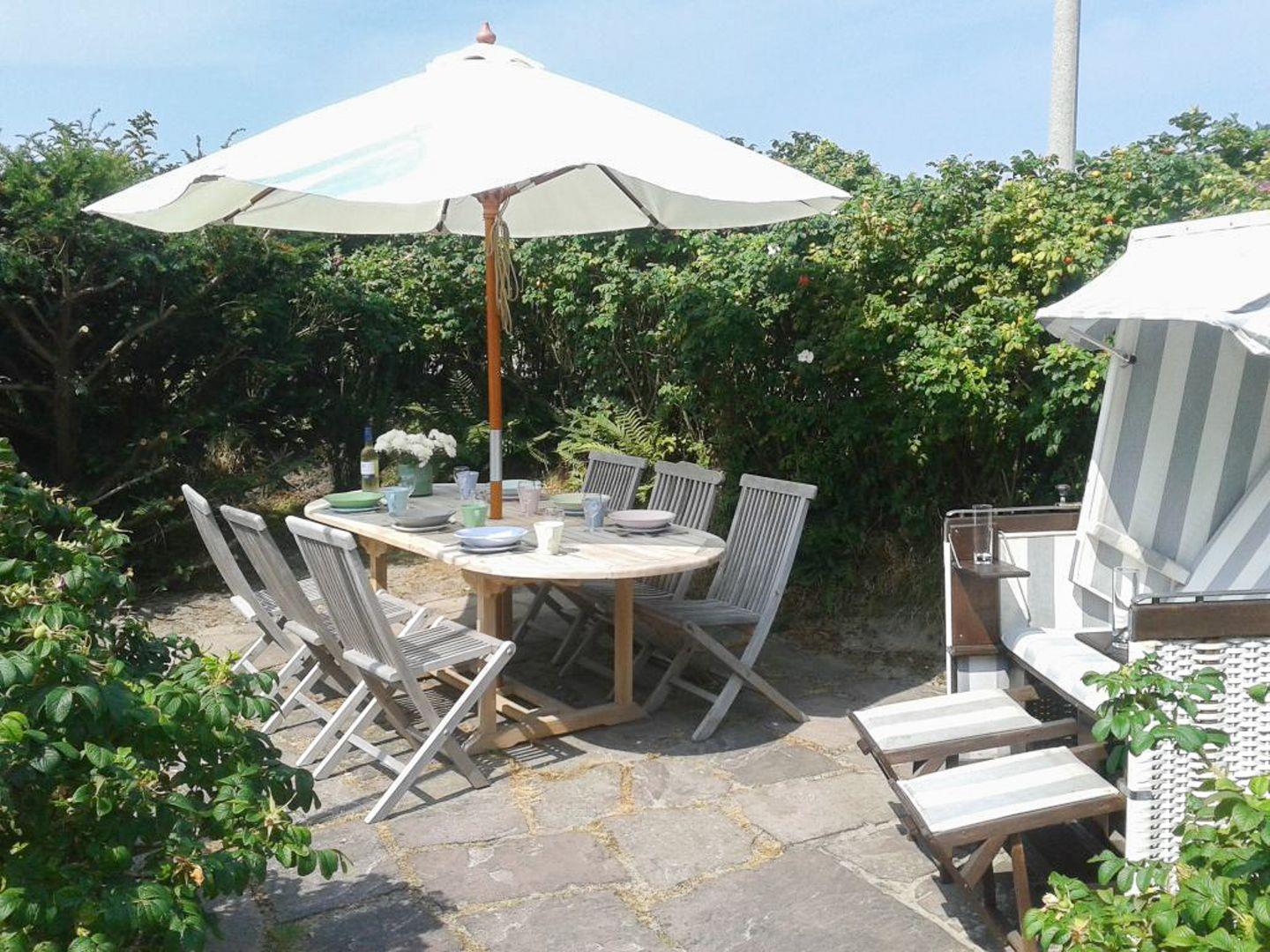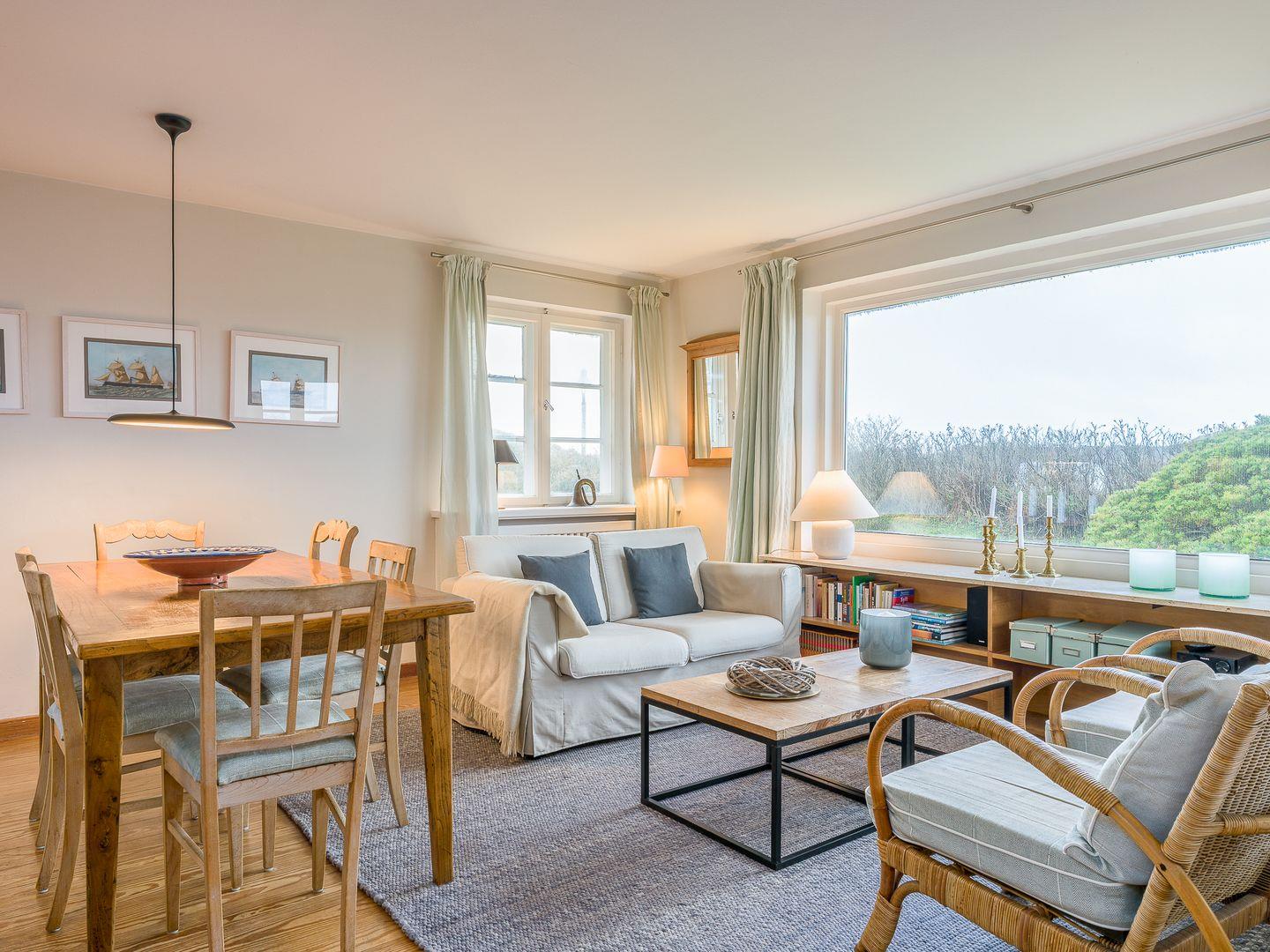 Das Hausteil liegt inmitten eines idyllischen Gartens mit Sitzecke und Strandkorb. Im Erdgeschoss des Hauses befindet sich der großzügig geschnittene Wohn-/Essbereich mit seinen alten Holzdielen und einem Panoramafenster, das Blick bis zu den Dünen gewährt. Ein antiker Kaminofen sorgt für wohlige Wärme und der große Esstisch lädt zu gemütlichen Abenden ein.