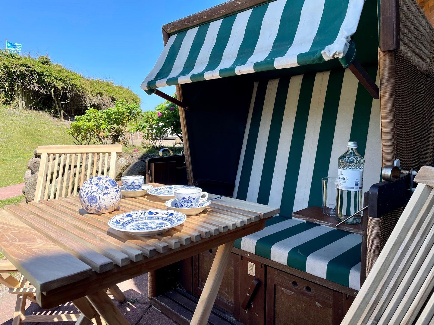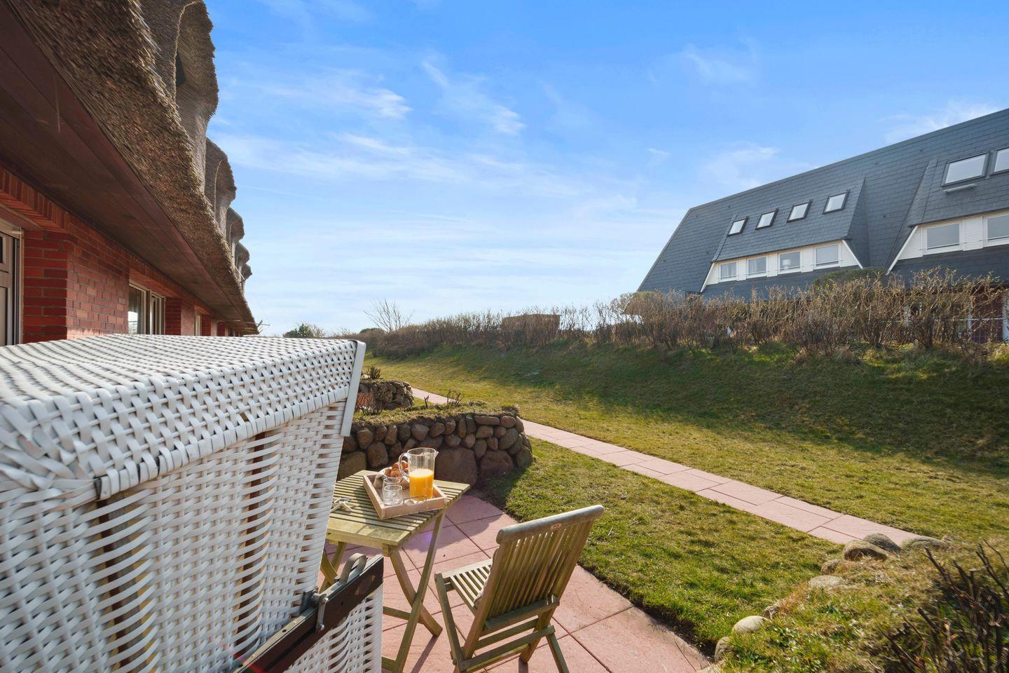 Die offen gestaltete Küchenzeile fügt sich harmonisch in den Wohnbereich ein und überzeugt mit einer modernen, umfangreichen Ausstattung, die Selbstversorgern alles bietet, was sie im Urlaub benötigen: Herd, Backofen, Mikrowelle, Kühlschrank mit Gefrierfach, Spülmaschine, Kaffeevollautomat, Wasserkocher, Toaster sowie Geschirr, Besteck und Küchenutensilien. Hier wurde an alles gedacht, um das Kochen angenehm und unkompliziert zu gestalten. Vom Wohnraum aus gelangen Sie direkt auf die Terrasse, die das Appartement in den warmen Monaten optimal erweitert. Ausgestattet mit Gartenmöbeln, Tisch, passenden Stühlen und einem gemütlichen Strandkorb, ist dieser Außenbereich ein wunderschöner Ort, um sonnige Stunden zu genießen, zu frühstücken oder abends bei frischer Meeresluft zu entspannen. Dank des seitlichen Meerblicks und des traditionellen Friesenwalls bietet die Terrasse echtes Sylt-Flair im privaten Rahmen. Das separate, hell geflieste Badezimmer ist modern ausgestattet und bietet mit einer Dusche mit Glasabtrennung, einem großen Waschtisch, Kosmetikspiegel, fest installiertem Föhn sowie warmem Wasser und praktischen Ablagemöglichkeiten einen komfortablen Start in den Tag. Für zusätzlichen Komfort stehen Ihnen im Appartement auch Waschmaschine, Trockner, Staubsauger, Verdunkelungsmöglichkeiten, ein Kleiderschrank, WLAN sowie ein Feuermelder zur Verfügung.